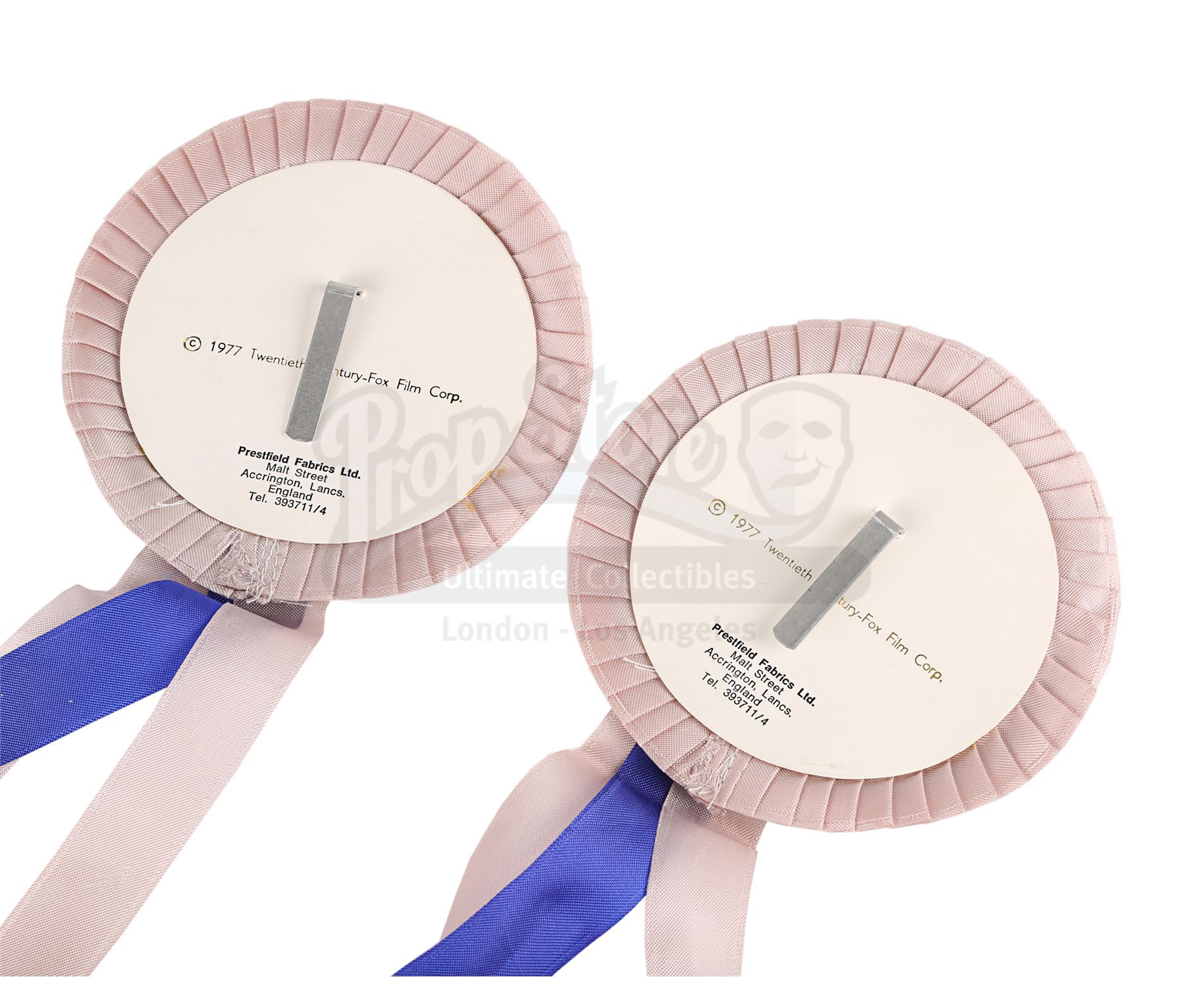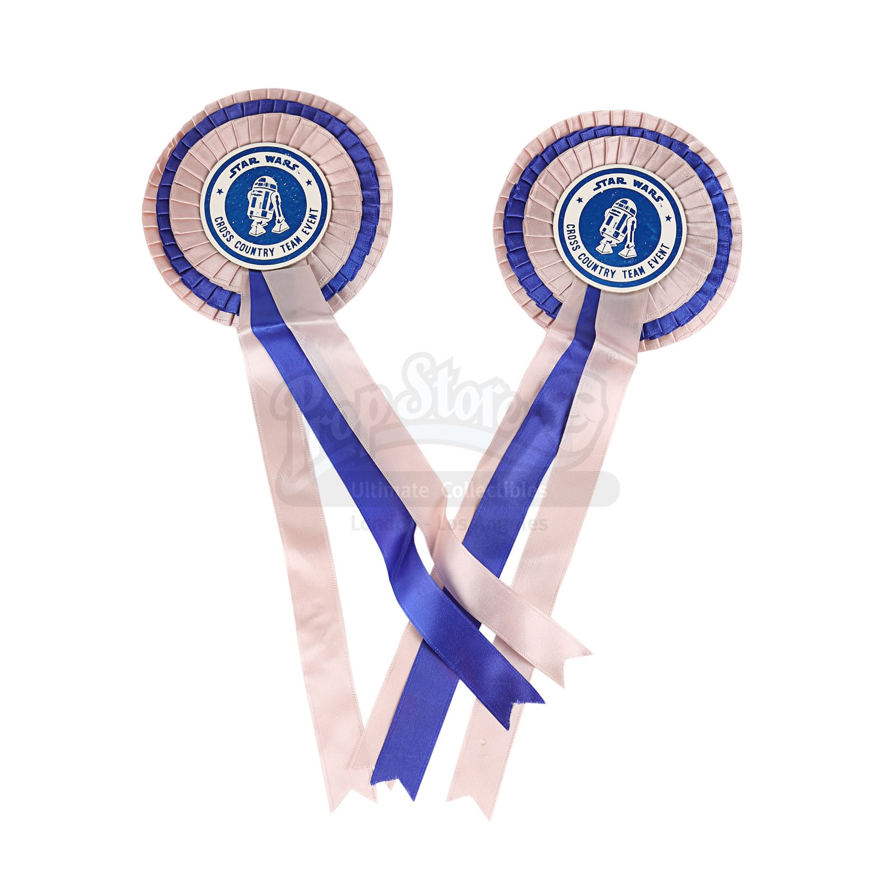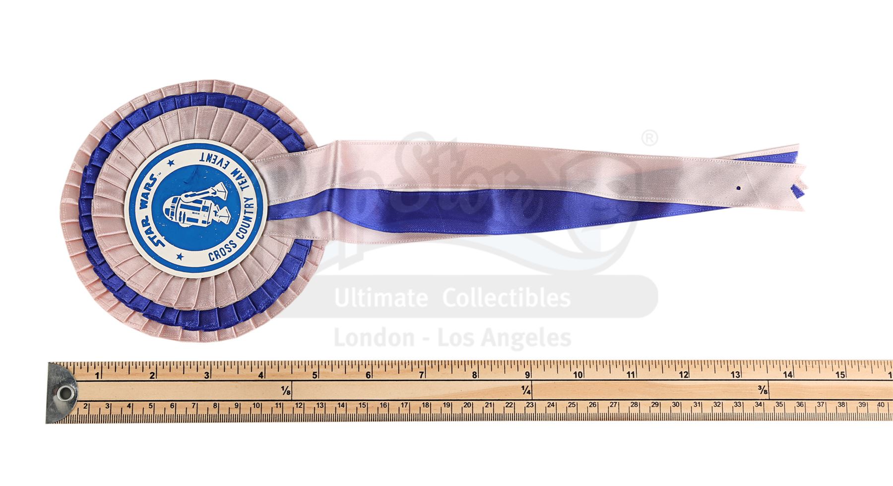 This lot will be auctioned on Thursday, July 1st. The auction will begin at 9:00am PDT and lots are sold sequentially via live auctioneer; tune in to the live streaming broadcast on auction day to follow the pace. Note other lots in the auction may close on June 29th or June 30th. A set of two rosettes from the promotion of Irvin Kershner's Star Wars: The Empire Strikes Back. These rosettes were used for the Everdon Cross Country Team Event on October 15, 1978. This lot comes from the production's property dressing supervisor Joe Dipple's collection. Each rosette consists of a gray and blue ribbon, with a metallic blue-and-white cardboard medallion featuring R2-D2 and the words "Star Wars Cross Country Team Event." They remain in good overall condition, with fraying present on the ribbon and wear to the metallic finish. Dimensions: (each) 15" x 5.25" x 0.25" (38 cm x 13 cm x 0.5 cm) Estimate: $1,200 - 1,800