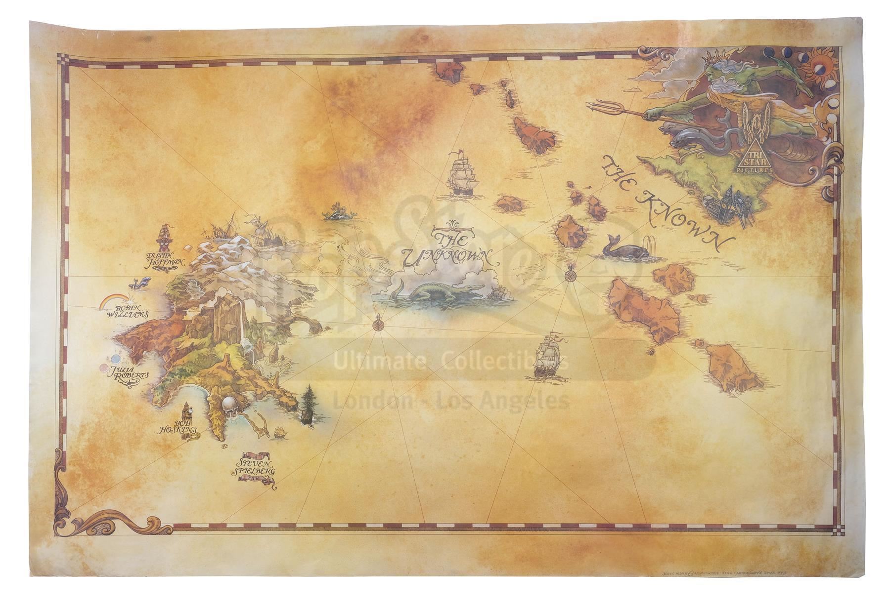This lot will be auctioned on Tuesday, June 29th. The auction will begin at 9:00am PDT and lots are sold sequentially via live auctioneer; tune in to the live streaming broadcast on auction day to follow the pace. Note other lots in the auction may close on June 30th or July 1st. A teaser trailer burn-effect map from the promotion of Steven Spielberg's fantasy adventure film Hook. This prop map was printed from an illustration by renowned poster artist John Alvin specifically for the trailer gag in which it was set aflame. The map showcased key cast and locations in the film which the camera panned over to give an exciting glimpse of what was to come. A number of prop maps were printed for the trailer's production, as the shot of the map burning had to be done many times to get an optimal look. This unburned example was printed from Alvin's artwork onto specialized, parchment-like paper. The paper was then treated to appear aged and distressed. This map comes from a member of the trailer production crew and remains in good overall condition with various signs of production use, including creases from storage. Dimensions: 30" x 40" (76.25 cm x 101.75 cm) Estimate: $3,000 - 5,000