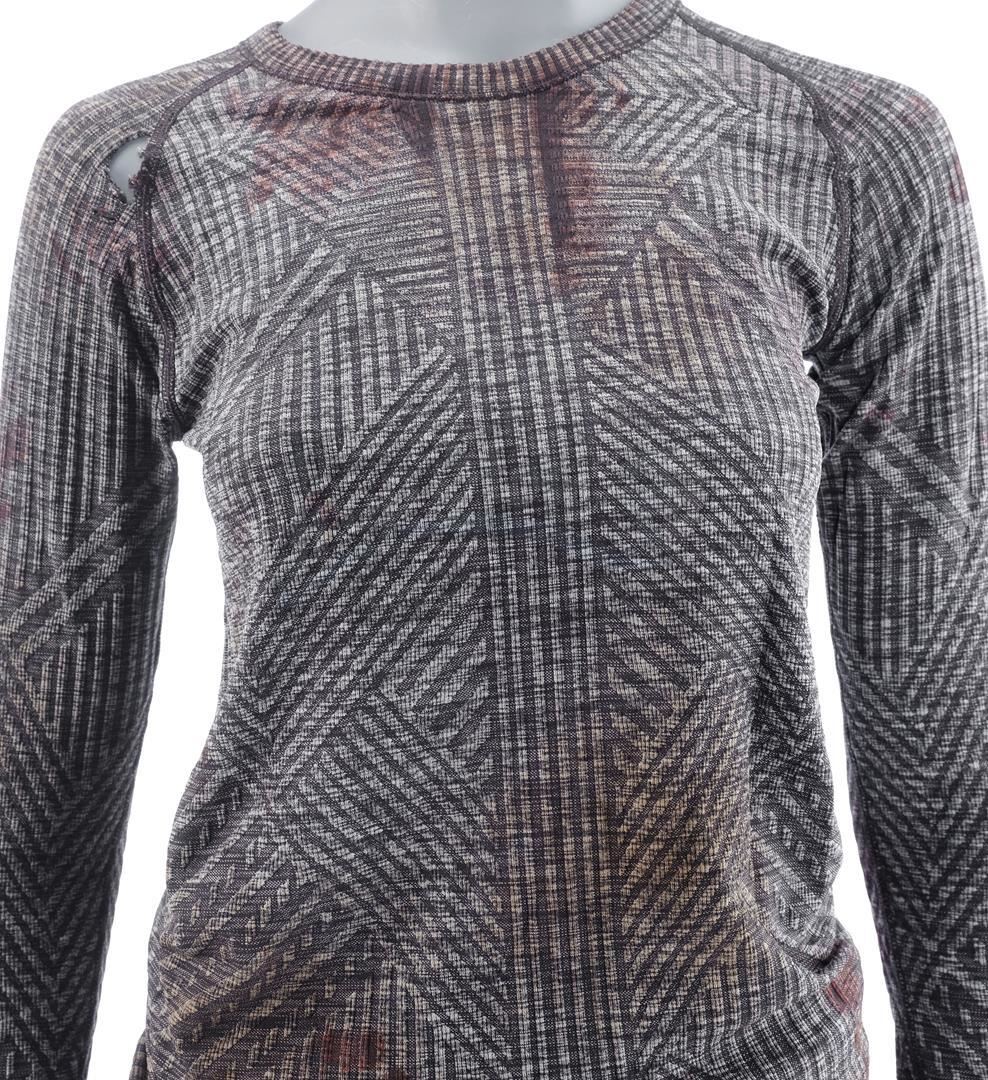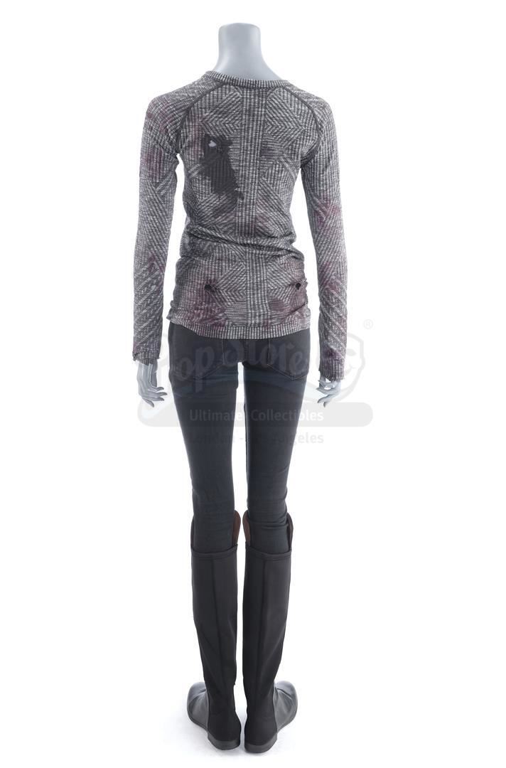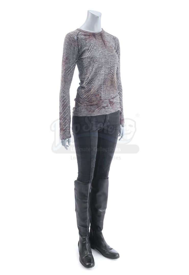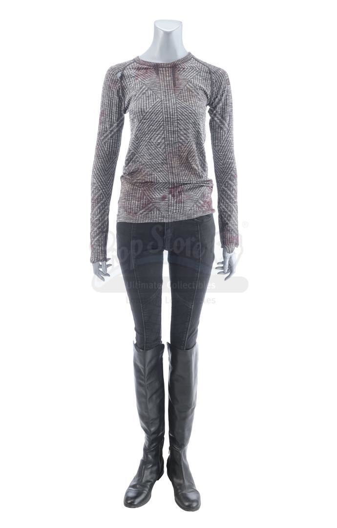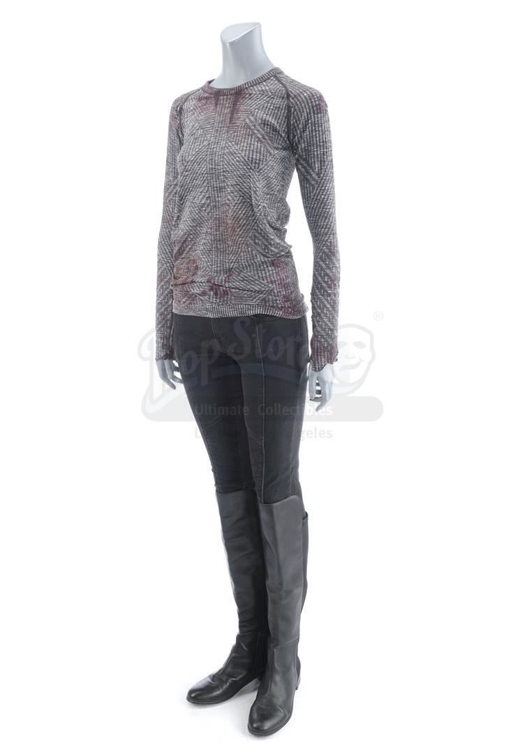 Bobbi 'Mockingbird' Morse's bullet-riddled fight with Grant Ward costume from the episodes 'S.O.S.: Part 1' (221) and 'S.O.S.: Part 2' (222) of Marvel's Agents of S.H.I.E.L.D. In the episode, S.H.I.E.L.D. operative Morse wears her costume during a brawl with Hydra mercenary Ward, who later forces Hunter to shoot her while she's trapped. This lot consists of a bloodied gray and charcoal-colored cotton blend shirt tagged 'Morse 2nd Squib Hit', a pair of black cotton pants marked 'Large Pant - Morse', and a pair of black leather and rubber knee-high stunt boots. It is in excellent overall condition with signs of deliberate wear on all items including production made bullet holes in the shirt.