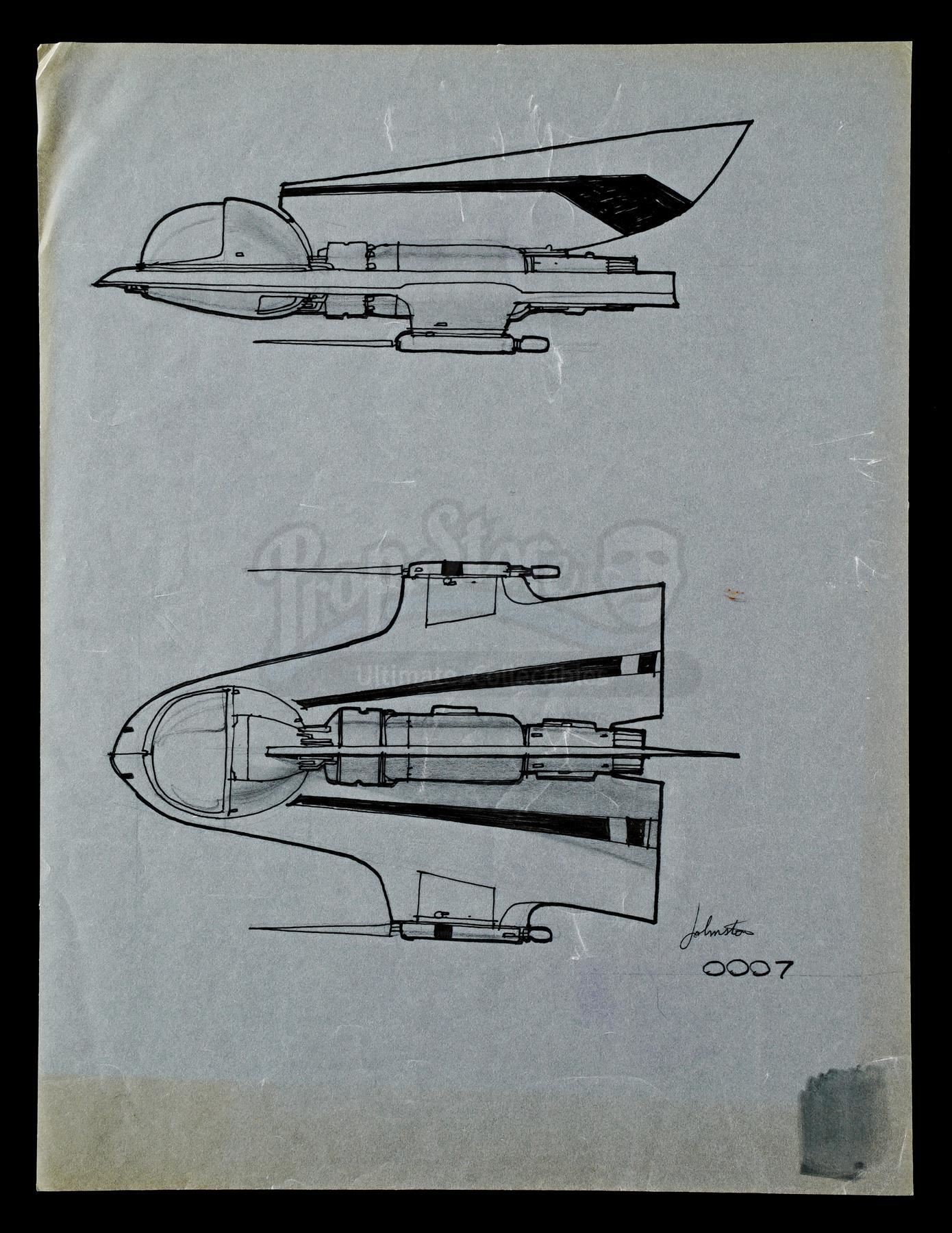 This lot will be auctioned on Thursday, July 1st. The auction will begin at 9:00am PDT and lots are sold sequentially via live auctioneer; tune in to the live streaming broadcast on auction day to follow the pace. Note other lots in the auction may close on June 29th or June 30th. Hand-drawn Joe Johnston Snowspeeder concept drawings from the production of Ivrin Kirshner's sci-fi sequel Star Wars: The Empire Strikes Back. Concept drawings were created to help design new vehicles before the production stage. Hand-drawn in mixed media on one sheet of white illustration paper, these two concept drawings for the rebel snowspeeder feature the vehicle from both overhead and profile views. It is signed on the bottom corner as "JOHNSTON 0007." It shows signs of use and wear, including some creasing and discoloration on the borders as well as a paint stain on one of the bottom corners, but remains in good overall condition. Dimensions: 13" x 11" (33 cm x 28 cm) Sold without copyright; see notice in the Buyer's Guide. Estimate: $2,000 - 3,000