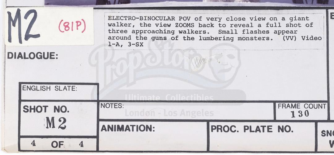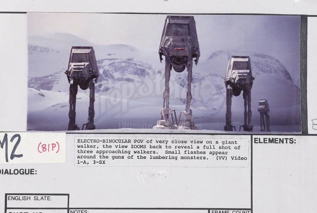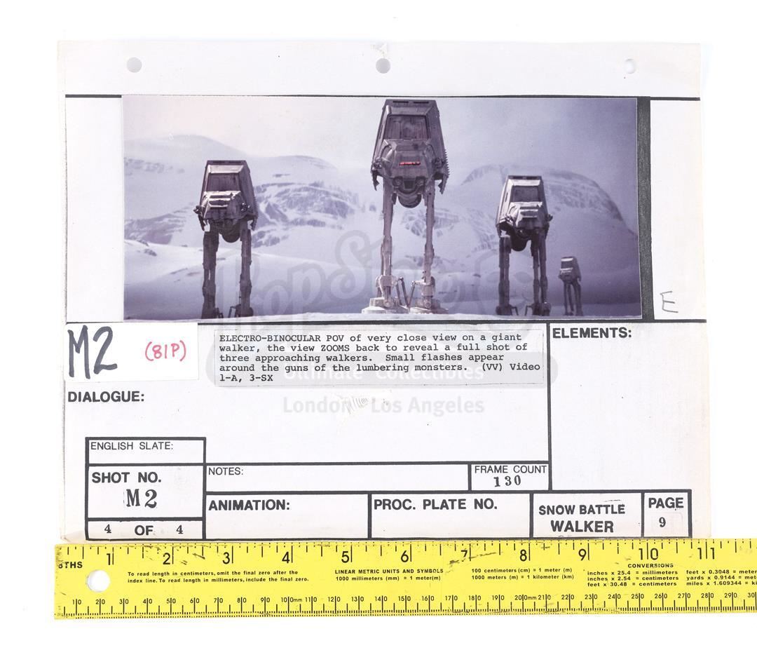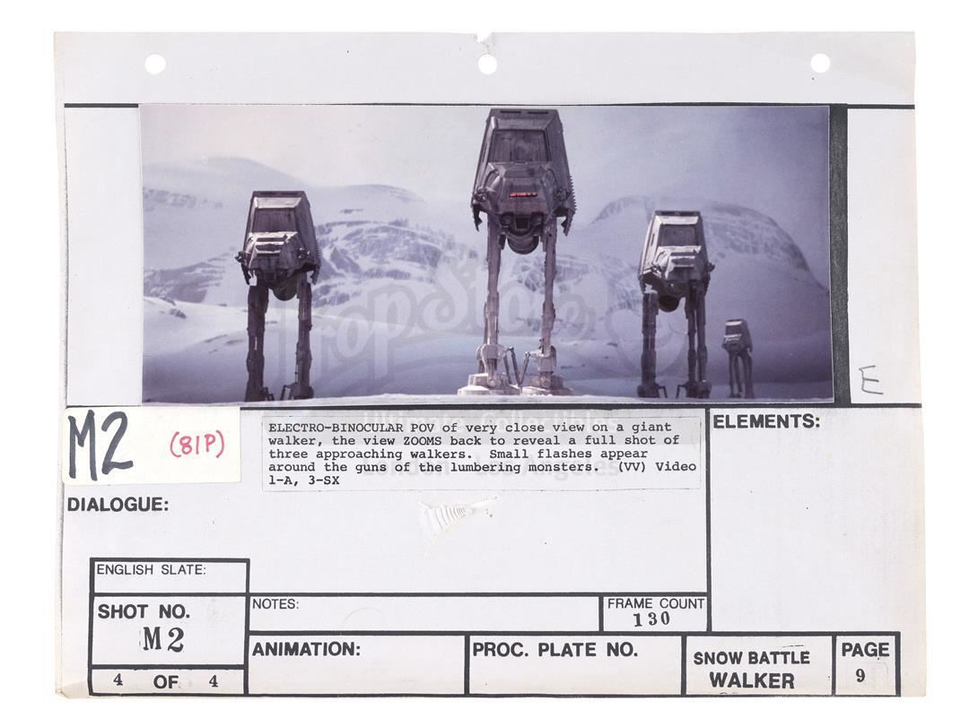 This lot will be auctioned on Thursday, July 1st. The auction will begin at 9:00am PDT and lots are sold sequentially via live auctioneer; tune in to the live streaming broadcast on auction day to follow the pace. Note other lots in the auction may close on June 29th or June 30th. A Hoth storyboard with a shot completion sheet attached from Irvin Kershner's Star Wars: The Empire Strikes Back. Once completed, photo prints of shots were pinned to their respective pre-production storyboards by Industrial Light & Magic (ILM) crew members. This storyboard featuring a printed binocular shot of Imperial walkers approaching Echo Base is labeled as shot number "M2" and frame count "130" with a paper description of the completed shot glued to a copy of its English slate. The lot is in good overall condition with a tear and minor creases to the paper from production. Dimensions: 8.5" x 11.25" (21.75 cm x 28.75 cm) Estimate: $1,000 - 1,500