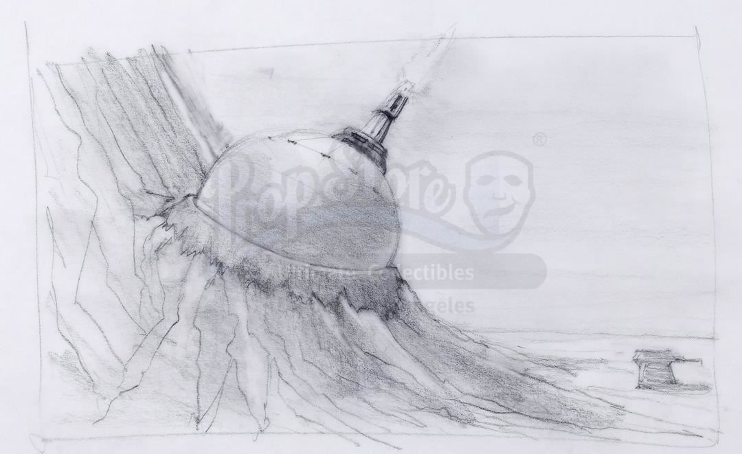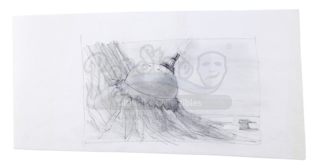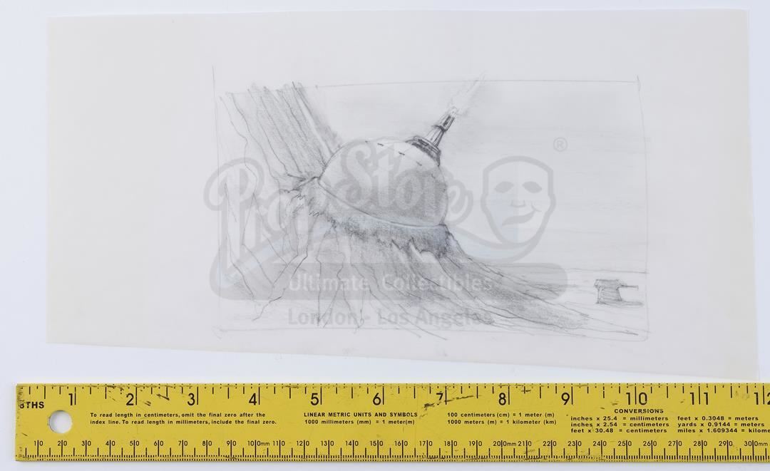 This lot will be auctioned on Thursday, July 1st. The auction will begin at 9:00am PDT and lots are sold sequentially via live auctioneer; tune in to the live streaming broadcast on auction day to follow the pace. Note other lots in the auction may close on June 29th or June 30th. A hand-drawn Paul Huston ion cannon concept sketch from the production of Irvin Kershner's Star Wars: The Empire Strikes Back. The Rebel Alliance used ion cannons to protect Echo Base during the Battle of Hoth. This concept sketch for an ion cannon model is rendered in graphite on lightweight drawing paper by Industrial Light & Magic (ILM) model maker Paul Huston. The illustration is in excellent overall condition with minimal edge wear from handling. Dimensions: 11.5" x 6" (29.25 cm x 15.25 cm) Sold without copyright; see notice in the Buyer's Guide. Estimate: $800 - 1,200