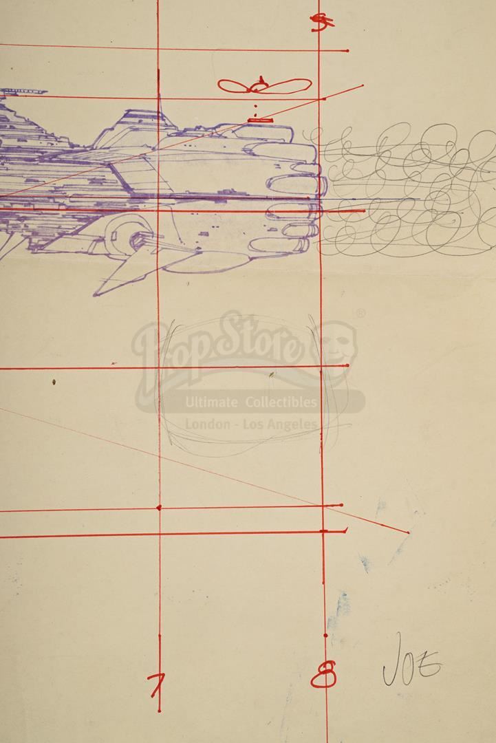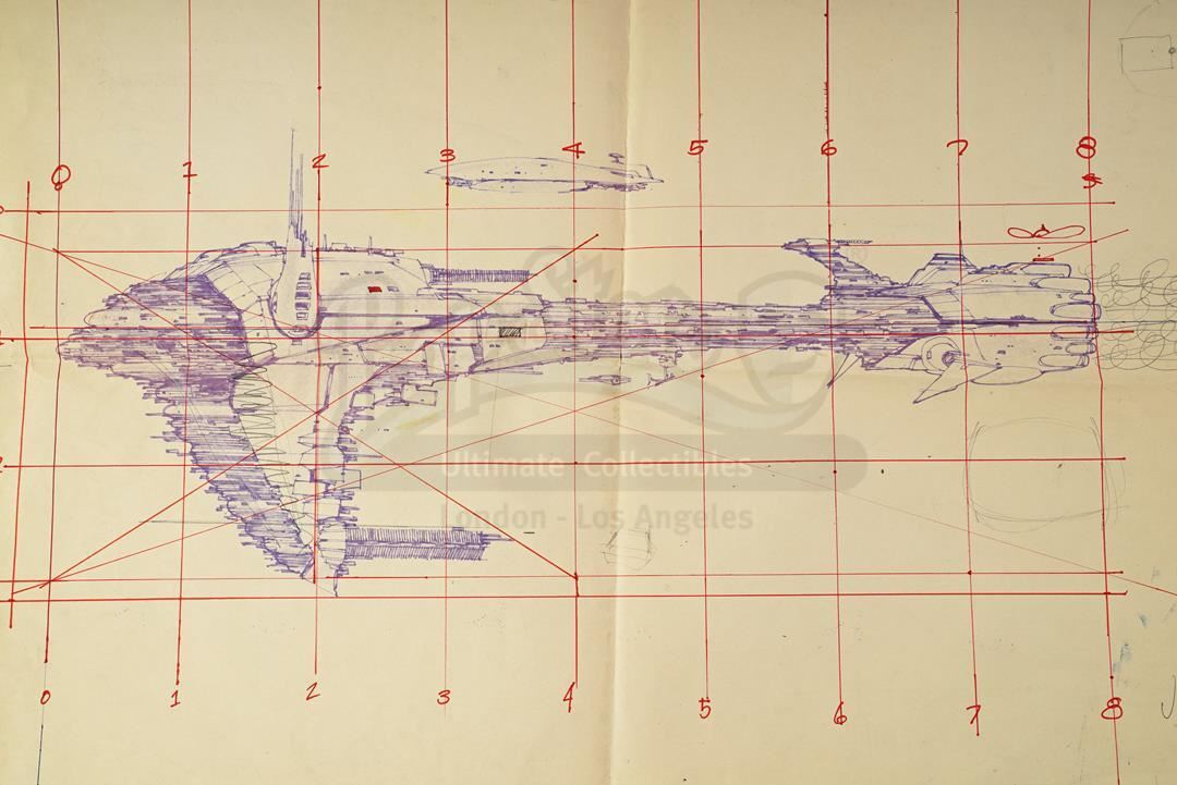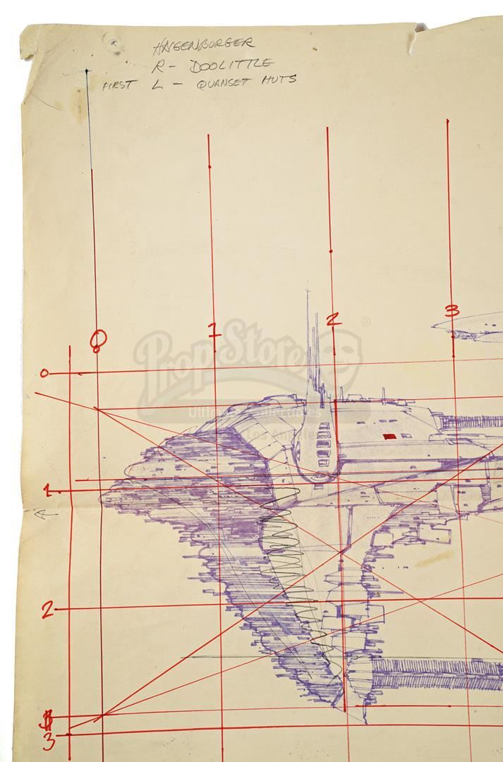 This lot will be auctioned on Thursday, July 1st. The auction will begin at 9:00am PDT and lots are sold sequentially via live auctioneer; tune in to the live streaming broadcast on auction day to follow the pace. Note other lots in the auction may close on June 29th or June 30th. A printed Nebulon-B frigate illustration from the production of Irvin Kershner's Star Wars: The Empire Strikes Back. The Nebulon-B escort frigate served as Rebel headquarters during the Galactic Civil War. Printed copies of design illustrations like this were distributed to various departments for consultation during pre-production. This illustration was originally rendered and marked "First," "R- Doolittle," and "L- Quanset [sic] Huts," in pencil, marker, and pen. The print is signed "Joe", likely referring to ILM effects artist Joe Johnston. It is in fair overall condition with some discoloration from age, creasing, folding down the middle, pinholes, scattered markings, and tearing along its edges. Dimensions: 18" x 24" (45.75 cm x 61 cm) Estimate: $400 - 600