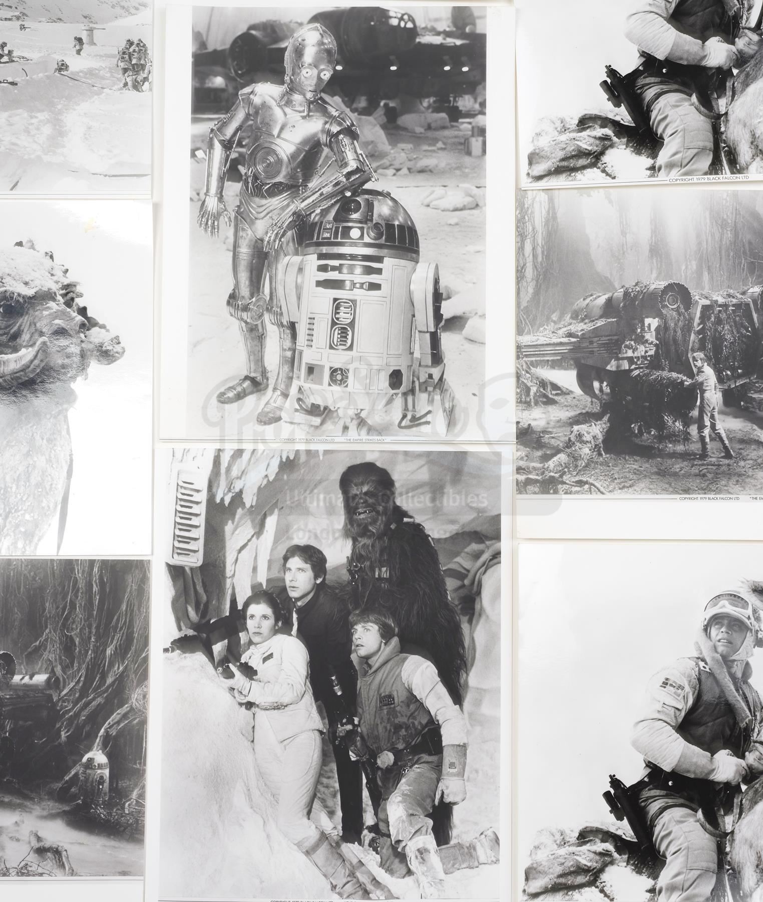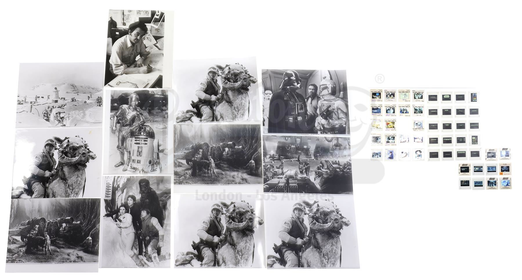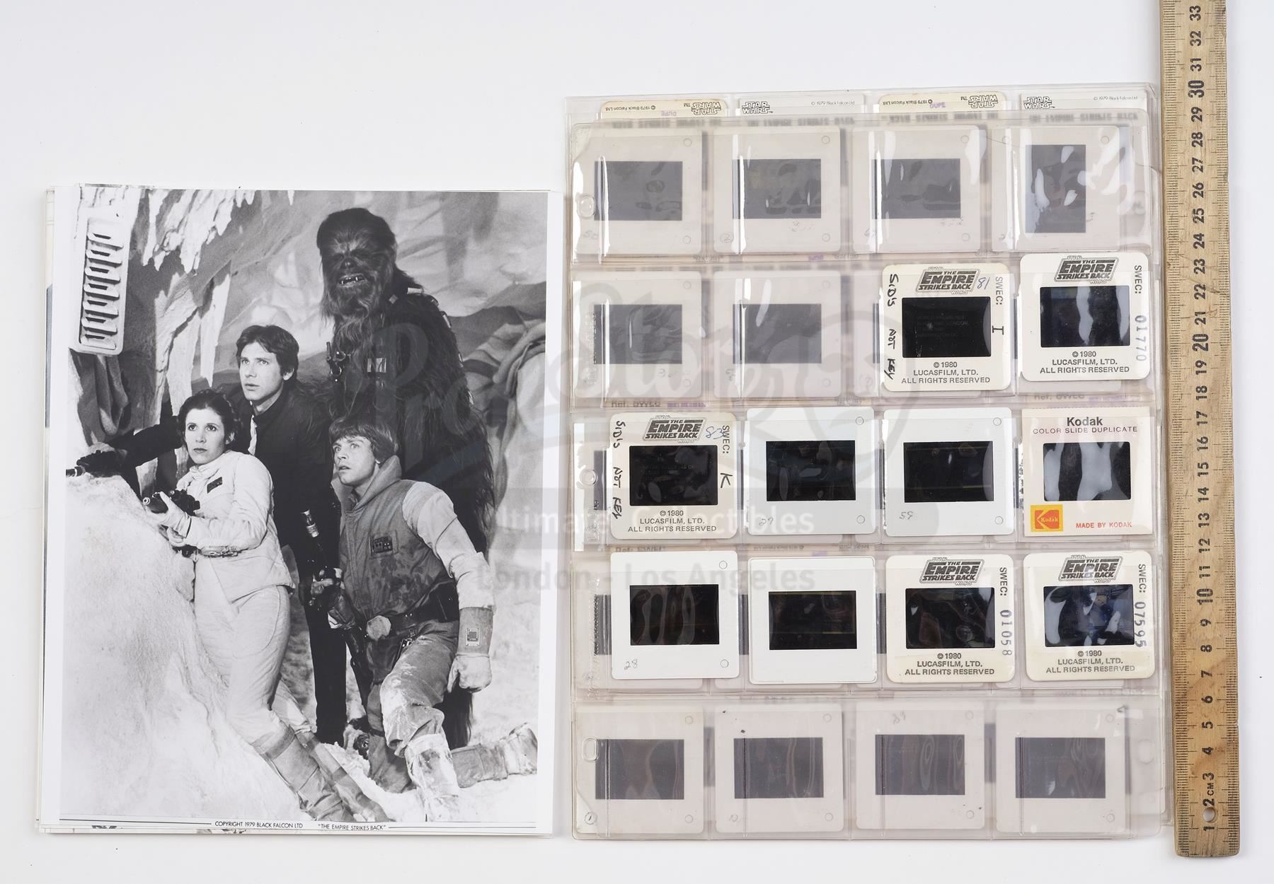 This lot will be auctioned on Thursday, July 1st. The auction will begin at 9:00am PDT and lots are sold sequentially via live auctioneer; tune in to the live streaming broadcast on auction day to follow the pace. Note other lots in the auction may close on June 29th or June 30th. A set of 35mm production slides and Black Falcon publicity photos from the promotion of Irvin Kershner's Star Wars: The Empire Strikes Back. Lucasfilm and, for a brief period between 1978-1979, its licensing division, Black Falcon Ltd., distributed still images from the production to promote the film around the world. Images marked for Black Falcon are extremely rare. This lot consists of 12 black-and-white publicity stills marked for Black Falcon Ltd. and 49 hand-marked promotional 35mm film slides. The lot is in good overall condition with some bending and edge wear throughout. Dimensions (largest): 8.5" x 11" (21.75 cm x 28 cm); (smallest): 2" x 2" (5 cm x 5 cm) Estimate: $500 - 700