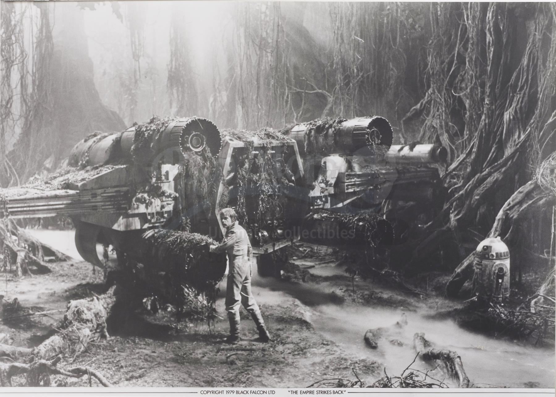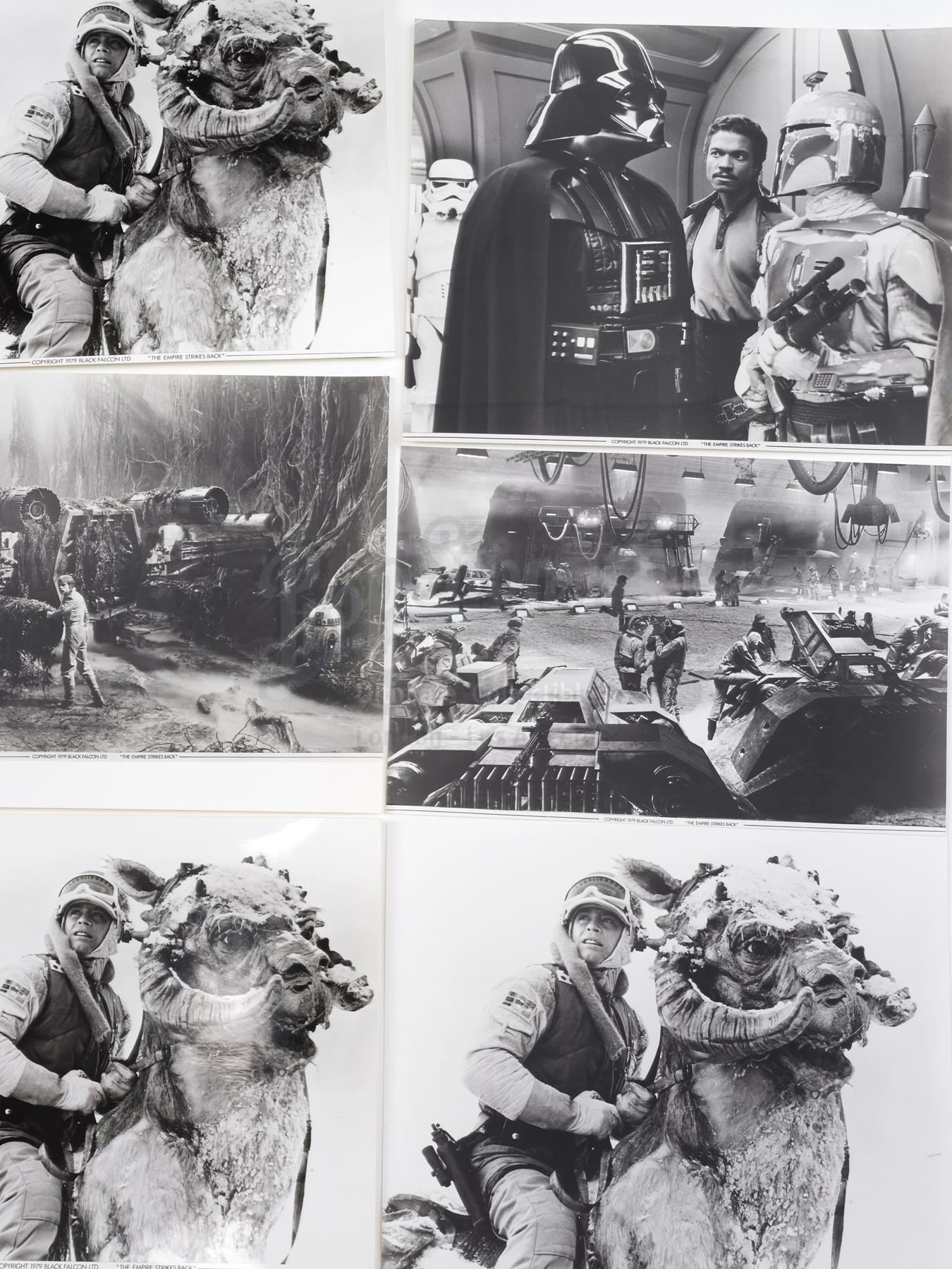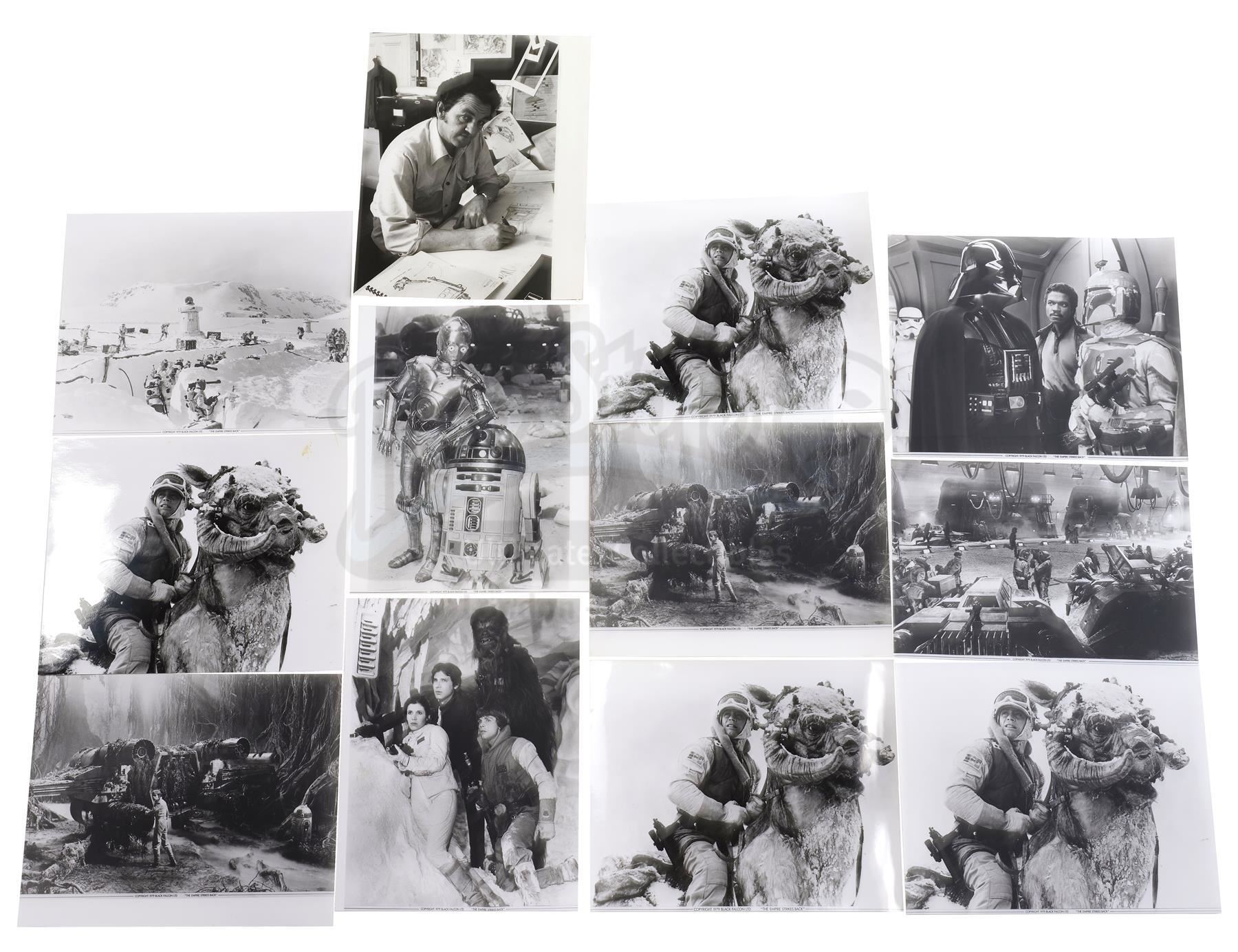 This lot will be auctioned on Thursday, July 1st. The auction will begin at 9:00am PDT and lots are sold sequentially via live auctioneer; tune in to the live streaming broadcast on auction day to follow the pace. Note other lots in the auction may close on June 29th or June 30th. A set of 35mm production slides and Black Falcon publicity photos from the promotion of Irvin Kershner's Star Wars: The Empire Strikes Back. Lucasfilm and, for a brief period between 1978-1979, its licensing division, Black Falcon Ltd., distributed still images from the production to promote the film around the world. Images marked for Black Falcon are extremely rare. This lot consists of 12 black-and-white publicity stills marked for Black Falcon Ltd. and 49 hand-marked promotional 35mm film slides. The lot is in good overall condition with some bending and edge wear throughout. Dimensions (largest): 8.5" x 11" (21.75 cm x 28 cm); (smallest): 2" x 2" (5 cm x 5 cm) Estimate: $500 - 700