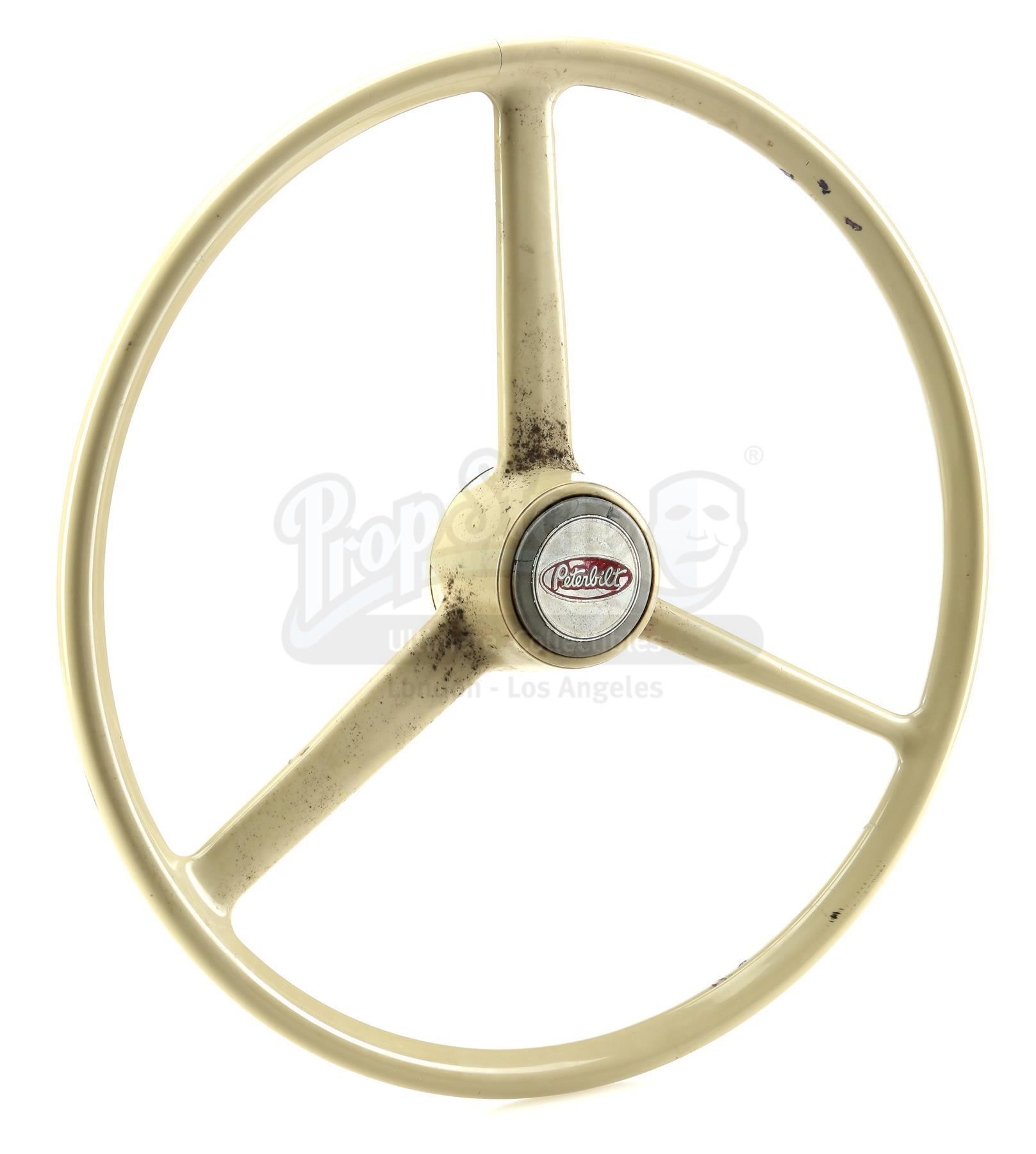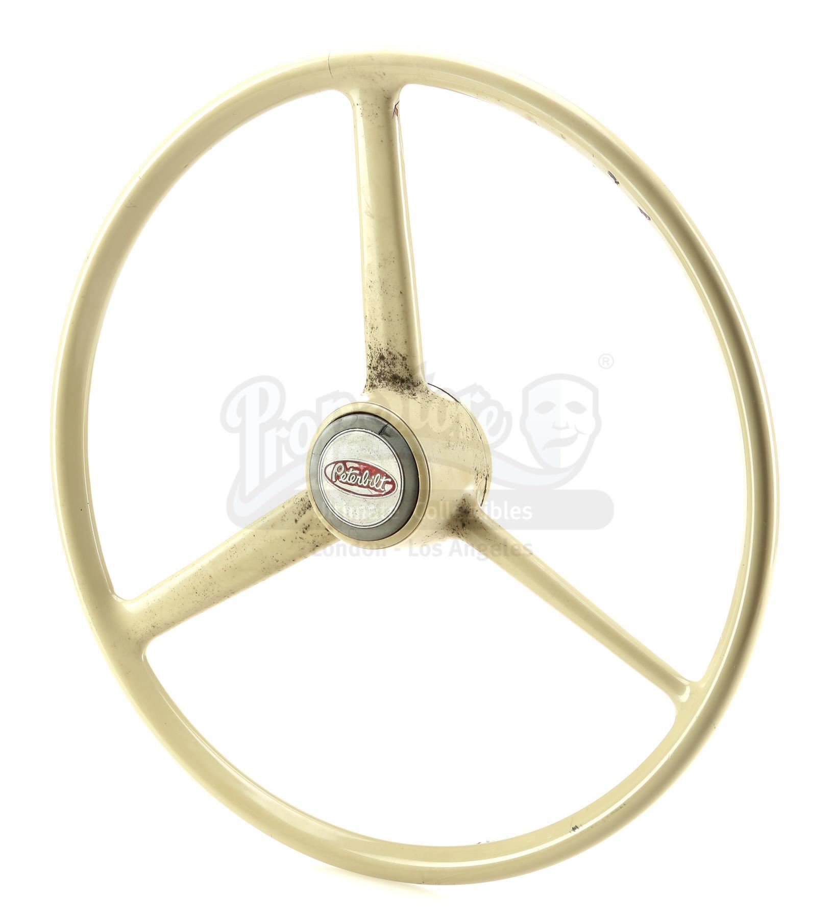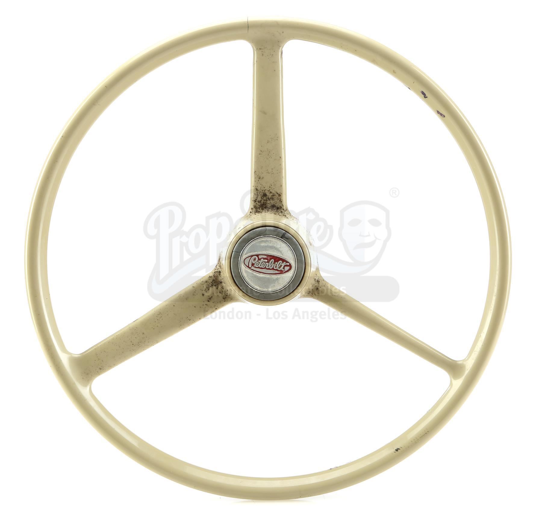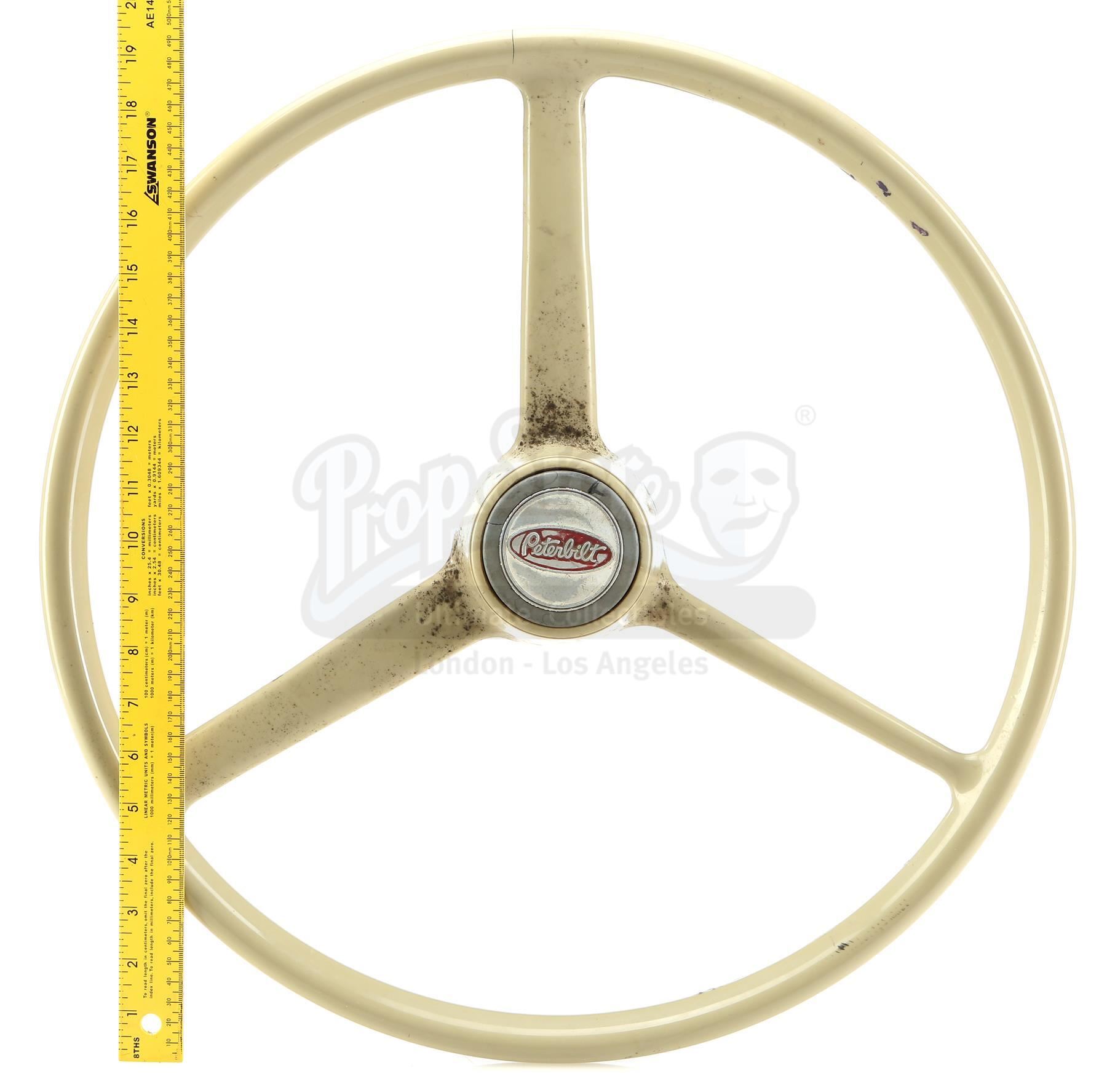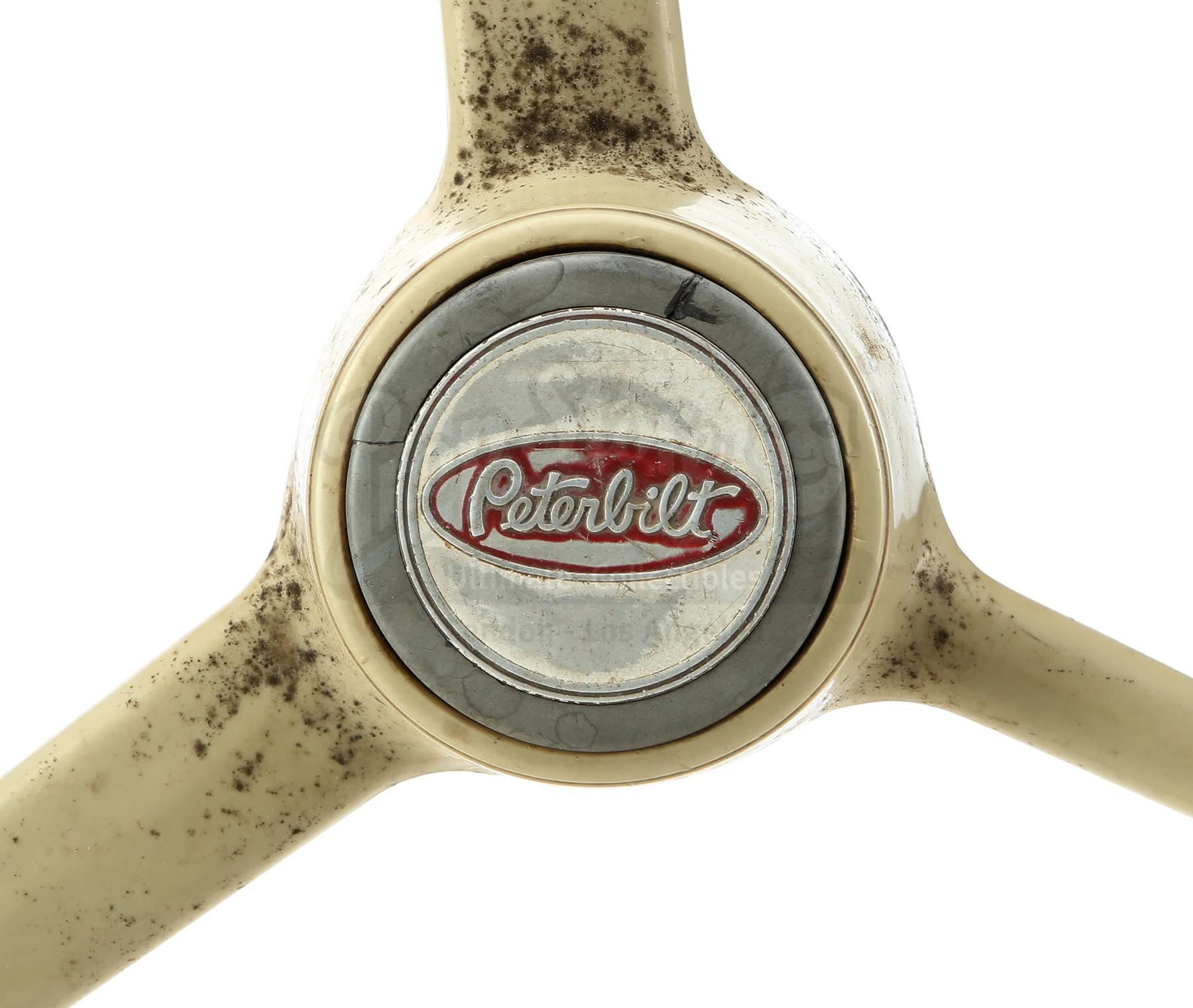 This vintage three-spoke steering wheel, seen on the truck while Joker trails the armored vehicle carrying Dent, features an ivory-color polyurethane rim and a ribbed red and chrome Peterbilt horn button at the center. It is in good overall condition with visible staining on front and some cracking to the rim. Dimensions: 20" x 20" x 3" (51 cm x 51 cm x 7.75 cm)