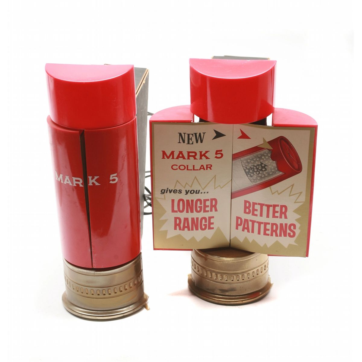 Vintage pair of Mark 5 shotshell counter displays - motorized units open to display New Mark 5 Collar gives you Longer Range/Better Patterns - both in good used condition with power cords and motors - non-ffl - 25VVFKIL106