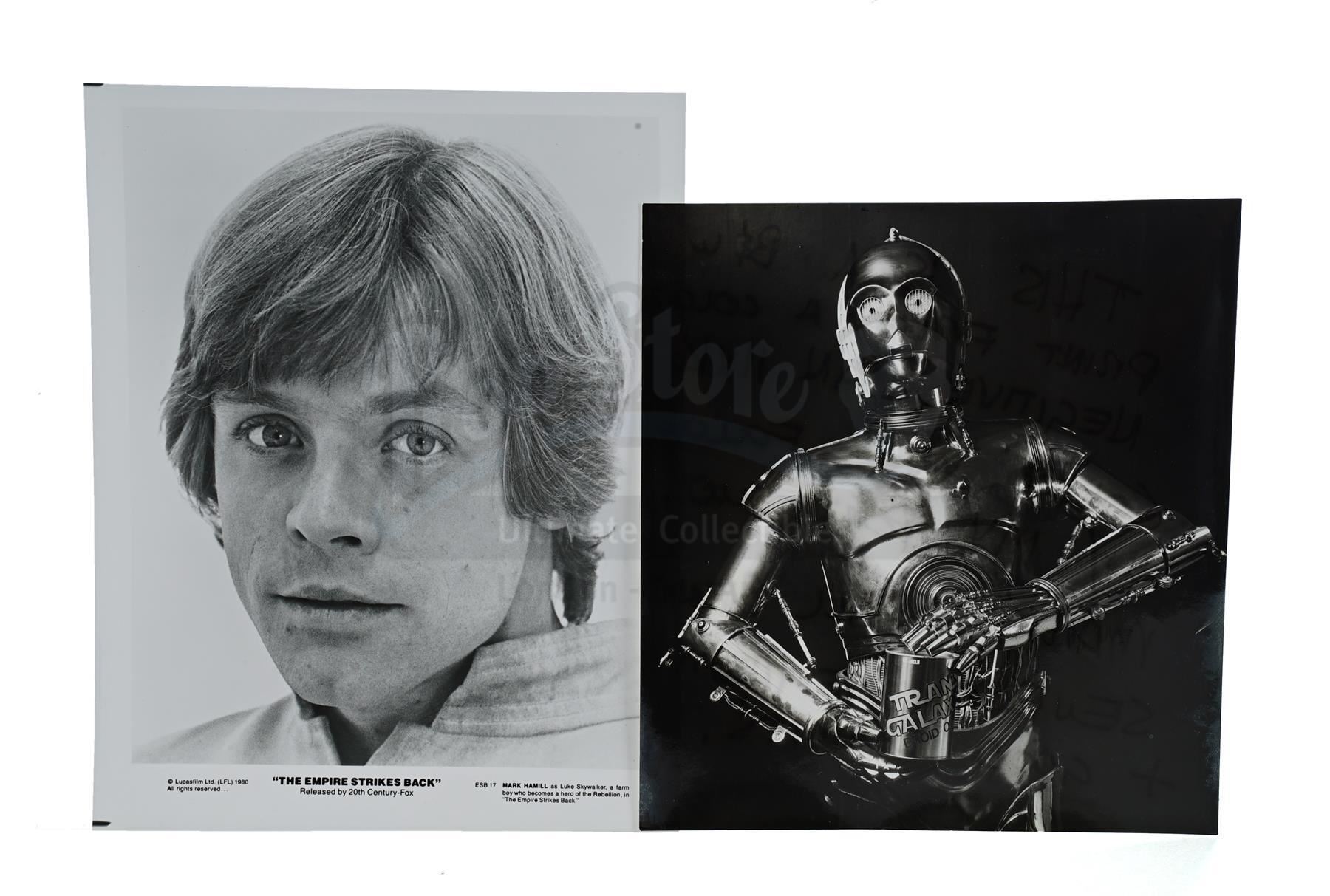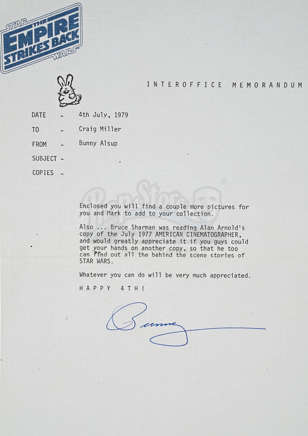 This lot will be auctioned on Thursday, July 1st. The auction will begin at 9:00am PDT and lots are sold sequentially via live auctioneer; tune in to the live streaming broadcast on auction day to follow the pace. Note other lots in the auction may close on June 29th or June 30th. "Black Falcon" publicity photos with a Bunny Alsup interoffice memo from Irvin Kershner's Star Wars: The Empire Strikes Back. Promotional material marked for Black Falcon Ltd., Lucasfilm's licensing division from 1978 - 1979, are extremely rare. This lot consists of 10 promotional stills marked "Black Falcon," 27 additional black-and-white promotional photographs labeled with brief captions, and an interoffice memo dated July 4, 1979 from producer Gary Kurtz's assistant, Bunny Alsup, to Lucasfilm's Director of Fan Relations, Craig Miller. The lot is in good overall condition with some bending and edge wear throughout. Dimensions (largest): 11" x 14" (28 cm x 35.75 cm); (smallest): 5" x 8" (12.75 cm x 20.5 cm) Estimate: $500 - 700