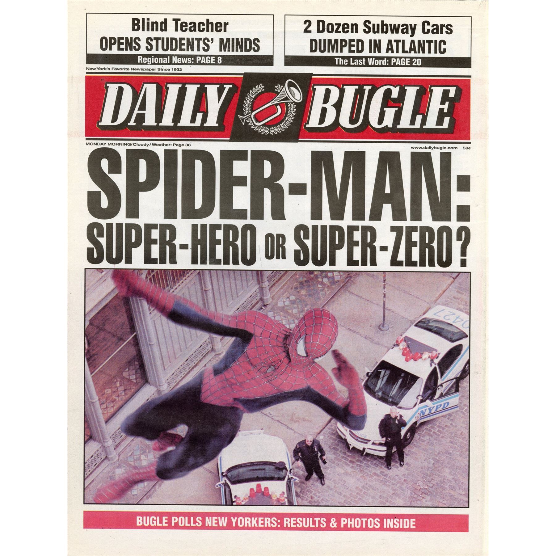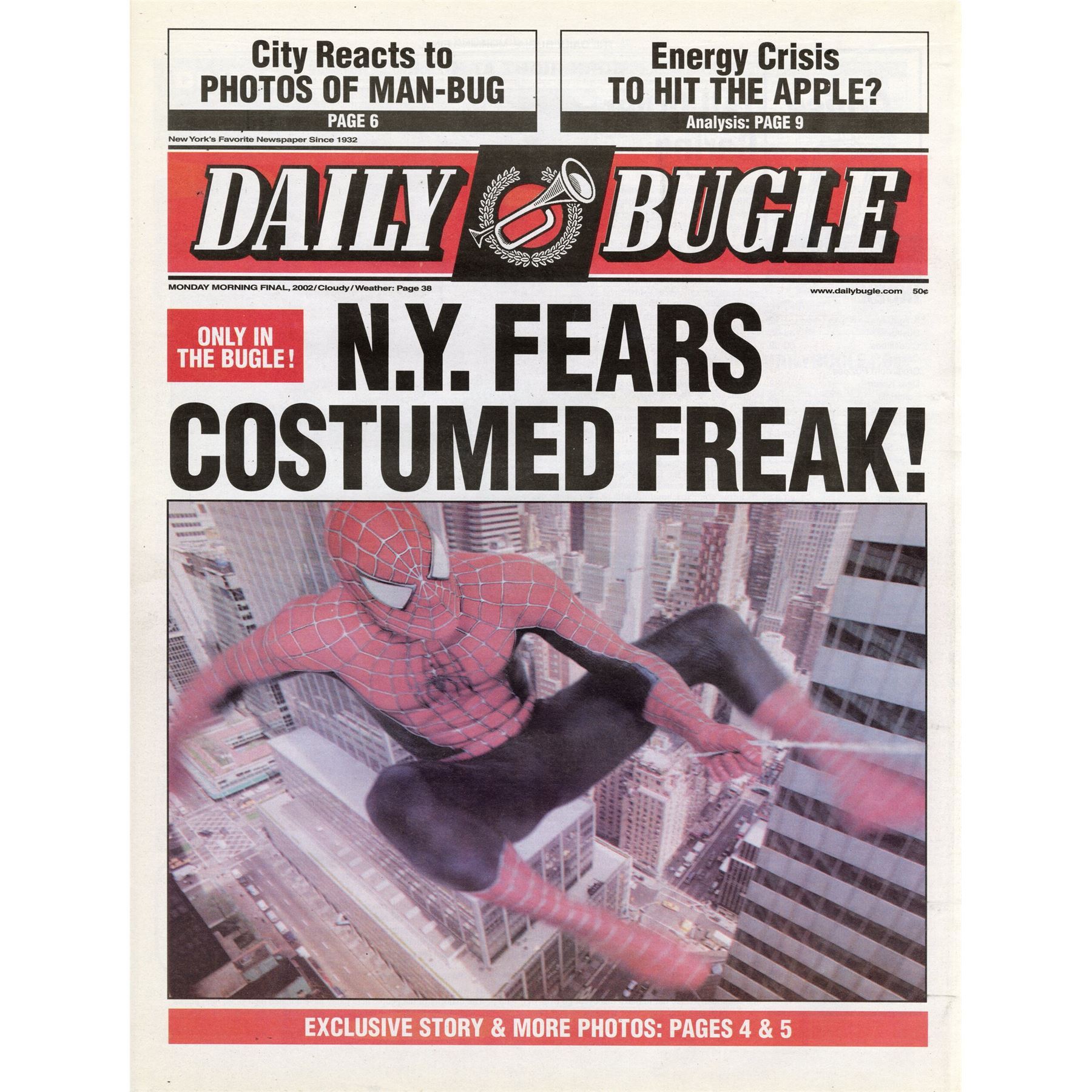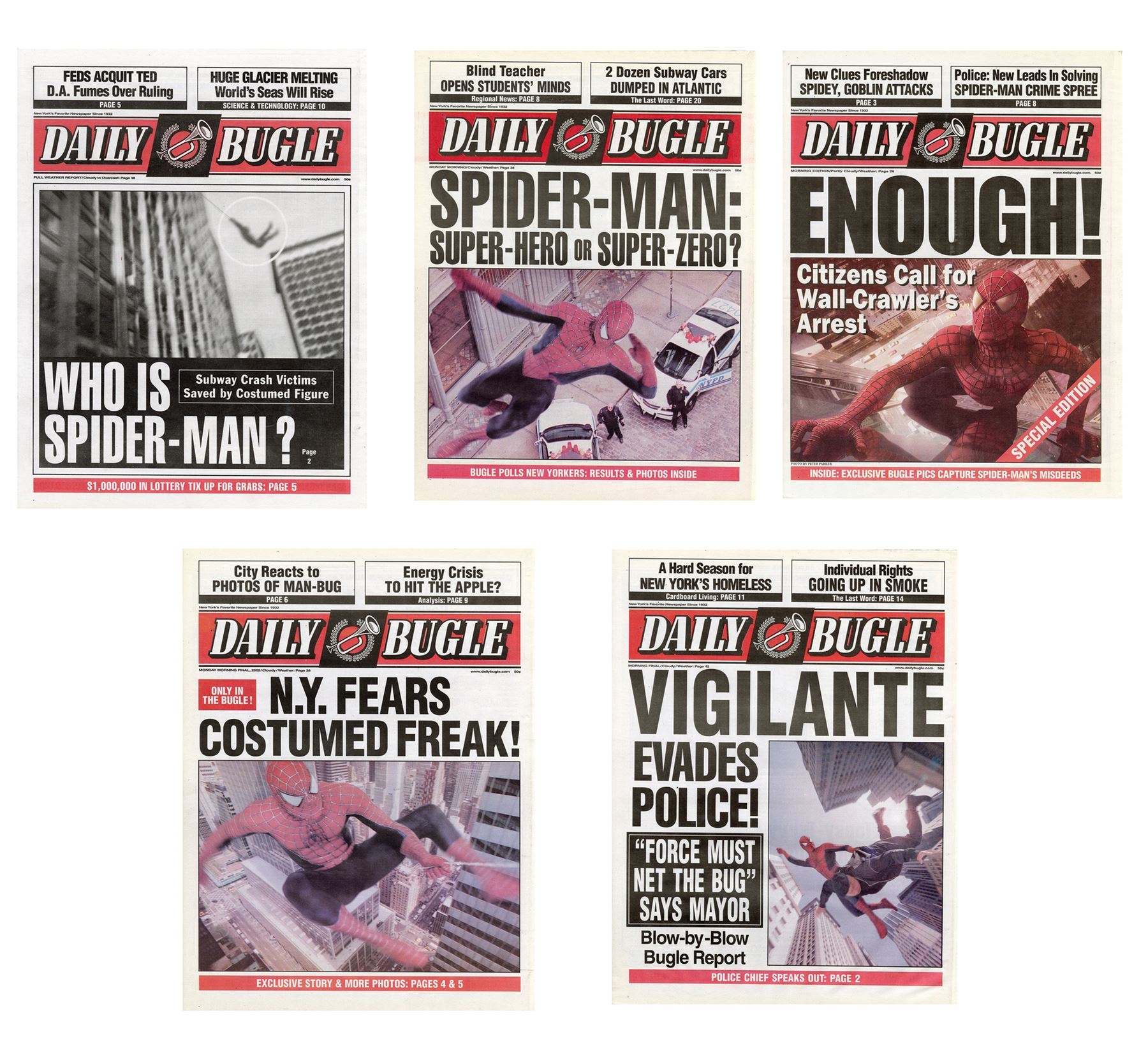 SPIDER-MAN (2002) - Set of Five Daily Bugle Newspaper Covers - Five Daily Bugle newspaper covers from Sam Raimi's superhero film Spider-Man. J. Jonah Jameson's (J.K. Simmons) Daily Bugle critiqued Spider-Man's (Tobey Maguire) every move throughout the film.