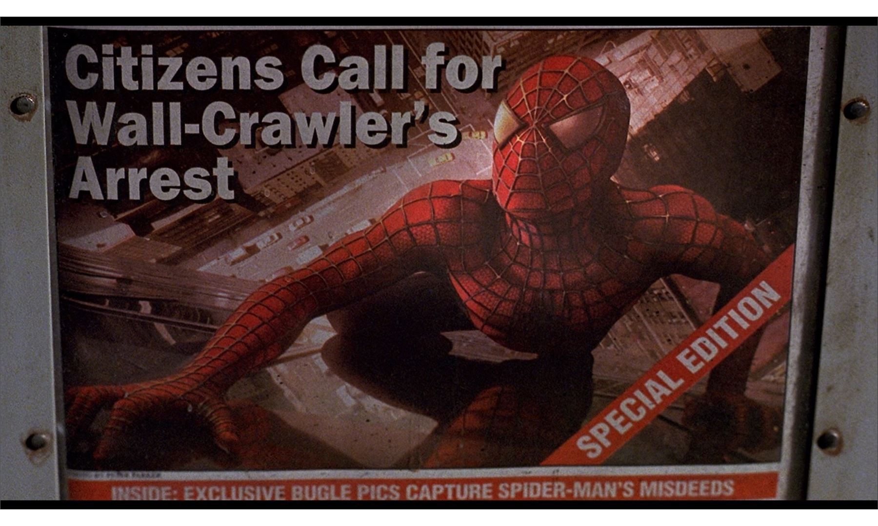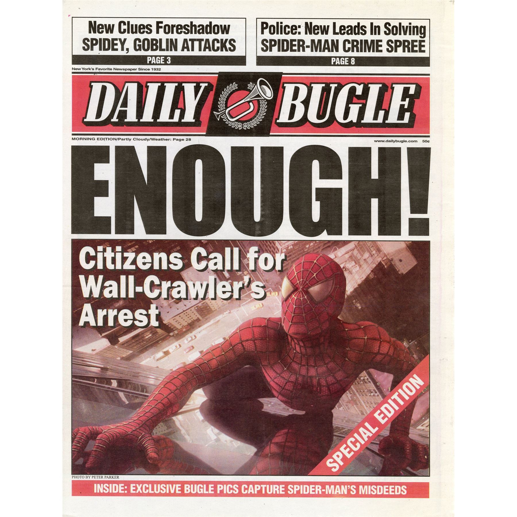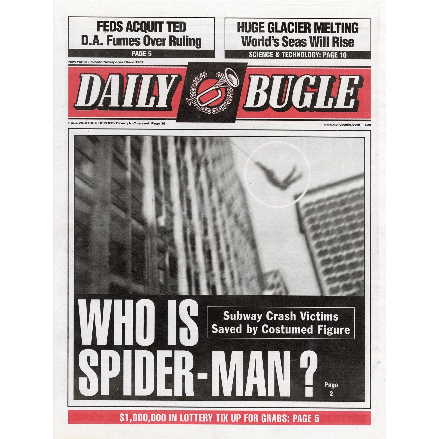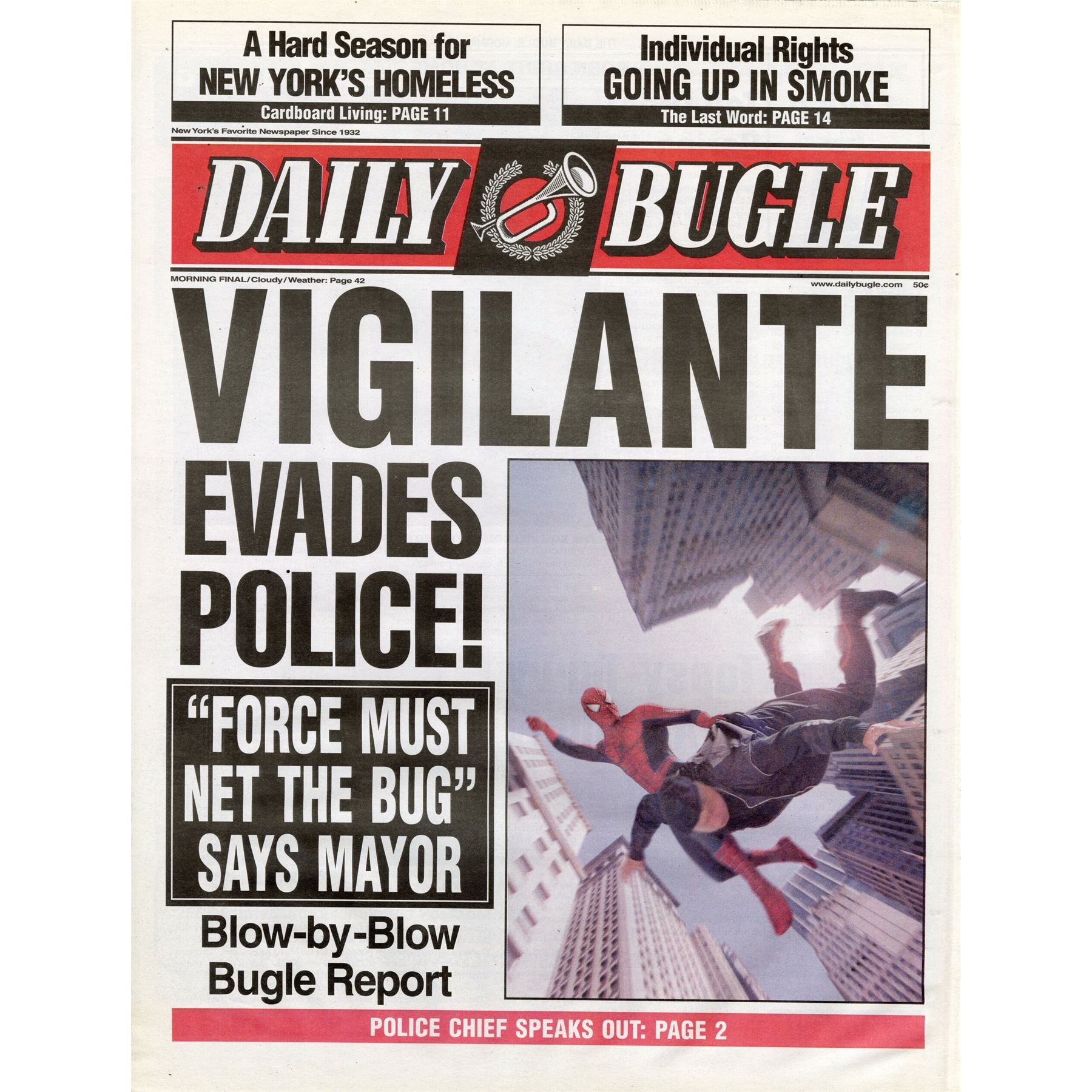 SPIDER-MAN (2002) - Set of Five Daily Bugle Newspaper Covers - Five Daily Bugle newspaper covers from Sam Raimi's superhero film Spider-Man. J. Jonah Jameson's (J.K. Simmons) Daily Bugle critiqued Spider-Man's (Tobey Maguire) every move throughout the film.