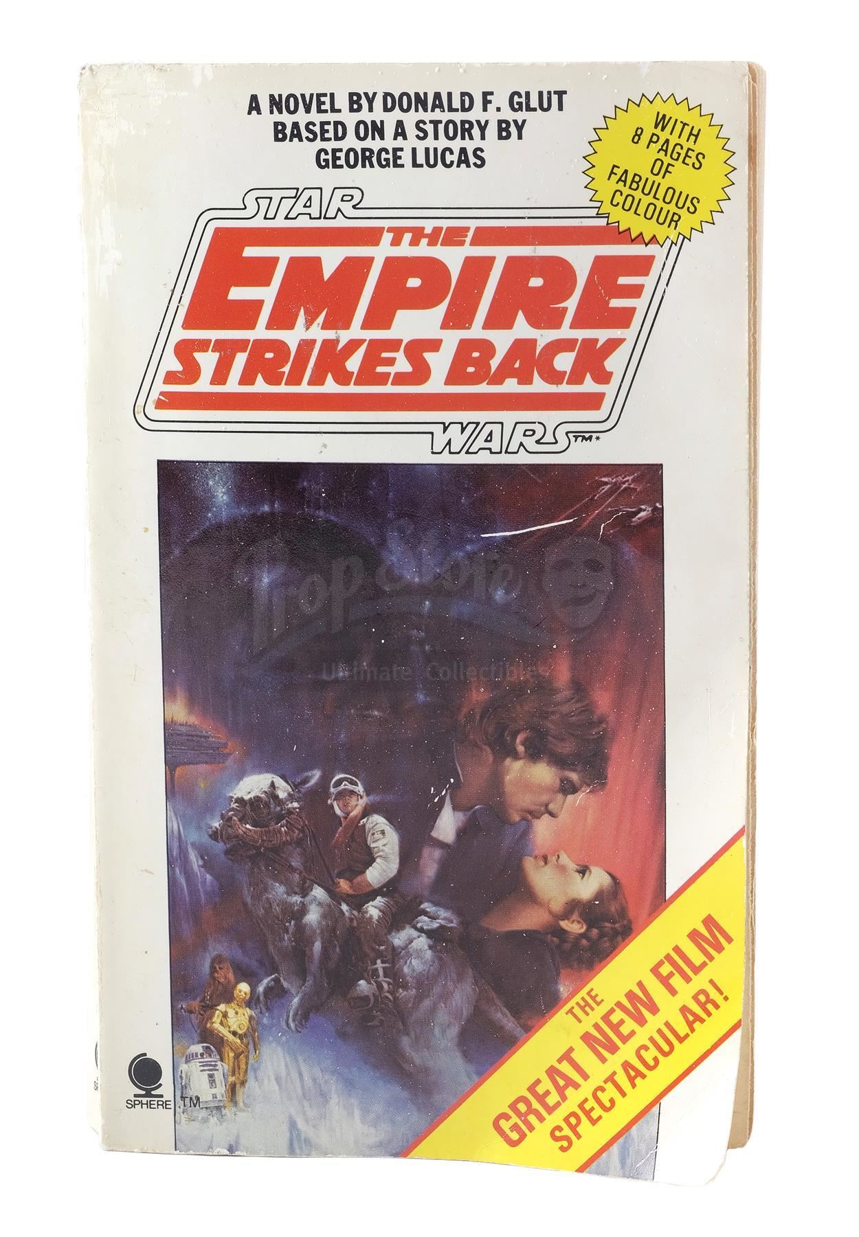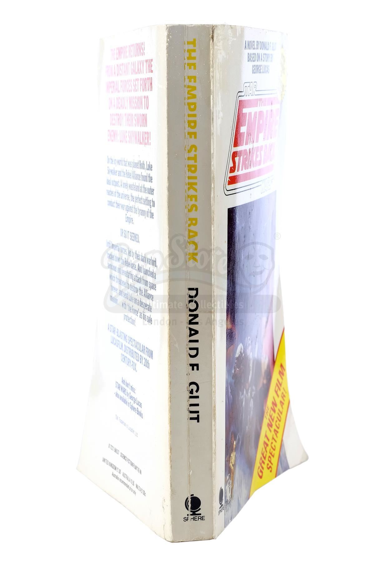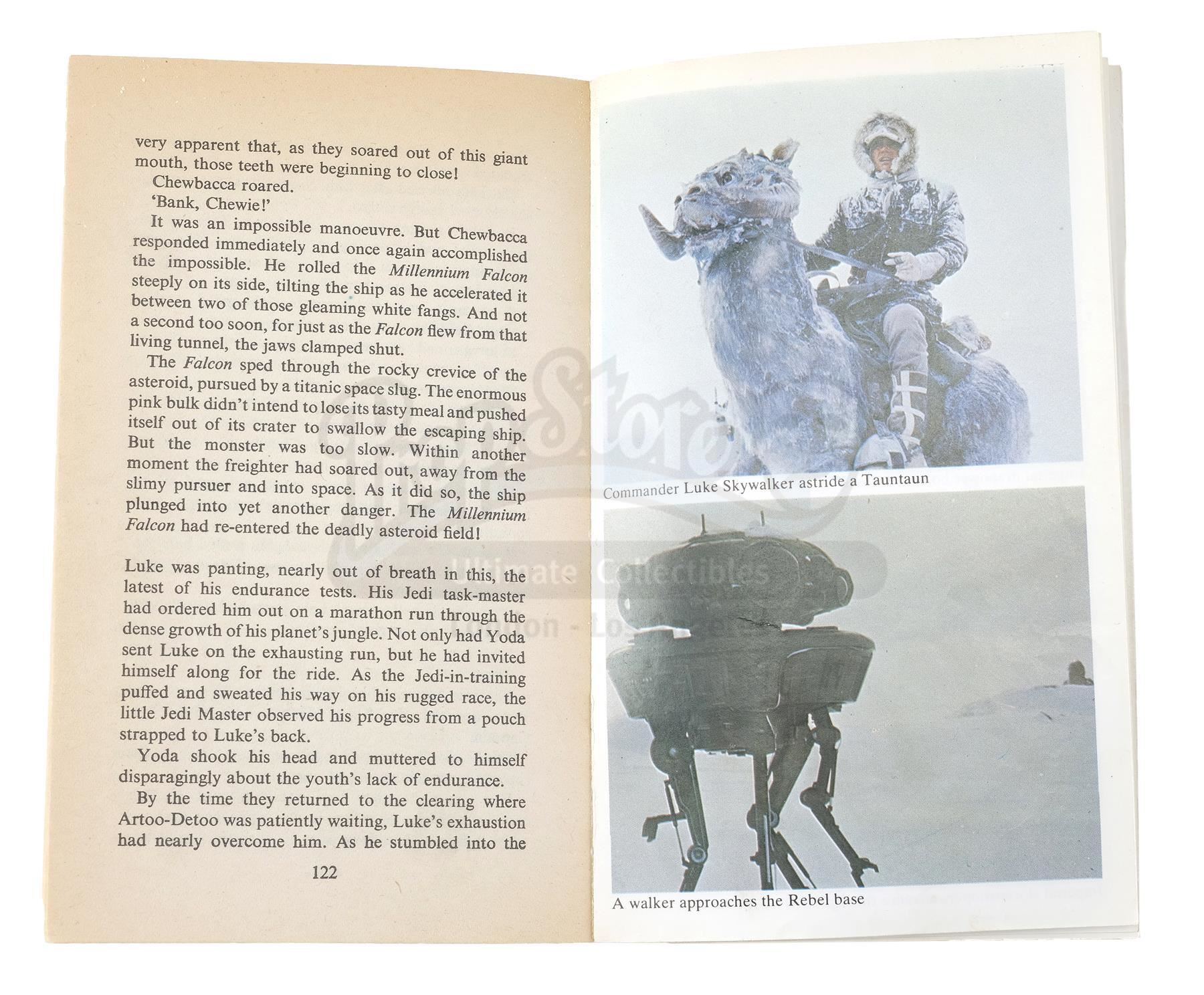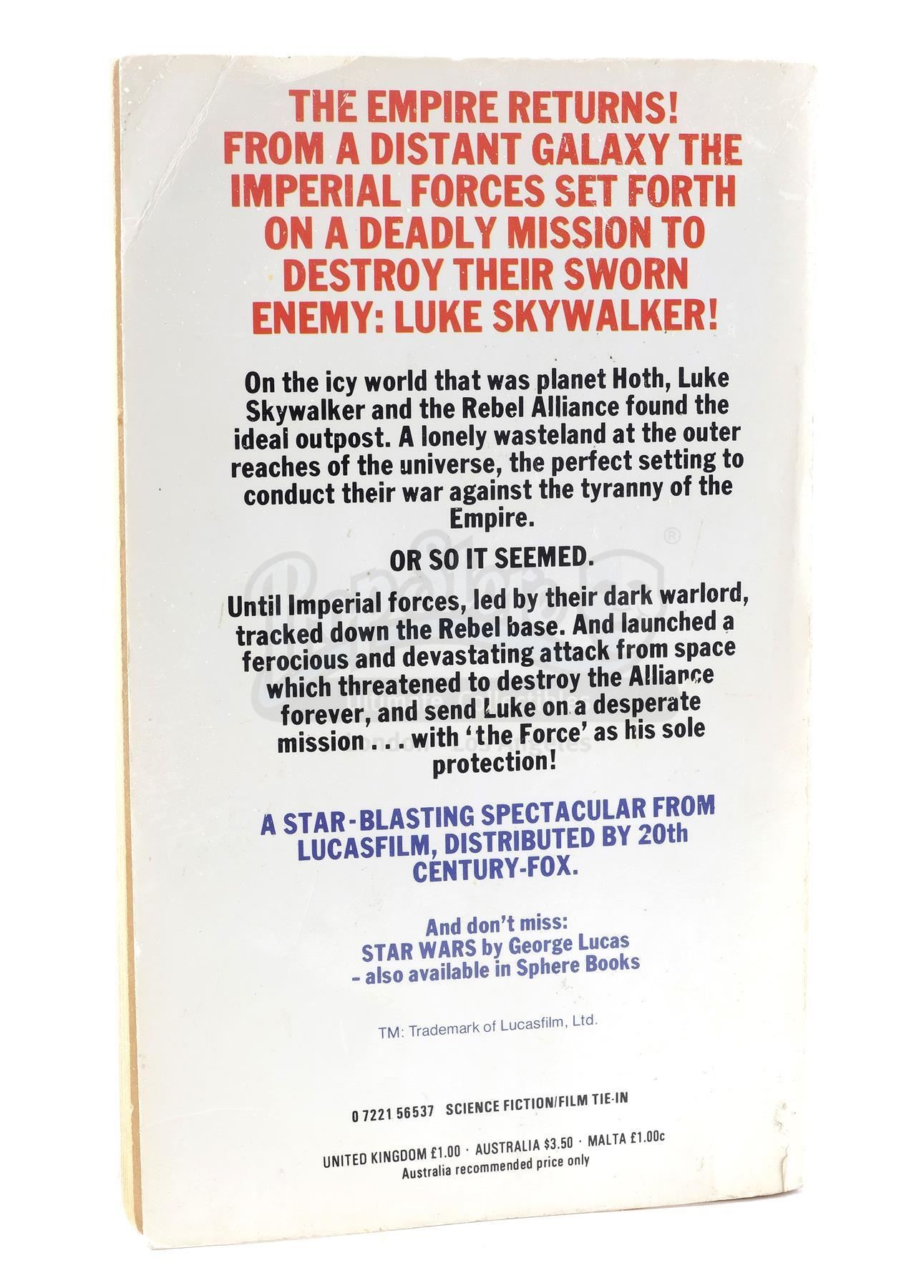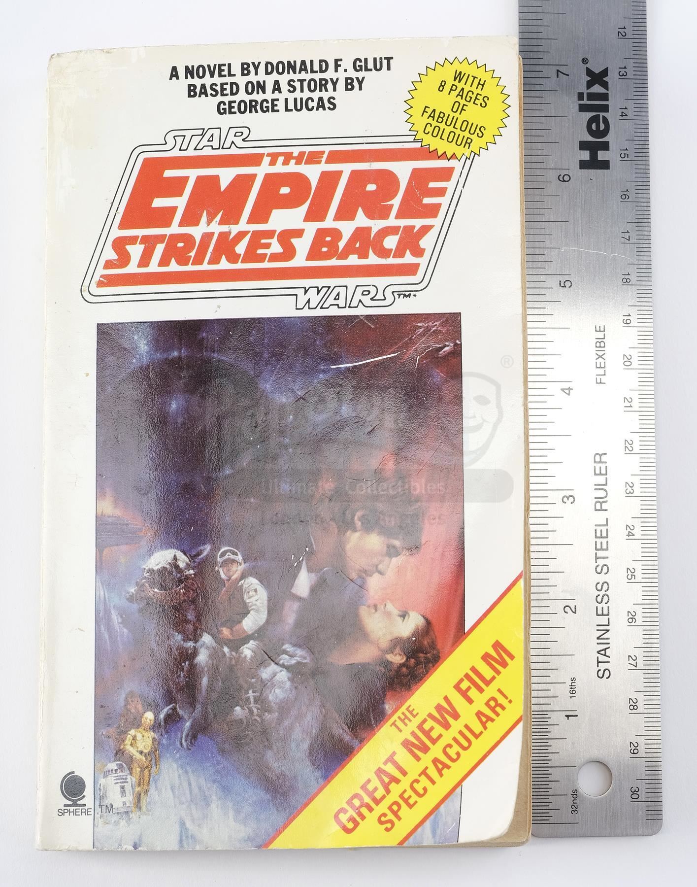 This lot will be auctioned on Thursday, July 1st. The auction will begin at 9:00am PDT and lots are sold sequentially via live auctioneer; tune in to the live streaming broadcast on auction day to follow the pace. Note other lots in the auction may close on June 29th or June 30th. An autographed novelization of Irvin Kershner's Star Wars: The Empire Strikes Back. Published by Sphere in 1980, this book is 215 pages long and contains eight pages of color images from the film. It is autographed in blue and black ink by main cast members Mark Hamill, Harrison Ford, Carrie Fisher, Peter Mayhew, Billy Dee Williams, David Prowse, and Anthony Daniels. It exhibits signs of use and wear, including some creasing and discoloration to the cover and interior pages as a result of age, but remains in very good overall condition. Dimensions: 7" x 4.5" x .5' (33 cm x 28 cm x 1.25 cm) Sold without copyright; see notice in the Buyer's Guide. Estimate: $2,000 - 3,000