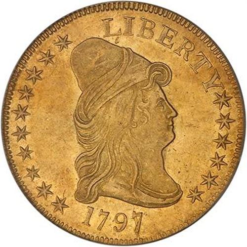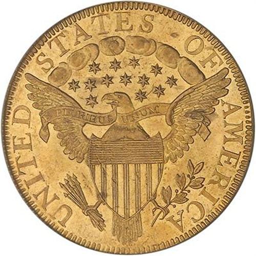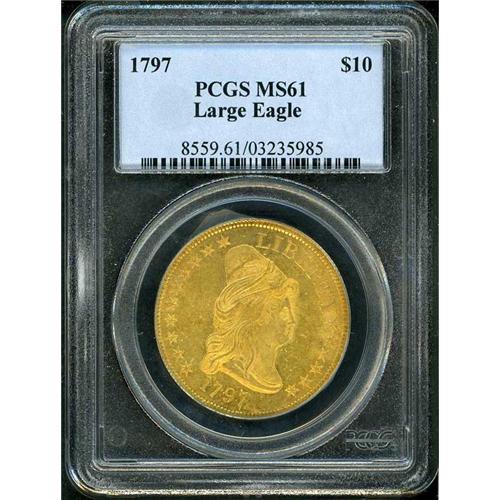 When the revised $10 Eagle went into production for the first time, in 1797, it bore the same obverse as on the quarter eagle and half eagle, with a new reverse, generally known as the heraldic eagle.