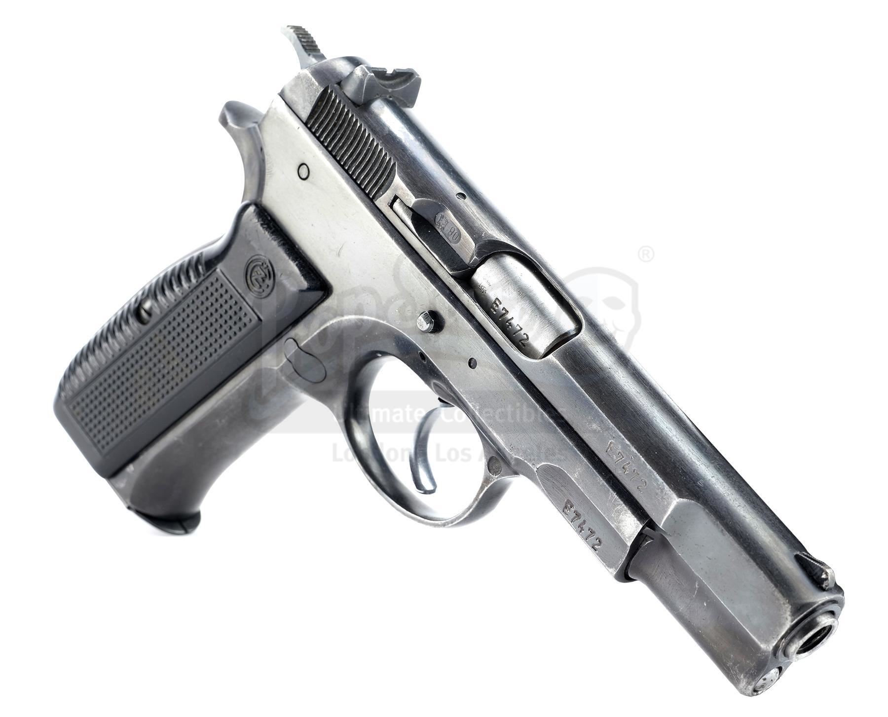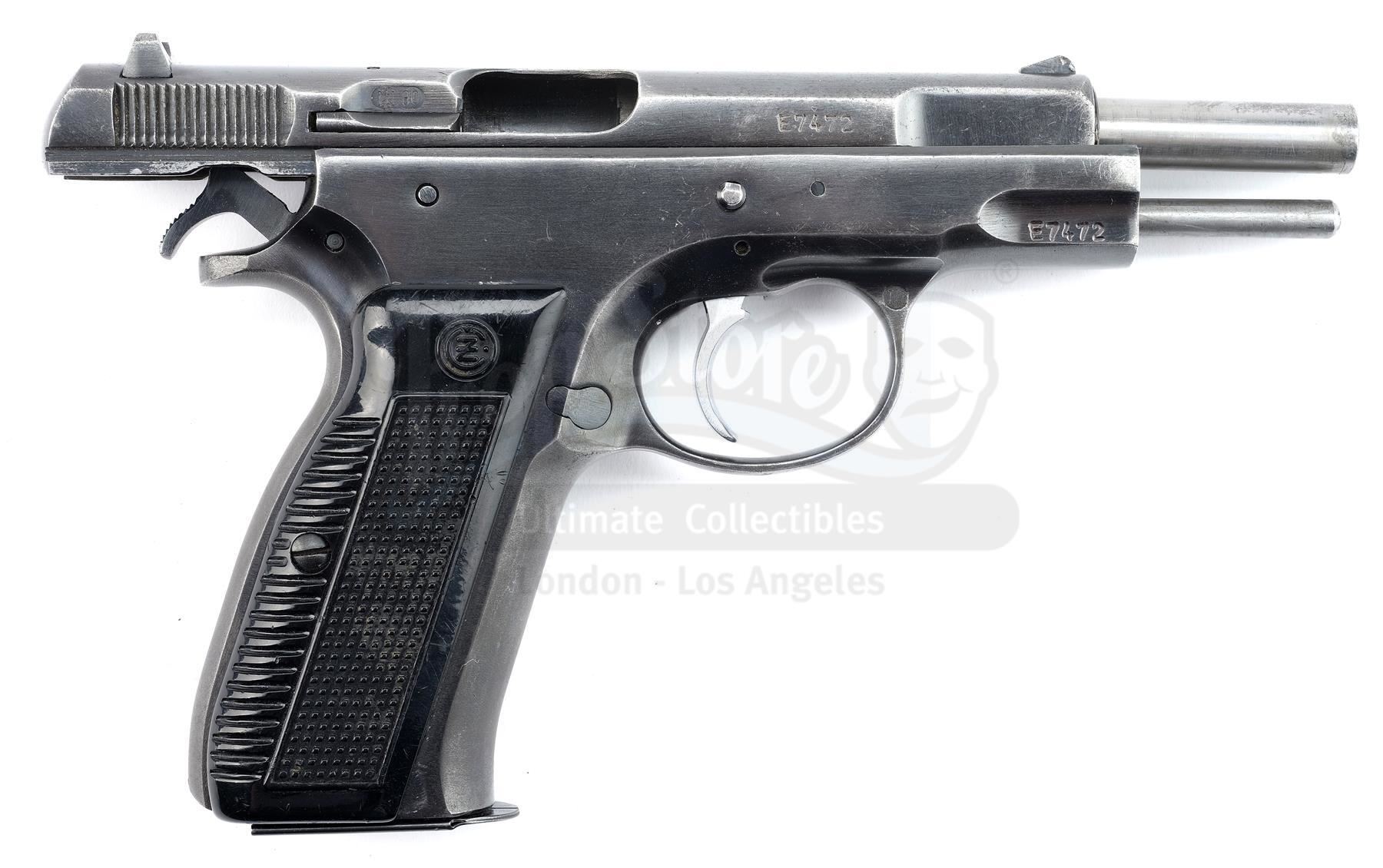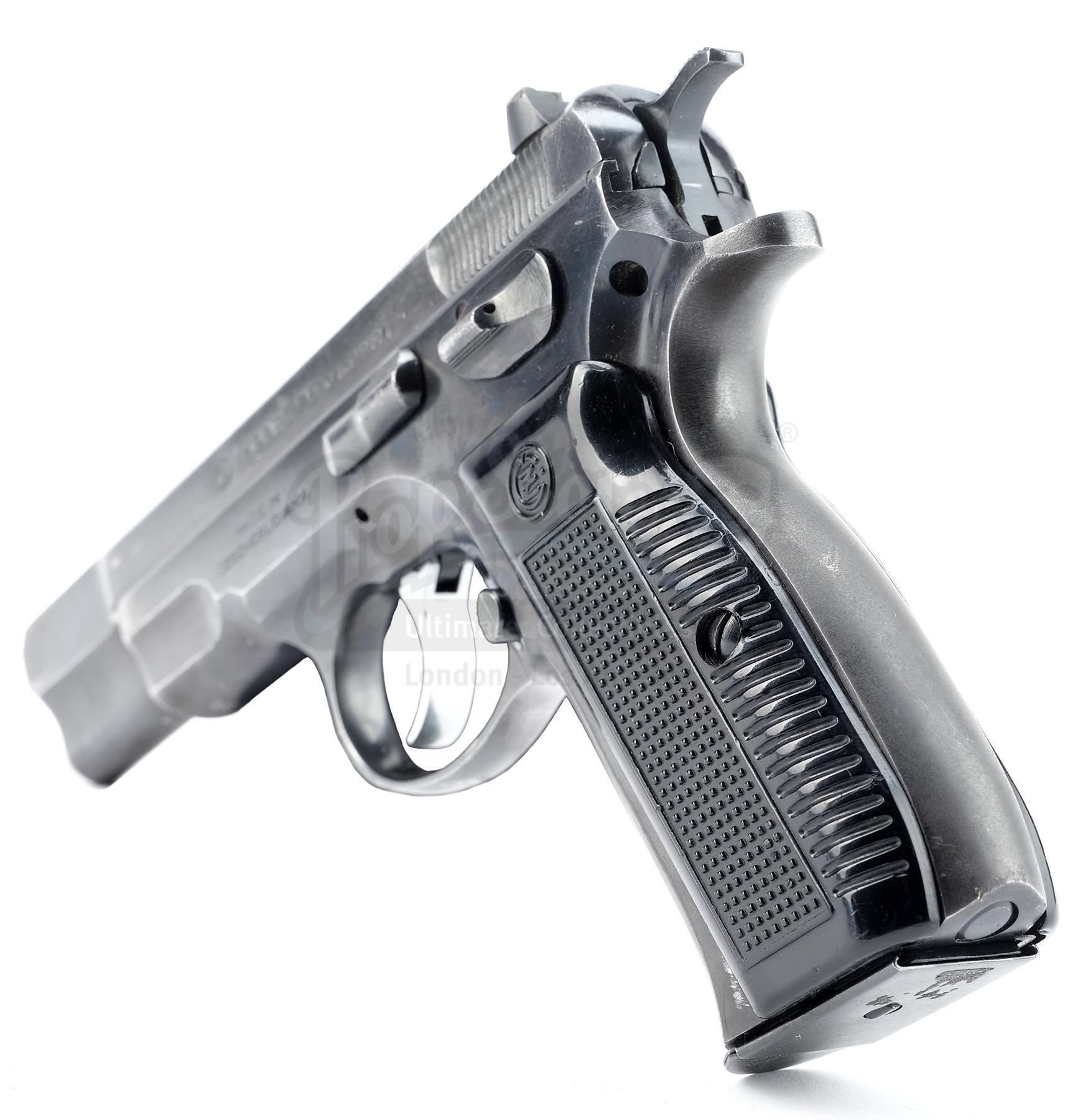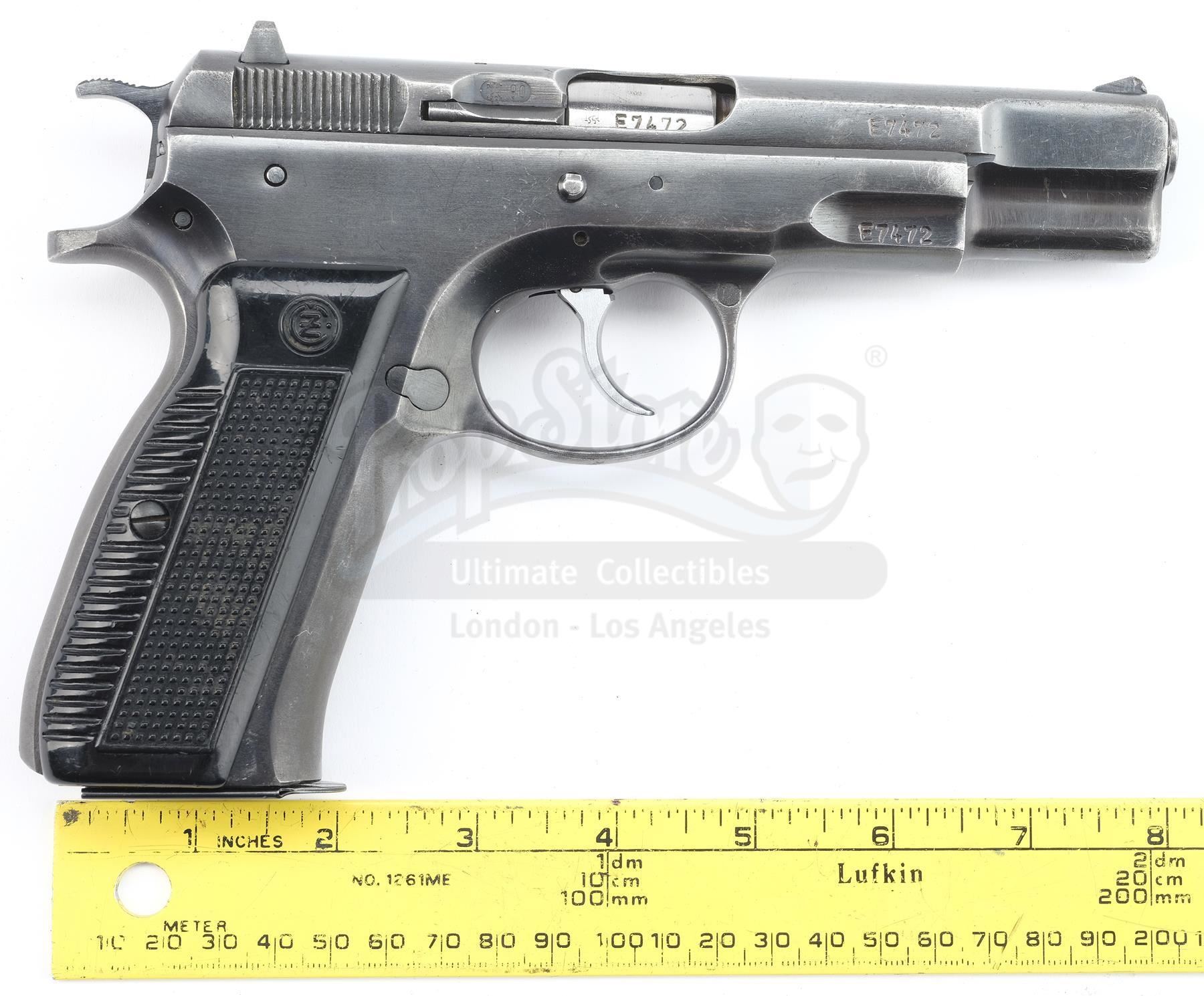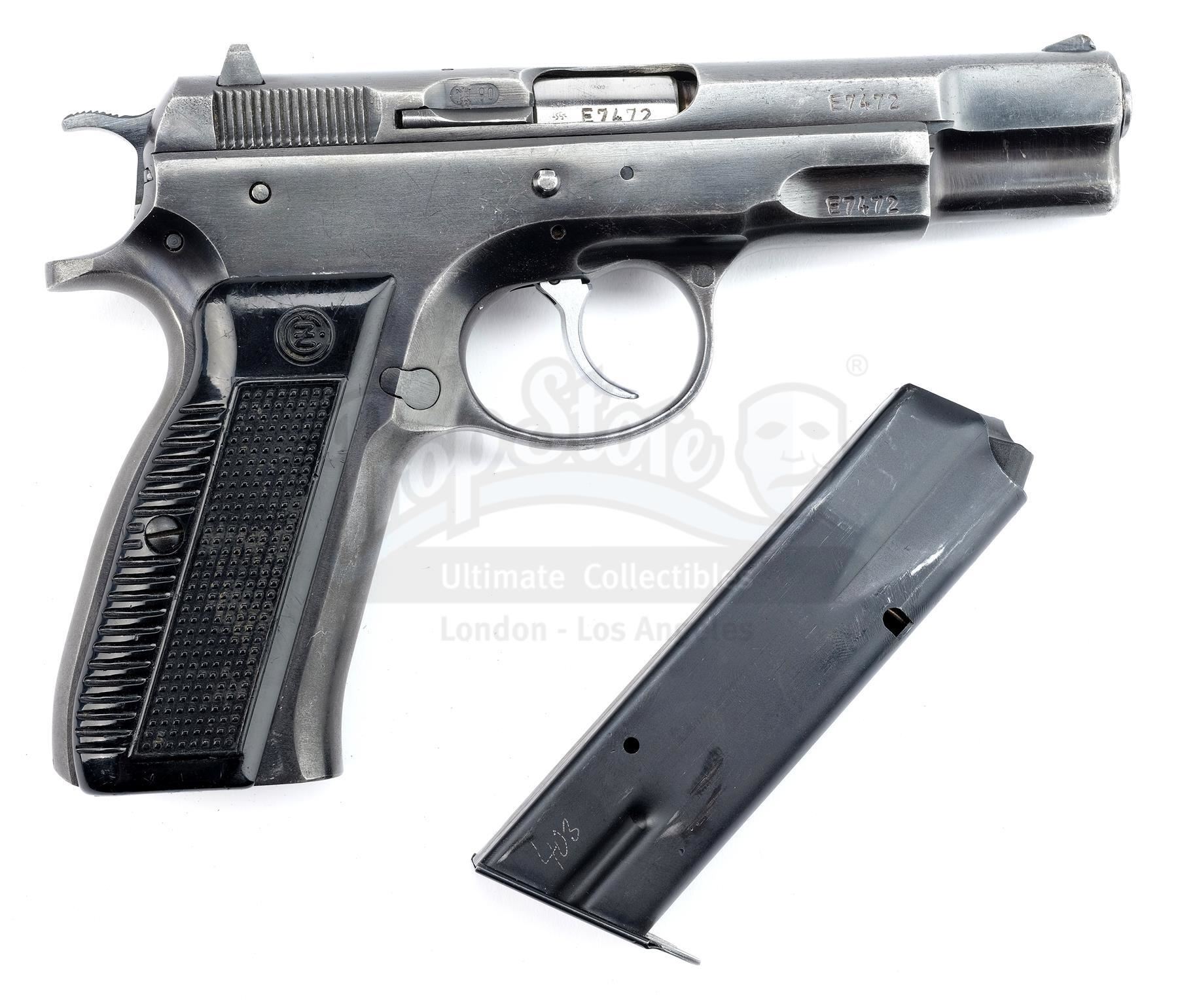The weapon is a deactivated CZ 75 9mm pistol, built with a blued steel frame and black Bakelite grips. The piece had special modifications for filming, with the edges of the magazine port filed down to allow a smooth magazine release that, when combined with an enhanced spring in the release mechanism, would launch the pistol's magazine clear. The pistol is deactivated and comes with a certificate of deactivation. A standard release spring has been fitted following the production. It is in excellent overall condition with minimal wear from production, including a bit of scuffing and scratching throughout. Dimensions: 8" x 5 1/2" x 1 1/2" (20.5 cm x 14 cm x 4 cm)