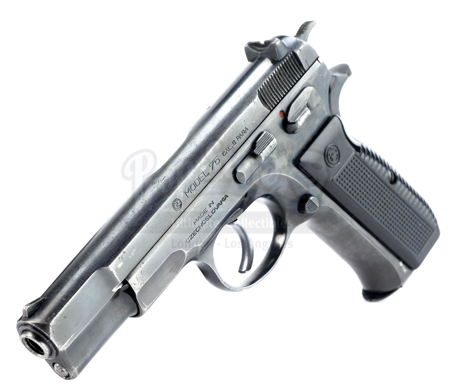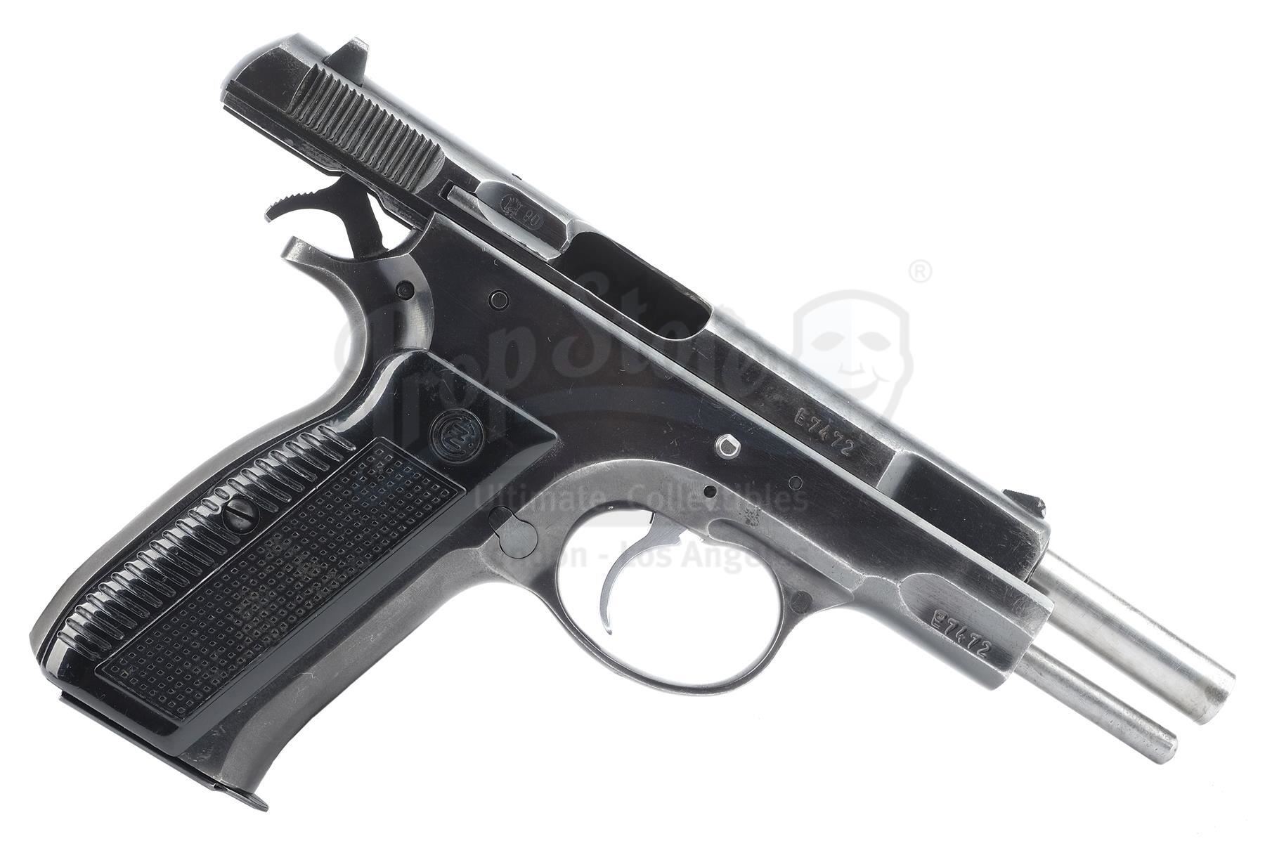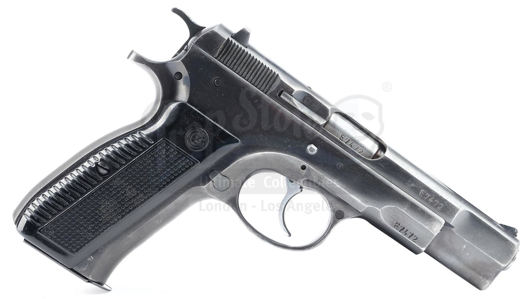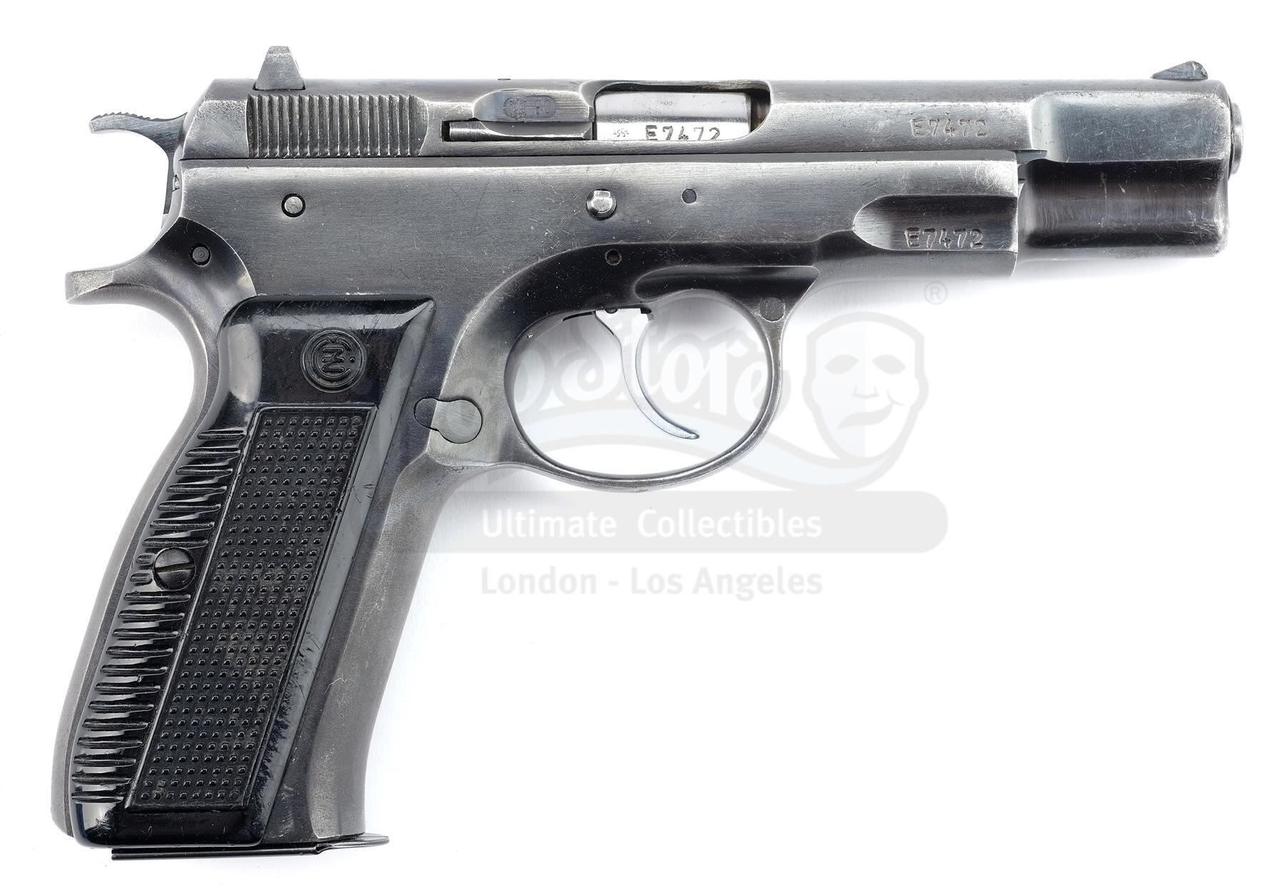 The weapon is a deactivated CZ 75 9mm pistol, built with a blued steel frame and black Bakelite grips. The piece had special modifications for filming, with the edges of the magazine port filed down to allow a smooth magazine release that, when combined with an enhanced spring in the release mechanism, would launch the pistol's magazine clear. The pistol is deactivated and comes with a certificate of deactivation. A standard release spring has been fitted following the production. It is in excellent overall condition with minimal wear from production, including a bit of scuffing and scratching throughout. Dimensions: 8" x 5 1/2" x 1 1/2" (20.5 cm x 14 cm x 4 cm)