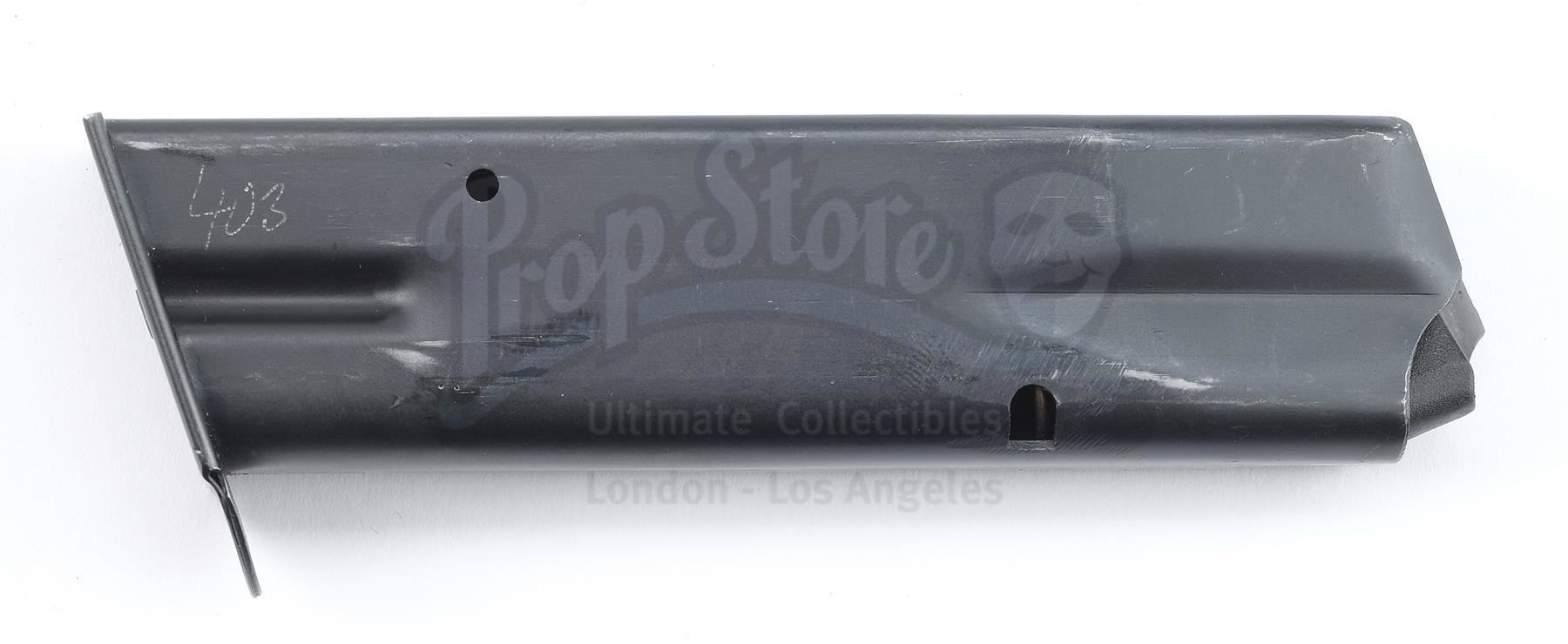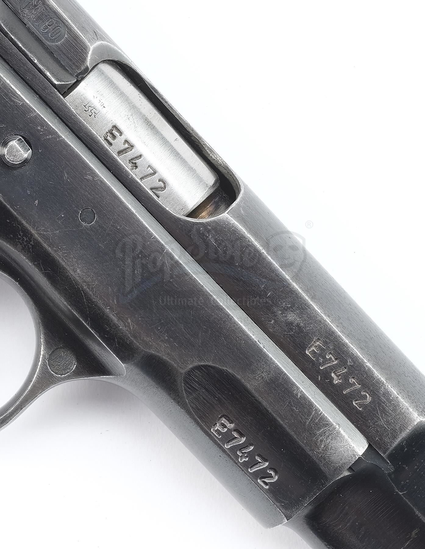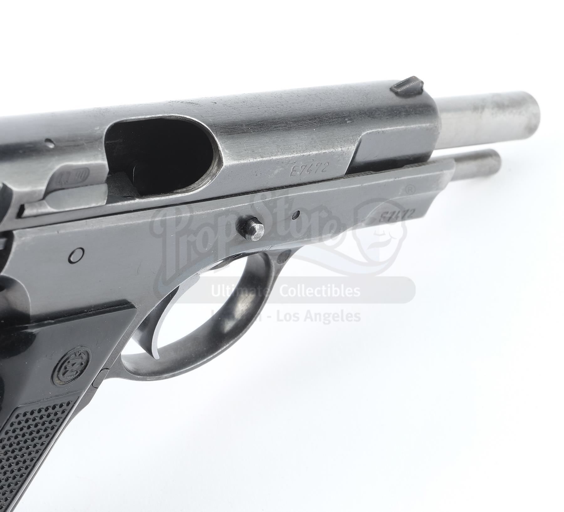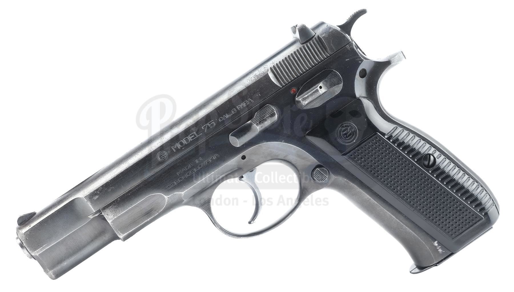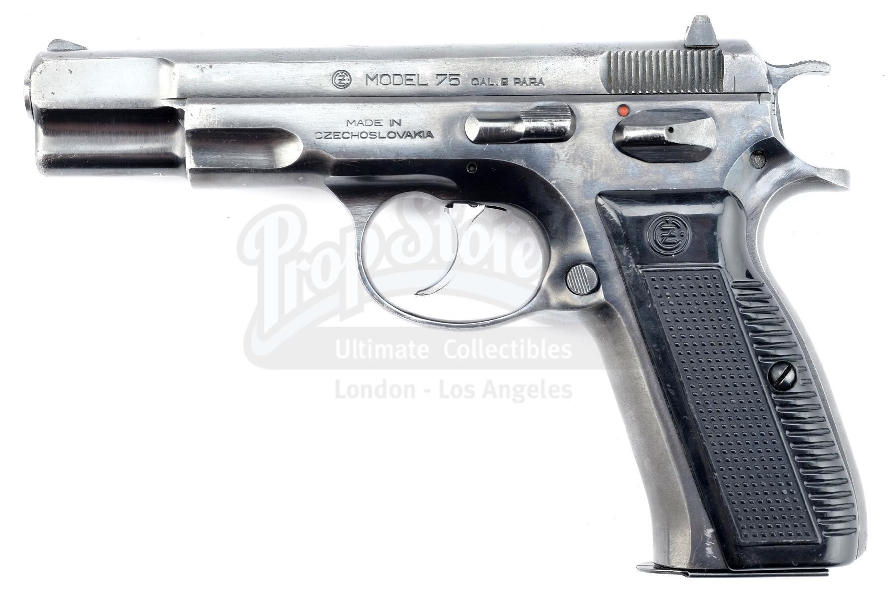 The weapon is a deactivated CZ 75 9mm pistol, built with a blued steel frame and black Bakelite grips. The piece had special modifications for filming, with the edges of the magazine port filed down to allow a smooth magazine release that, when combined with an enhanced spring in the release mechanism, would launch the pistol's magazine clear. The pistol is deactivated and comes with a certificate of deactivation. A standard release spring has been fitted following the production. It is in excellent overall condition with minimal wear from production, including a bit of scuffing and scratching throughout. Dimensions: 8" x 5 1/2" x 1 1/2" (20.5 cm x 14 cm x 4 cm)