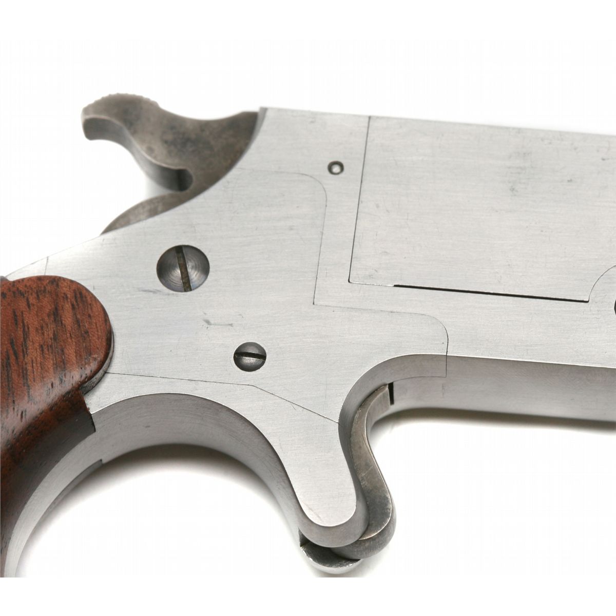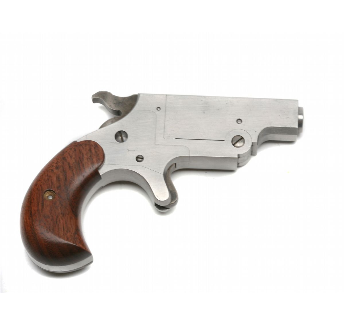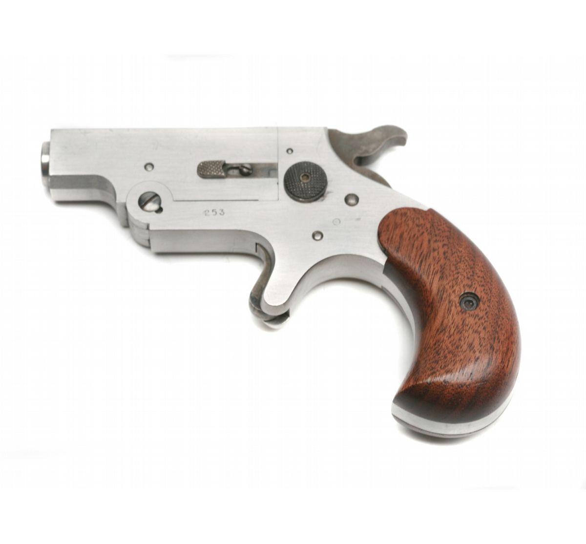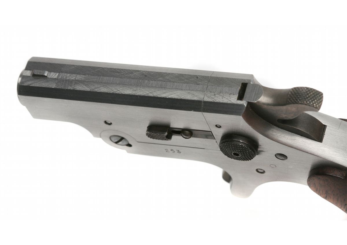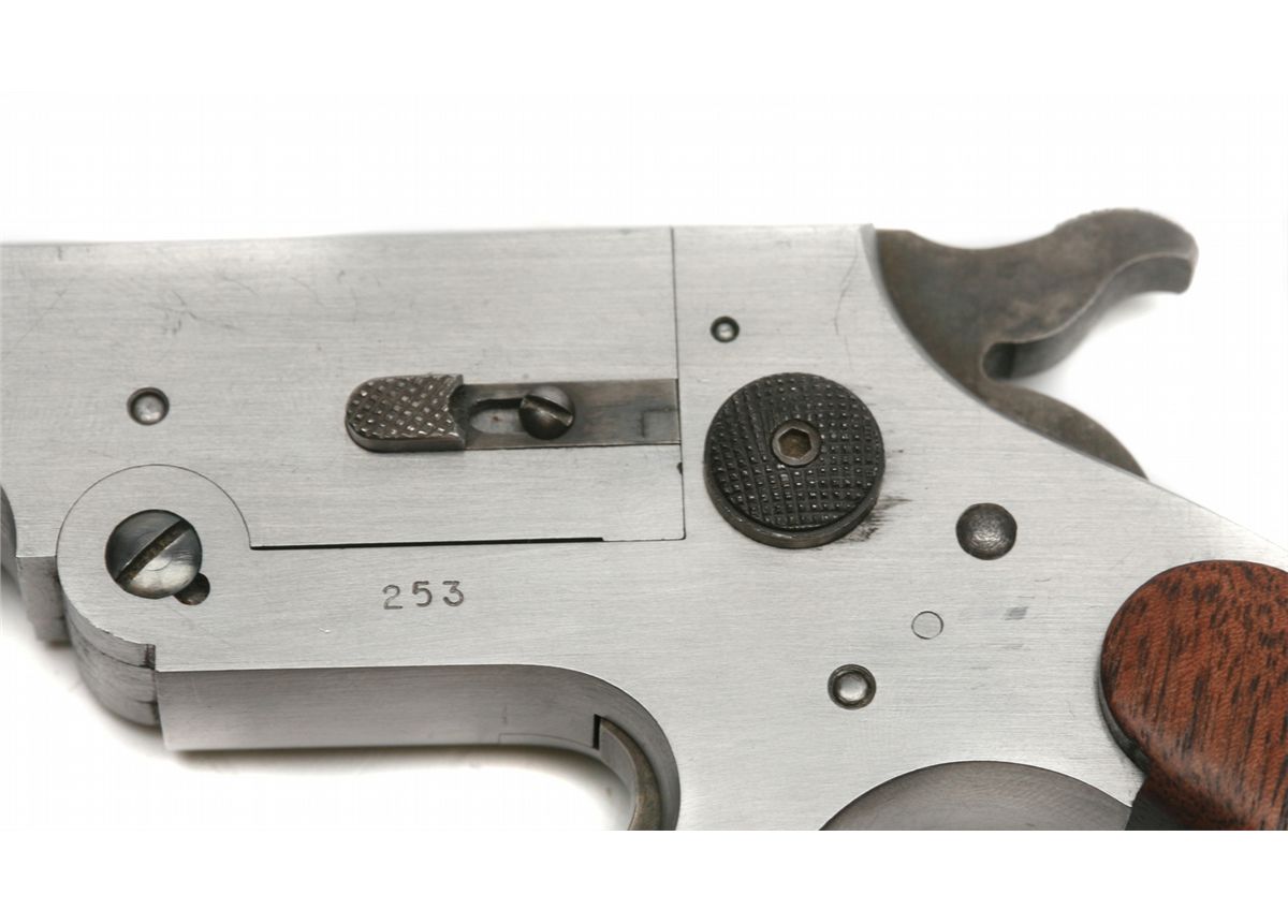 Good condition - 2.5" flat-sided barrel - light scratches to stainless finish - walnut grips in very good condition - front low blade sight - SN on left frame - no other markings - spur trigger single shot flat sided single action - manual extractor - custom built by L.C.M. - SN 253 - est. 150 - 350 - FFL - 25BBBRCKS050