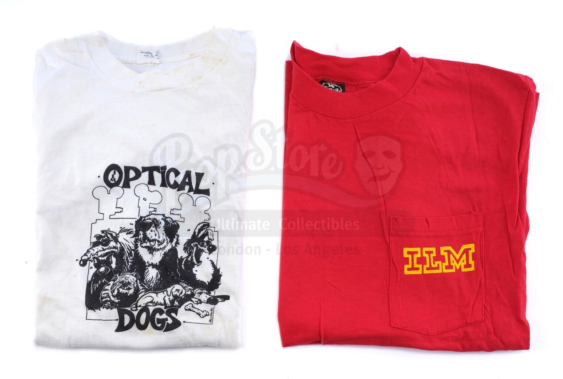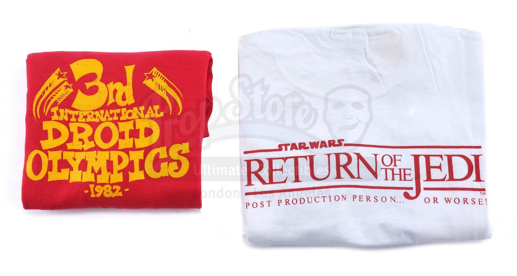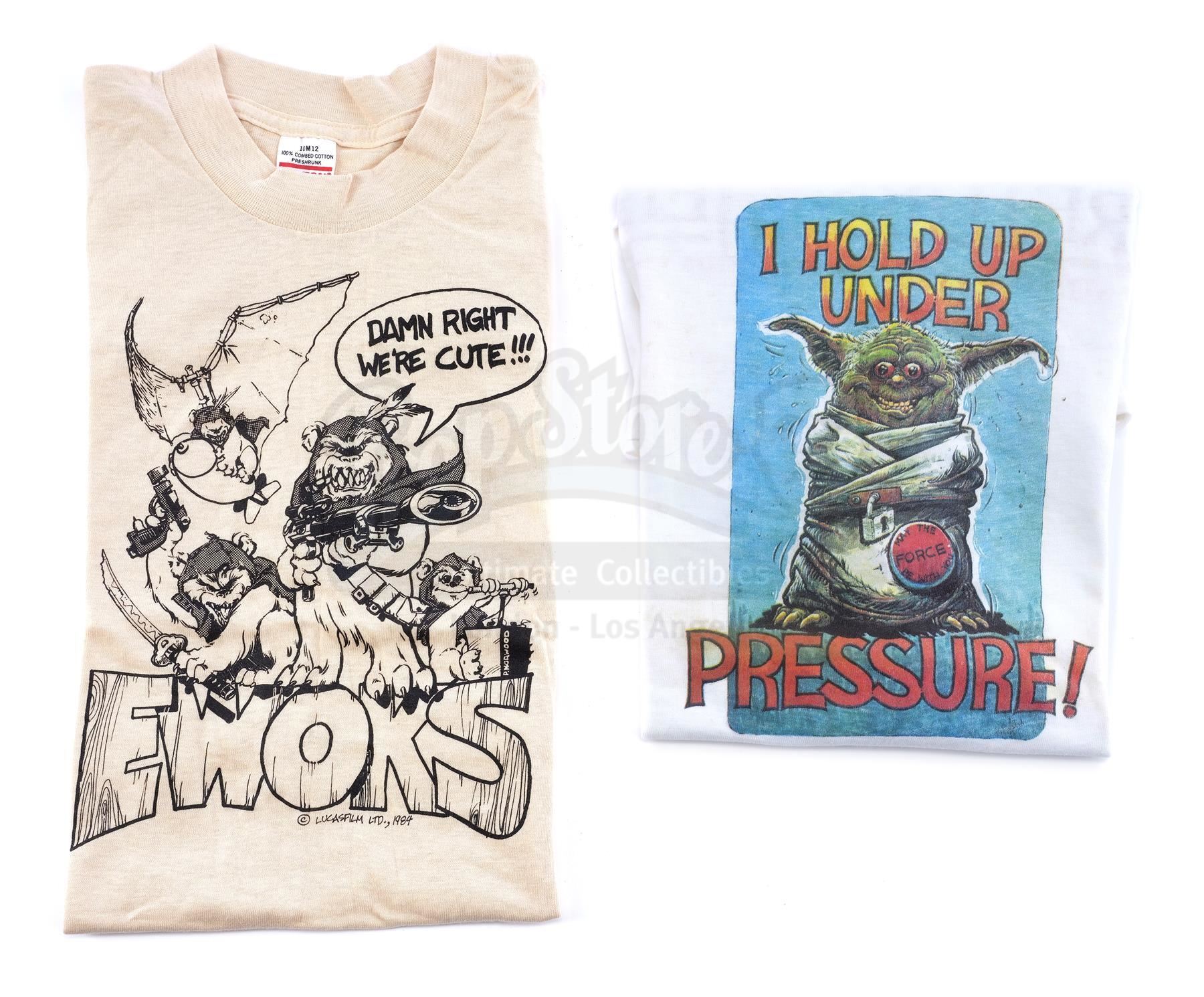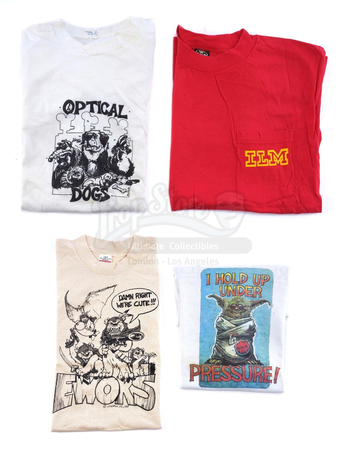 This lot will be auctioned on Thursday, July 1st. The auction will begin at 9:00am PDT and lots are sold sequentially via live auctioneer; tune in to the live streaming broadcast on auction day to follow the pace. Note other lots in the auction may close on June 29th or June 30th. Four Industrial Light & Magic (ILM) crew shirts from Richard Marquand's Star Wars: Return of the Jedi. Crewmembers working on the film were given shirts bearing the project's title or related imagery. This lot consists of a white cotton "Optical Dogs" T-shirt; a red cotton "3rd International Droid Olympics 1982" T-shirt labeled "ILM" in yellow; a tan cotton "Damn Right We're Cute!!!" Ewoks T-shirt; and a white cotton "I Hold Up Under Pressure!" T-shirt with a graphic of Yoda (Frank Oz) in a straightjacket and "Post Production Person..or Worse!" labeled on the reverse. They are in good overall condition with some signs of wear, including staining. Estimate: $500 - 700