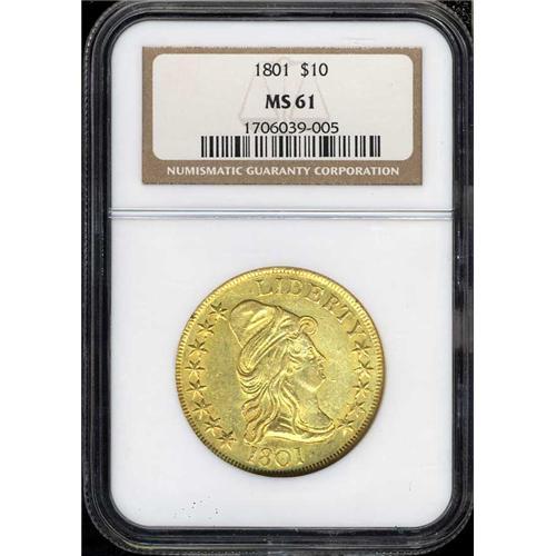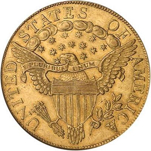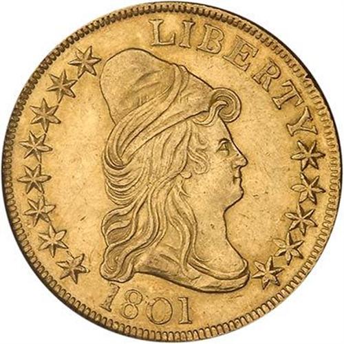 1801 $10 Capped Bust. The mostly reddish-gold surfaces display modest, yet pleasing luster effects as the coin turns under the light. Clockwork precision seen in the cap and hair, as elsewhere on the reverse. Within Liberty's cap can be found several parallel lines that are die clash marks from the stripes of the shield. This is the most frequently encountered early Eagle variety and as such makes a perfect coin to represent the Type. (#8564)