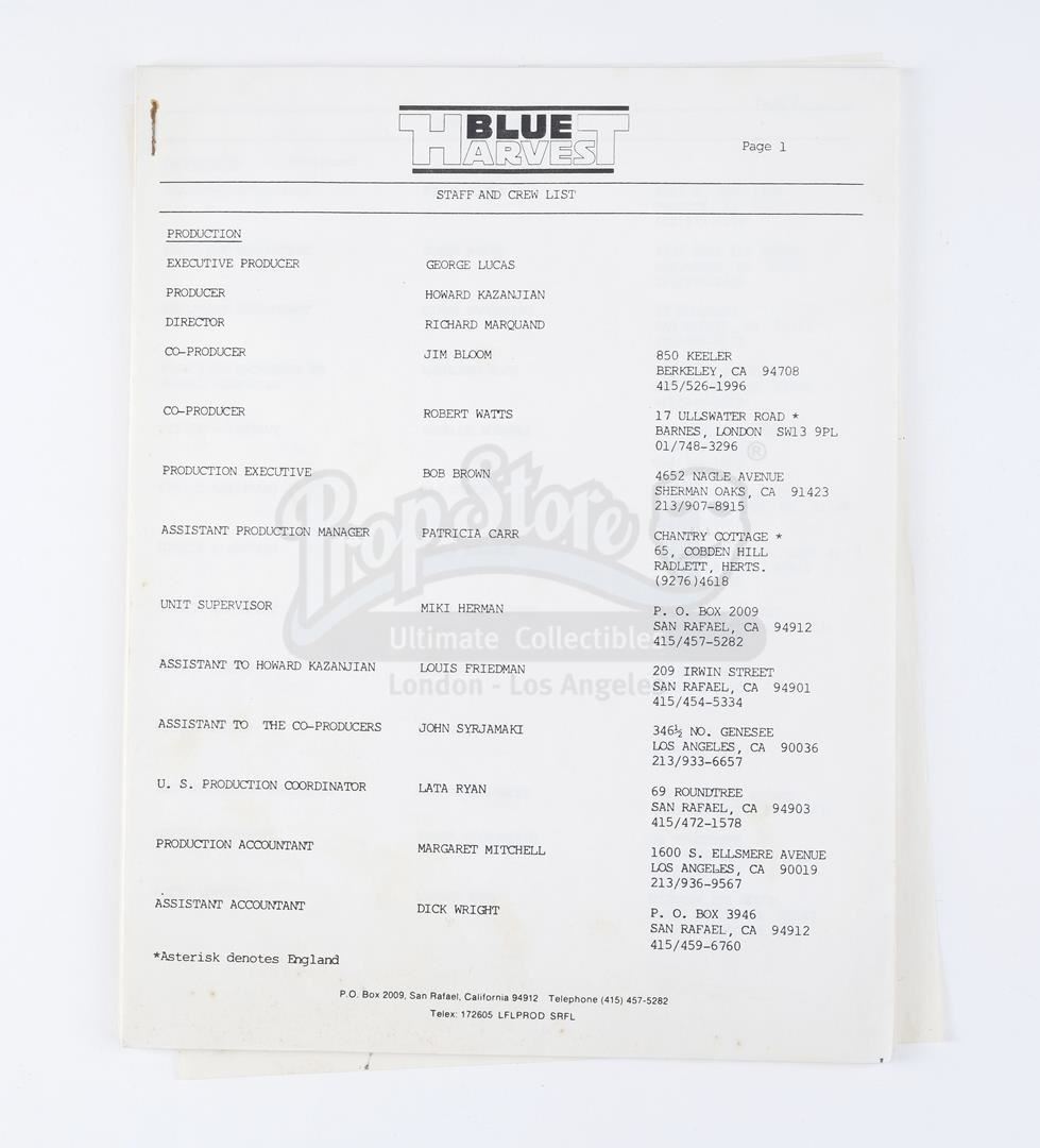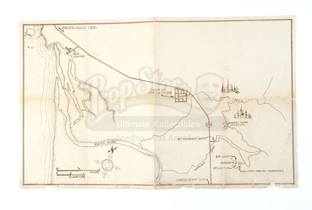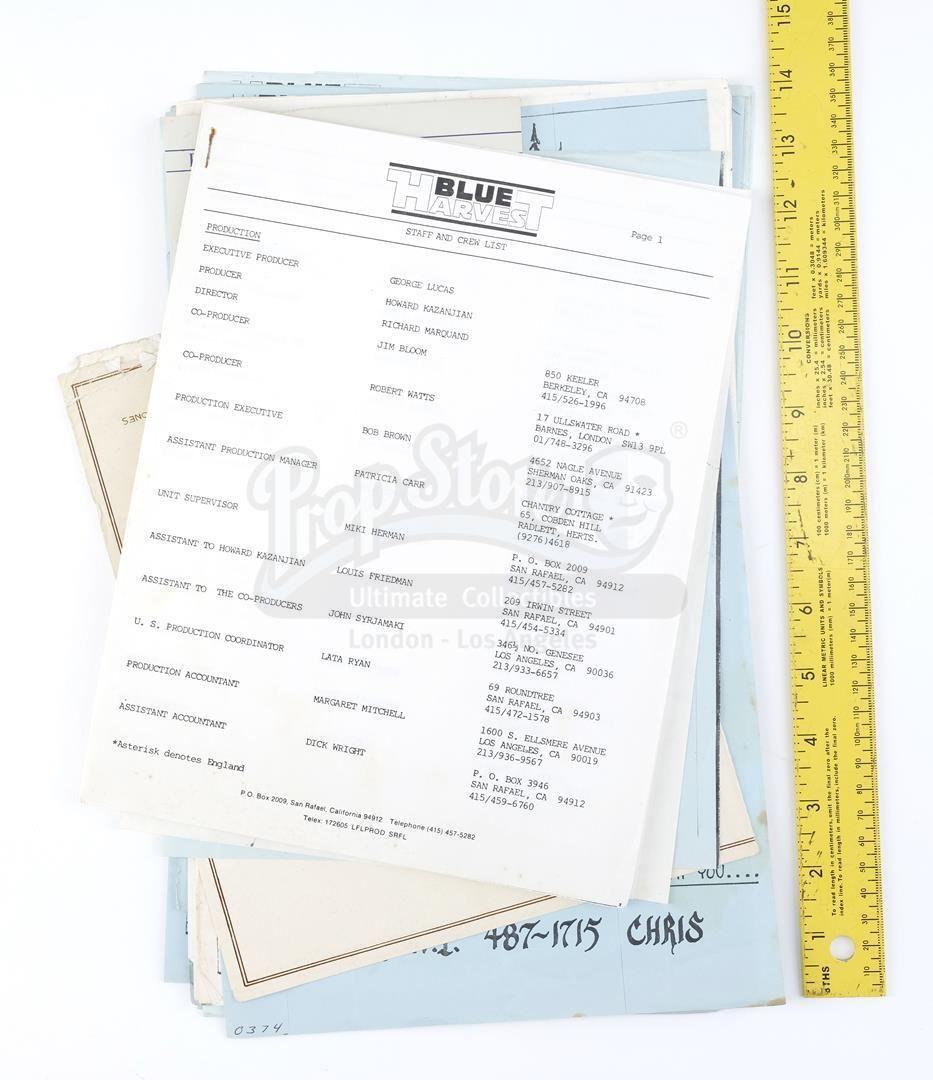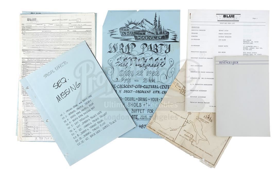 This lot will be auctioned on Thursday, July 1st. The auction will begin at 9:00am PDT and lots are sold sequentially via live auctioneer; tune in to the live streaming broadcast on auction day to follow the pace. Note other lots in the auction may close on June 29th or June 30th. Production paperwork, a wrap party invitation, and a location map from Richard Marquand's Star Wars: Return of the Jedi. This set consists of 17 call sheets detailing "Blue Harvest's" (the production's codename) Crescent City shoot days; a gray "Revenge of the Jedi"-branded notepad; 30 stapled pages of crew information; a "Special Effects Seq. Missing" list; a tentative "Revenge" schedule; a wrap party invitation; and a shoot locations map. It is in good overall condition with various folds, creases, and stains from use throughout. Dimensions (largest): 14.25" x 8.75" (36.25 cm x 22.25 cm); (smallest): 8.5" x 5.5" (21.75 cm x 14 cm) Estimate: $800 - 1,200