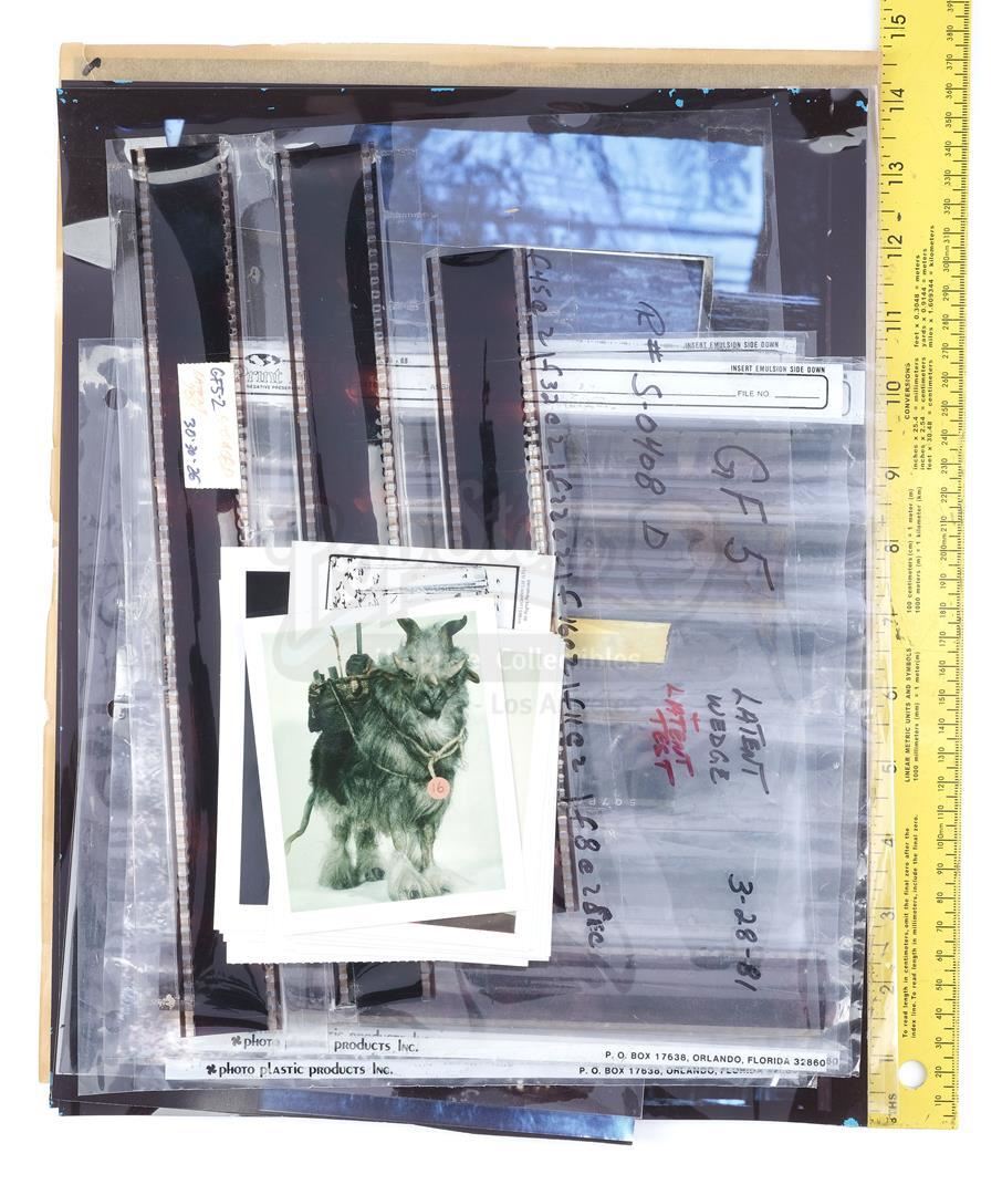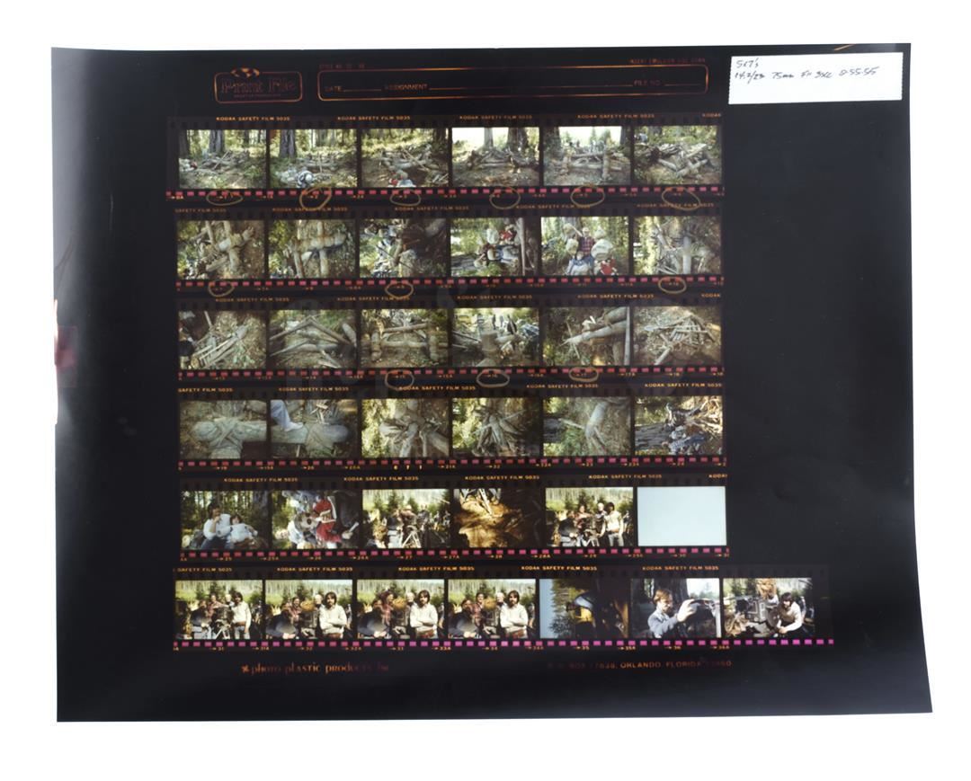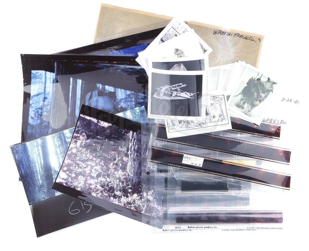 This lot will be auctioned on Thursday, July 1st. The auction will begin at 9:00am PDT and lots are sold sequentially via live auctioneer; tune in to the live streaming broadcast on auction day to follow the pace. Note other lots in the auction may close on June 29th or June 30th. A set of production photographs, visual effects wedges and negatives of behind-the-scenes images from Richard Marquand's Star Wars: Return of the Jedi. Included are a number of color 8x10 photographs relating to VFX shots, Polaroid photos of a number of character maquettes, wedges for several visual effects shot, and color negatives of a series of behind the scenes images from the production of the film. Wedges are incremental lighting and exposure tests that are created during production to find the optimal exposure level for a composited shot; wedge subjects include the rancor cave, biker scout, and more. The color negatives were taken during filming in the Northern California Redwoods and include shots of Ewok performer Warwick Davis and members of the ILM production crew. A few polaroid photos of models from The Empire Strikes Back are also included. The majority of the content in this lot is unpublished and remains in excellent condition. Dimensions: (largest) 8 x 10" (20 cm x 25 cm) Estimate: $800 - 1,200