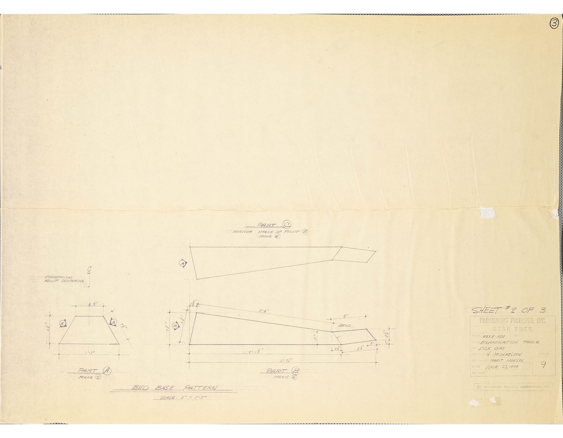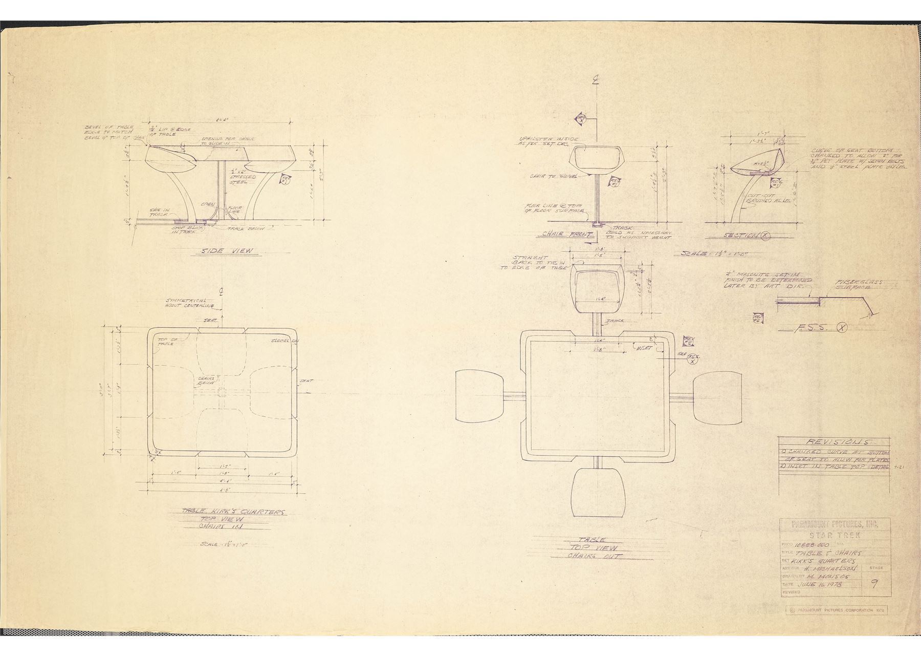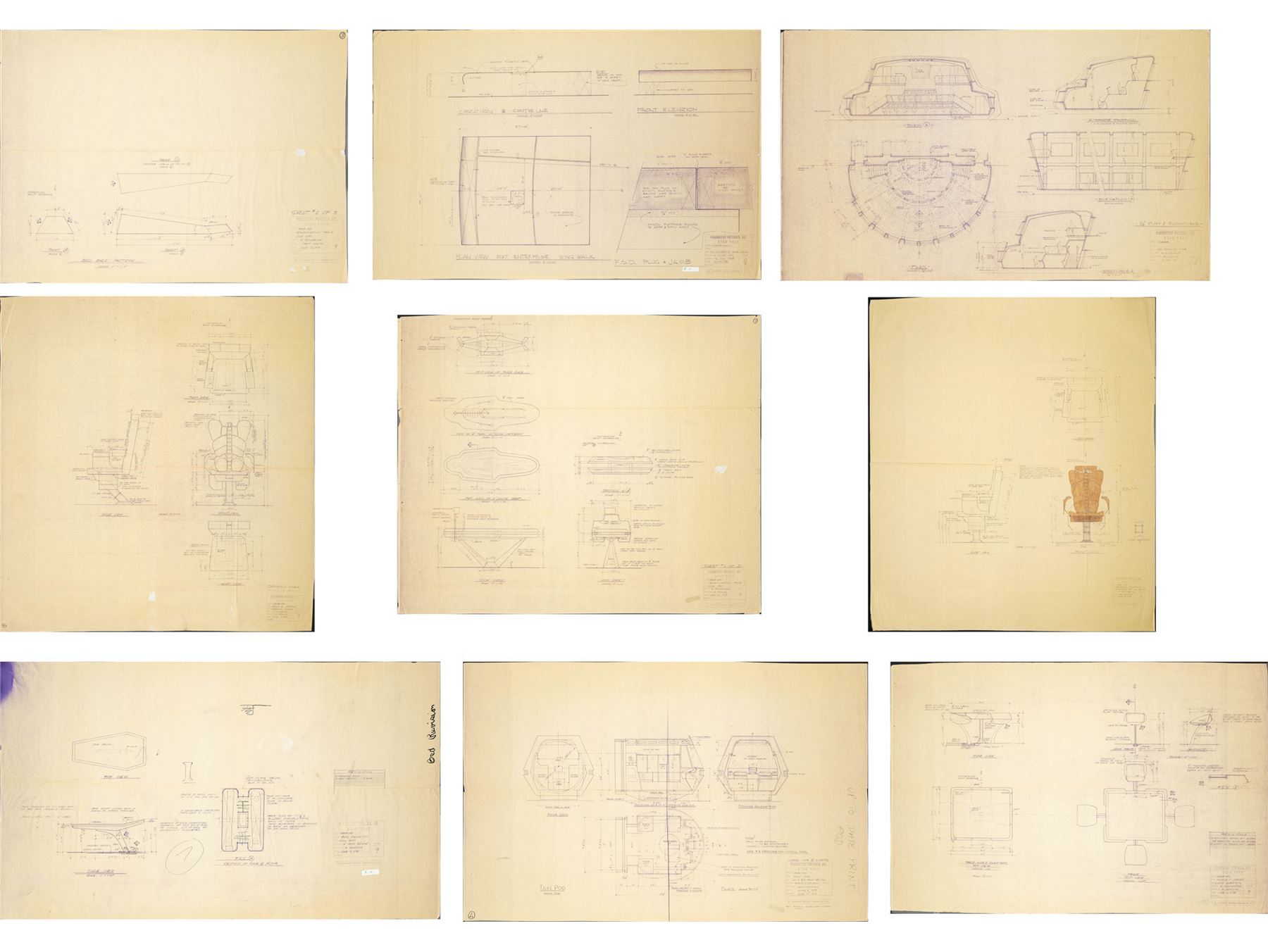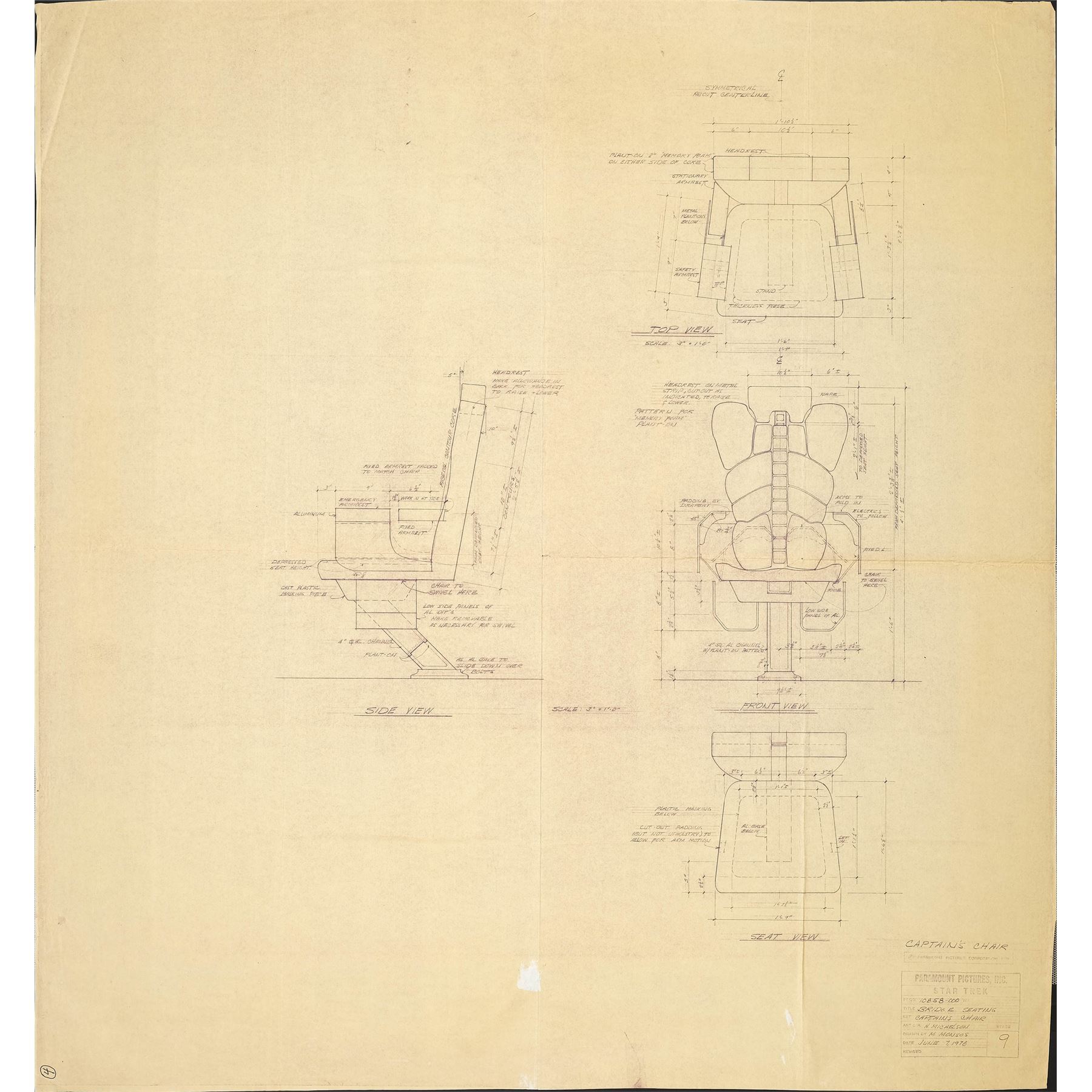This lot consists of a nine blueprint pages for set pieces including the captain's chair, bridge seating for navigation and engineering, tables and chairs for Kirk's quarters, a taxi pod, a sick bay bed, a sick bay examination table, the Epsilon IX station interior, and an Enterprise "Wing Walk" exterior. One of the bridge chair images has been colored in brown and gray. They exhibit varying degrees of yellowing, tearing, and creasing, having been stored rolled with some previously folded. Dimensions: (largest) 42" x 50" (106.75 cm x 127 cm)