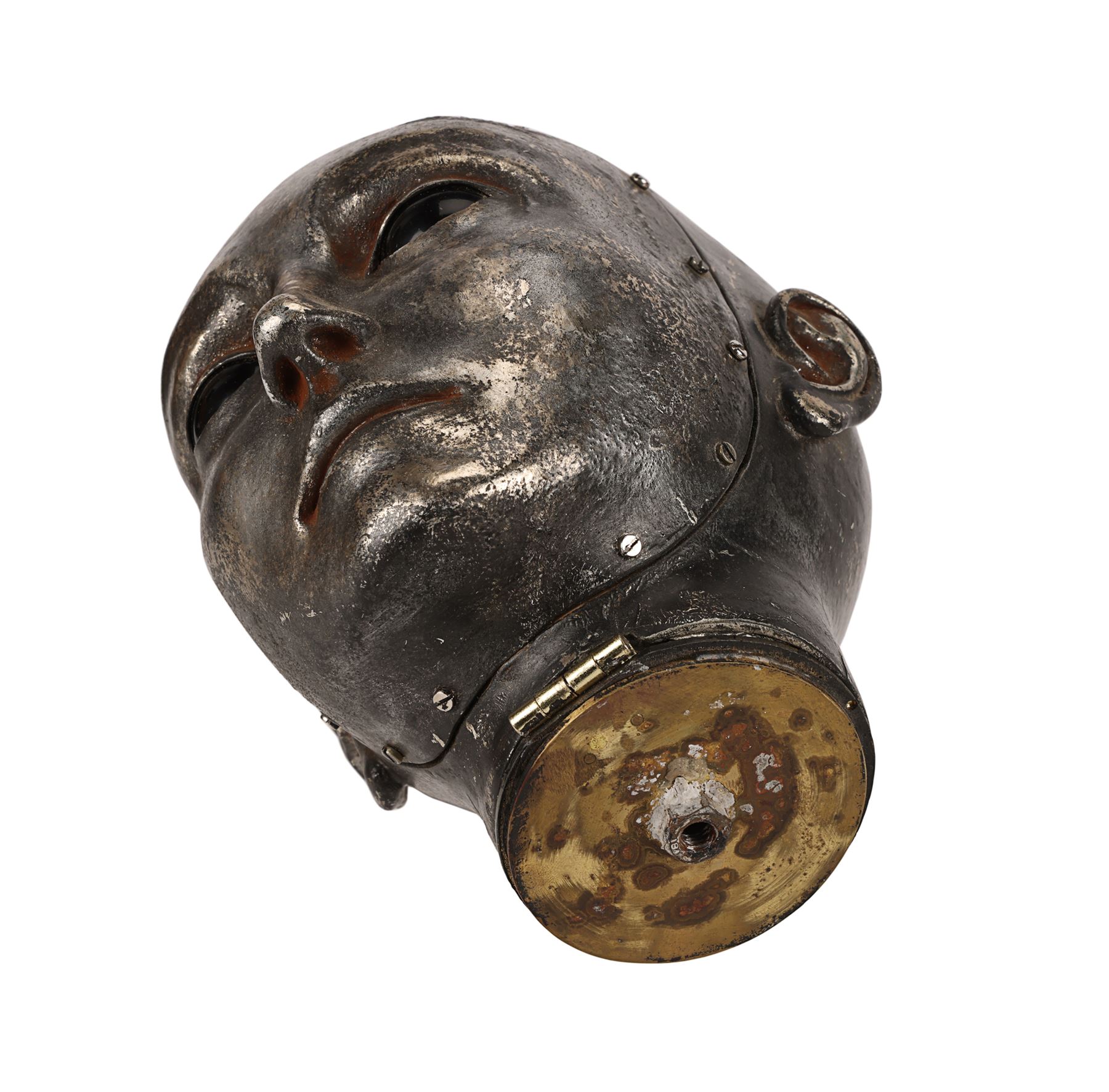The head is predominantly made of resin and metal, with its black eyes rendered from glass. A metal hatch at the bottom of the head can be opened to reveal a string mechanism that ascends to the top of the internal chamber. The lot exhibits a single crack on the right side of the head, at the back by the neck. Dimensions: 15 cm x 12 cm x 10 cm (6" x 4 3/4" x 4")