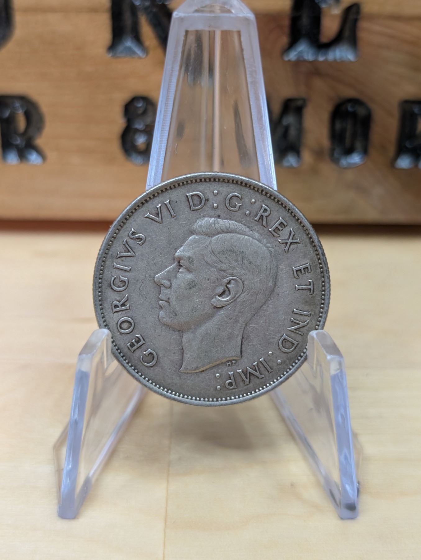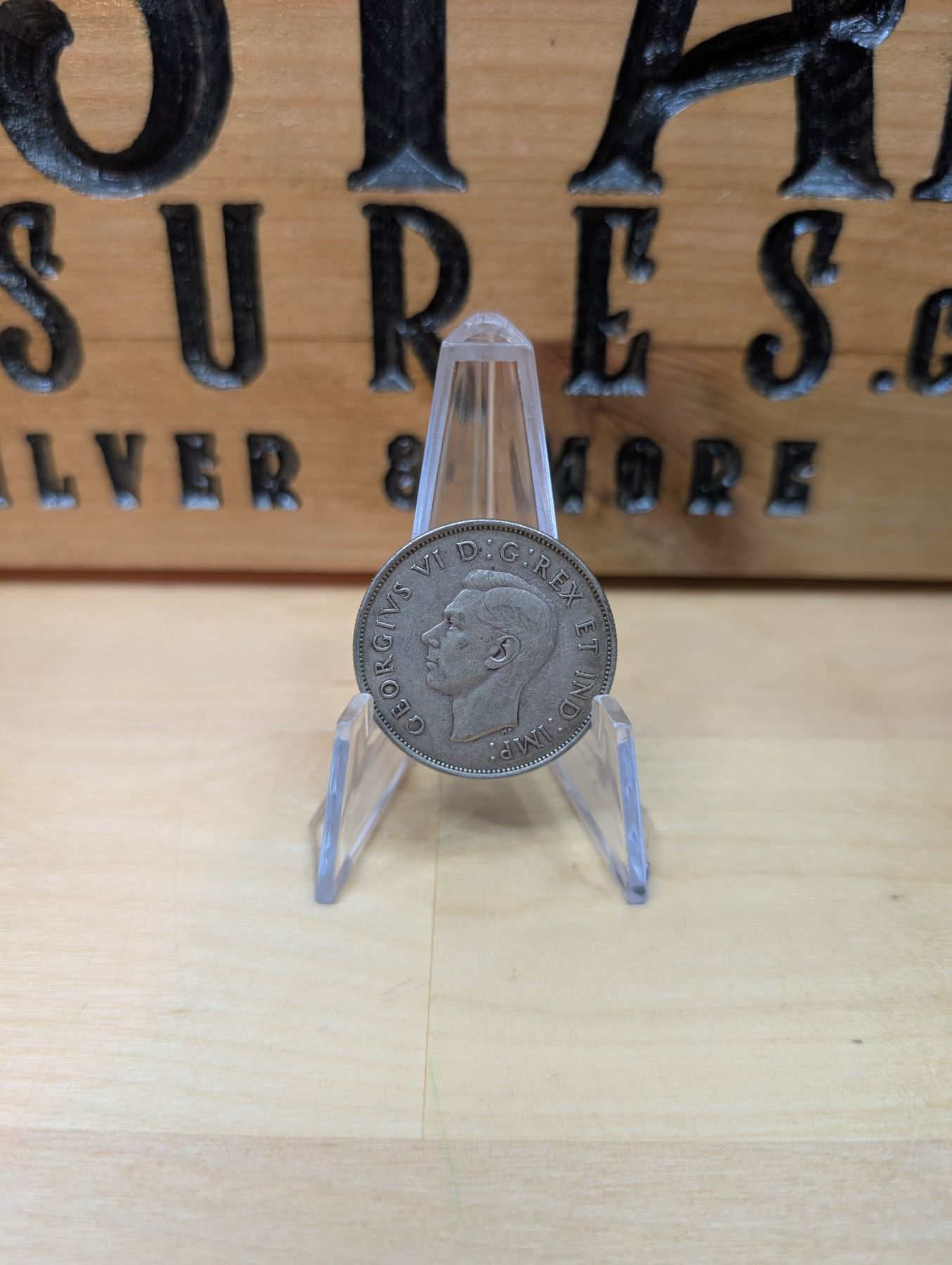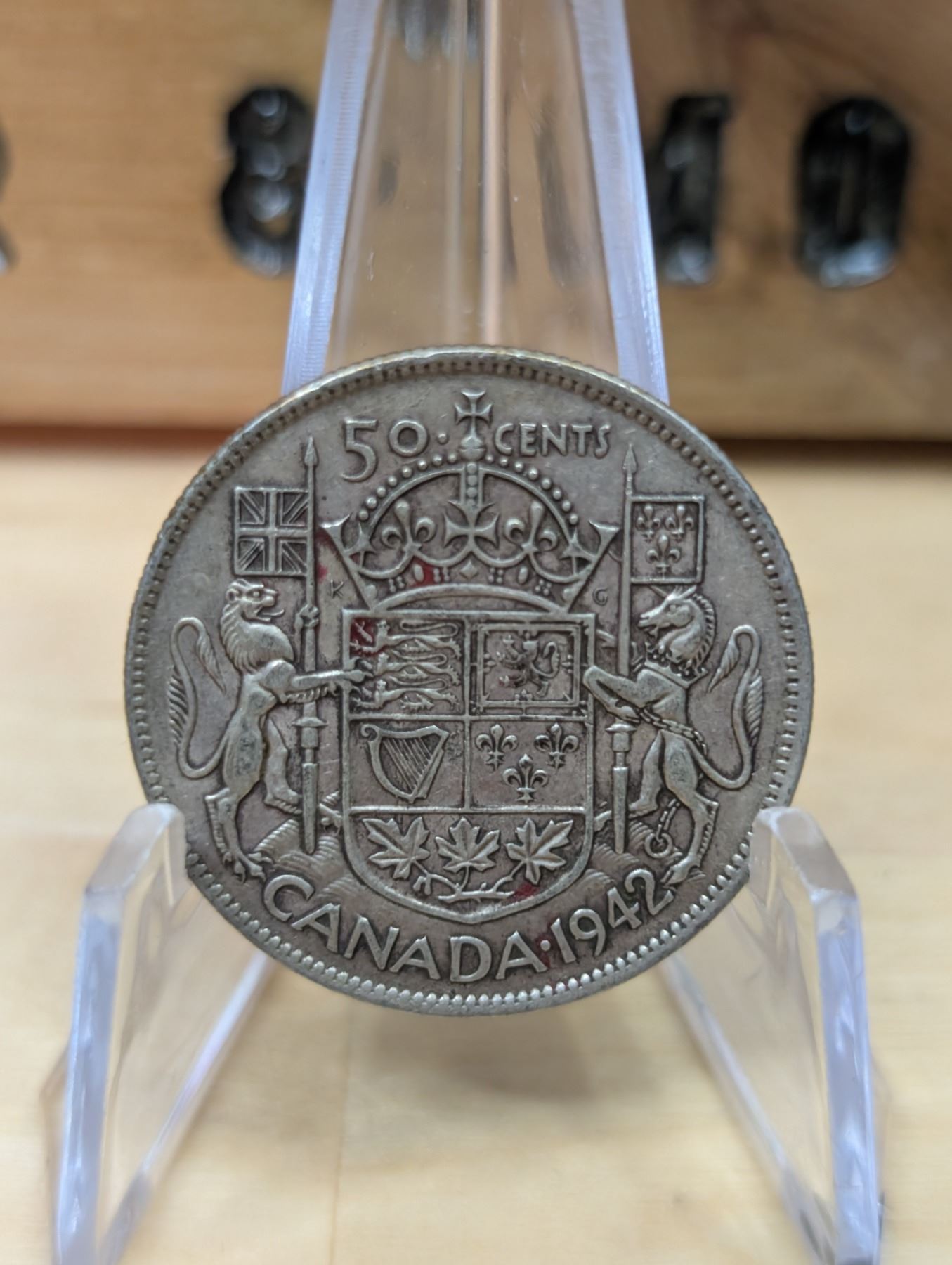 The 1942 Canadian 50-cent coin is made of 80% silver and 20% copper, weighing 11.6 grams. It features the effigy of King George VI on the obverse, with the reverse displaying a stylized version of the Canadian coat of arms. The coin was minted during World War II, adding to its historical significance, and is valued by collectors for both its silver content and rarity.
