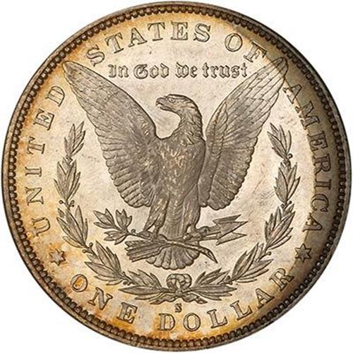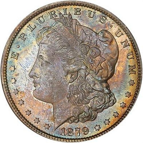 1879-S Morgan Dollar. Reverse of 1879. Beautiful blue and russet lilac toning graces the smooth mint frost of the surface. Fully struck in most areas with pinpoint detailing on the main hair strands, but some unconvincing roundness here and there, including a couple of merged strands immediately above the ear. Just the same, this is one delightful 1879 Morgan silver dollar because of its color. (#7092)