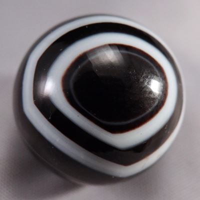 Beautiful black dyed handcut agate. Excellent bullseye. Nice faceting. Great color. Superb example. Germany, circa 1850-1920. 3/4". Mint (9.9).