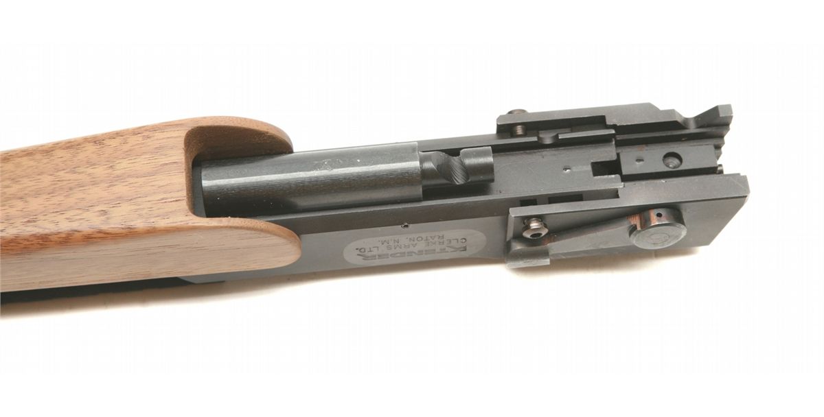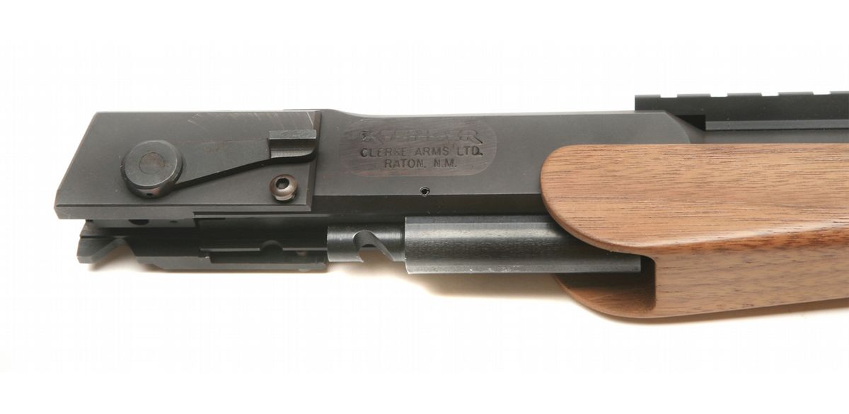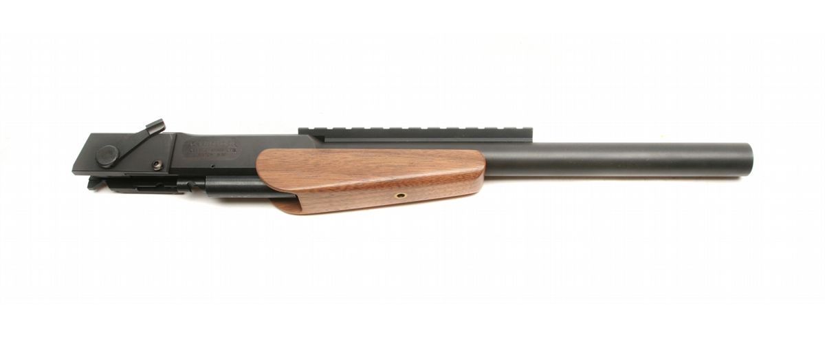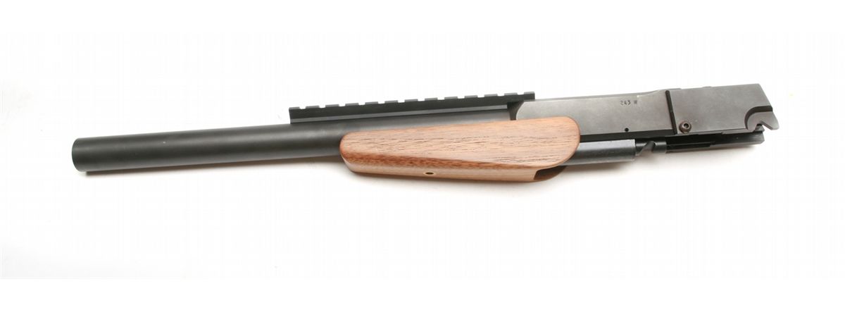 Clerke Xtender barrel unit for Colt 1911 pistols - converts to sho0t single shot 243 ammo - 17" bull barrel with picatinny rail & walnut forearm - like new condition with tool and screws - appears unfired - left side marked 243W - non-ffl - 25VVFKIL123