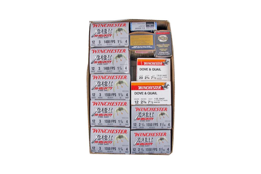 Lot 12 GA Winchester Shotgun Ammo Consists of: Three full boxes 3" 1550FPS #4 shot; two full boxes 3" 1400FPS #4 shot; two full boxes 2 3/4" 1550FPS #4 shot; one full box 2 3/4" 7 1/2 shot for Dove & Quail; one full box 20 Gauge 7 1/2 shot; and threeConsists of: Three full boxes 3" 1550FPS #4 shot; two full boxes 3" 1400FPS #4 shot; two full boxes 2 3/4" 1550FPS #4 shot; one full box 2 3/4" 7 1/2 shot for Dove & Quail; one full box 20 Gauge 7 1/2 shot; and three partial boxes buckshot/turkeyloads.