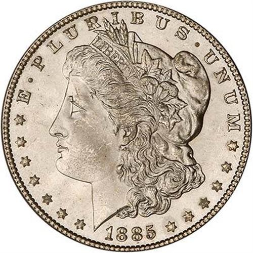1885 Morgan Dollar. Another superb specimen that features a meticulous strike on every device. The otherwise silvery hue blossoms to snowy white radiance from the sharp impress by the dies while the reverse is just as fresh, dazzling, and eye-appealing as the obverse. (#7158)