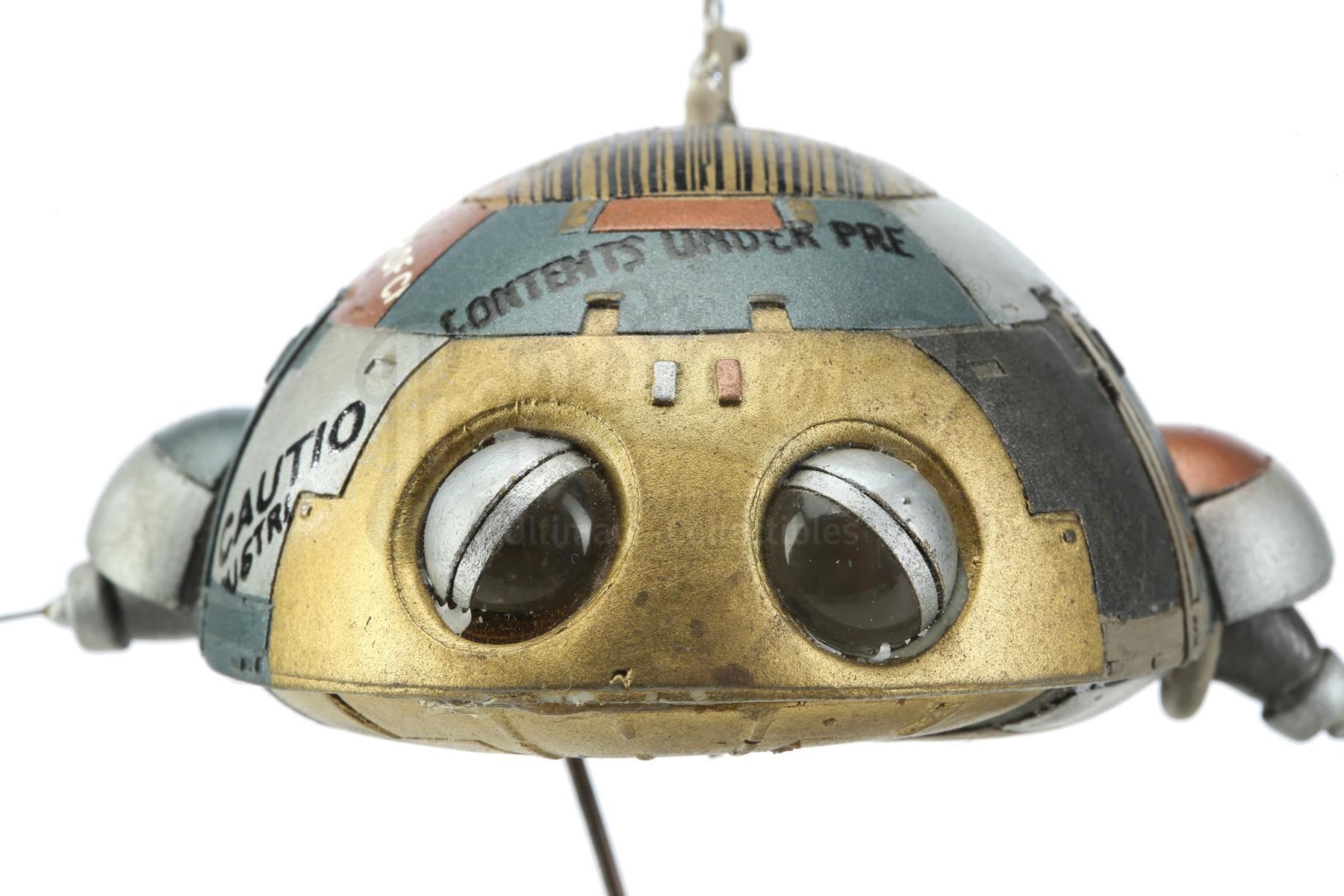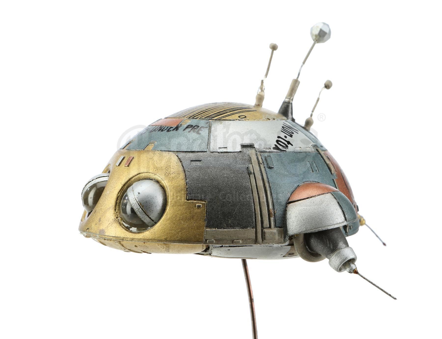 This puppet, created for the film by Industrial Light & Magic (ILM), is constructed of resin hand-painted with the signature patchwork of metallic gold, blue and copper. Several veteran ILM artists contributed to the design of the robots, including Ralph McQuarrie and Paul Huston. The piece is a mounted on a rod for puppeteering and exhibits minor signs of use and handling but remains in good overall condition.