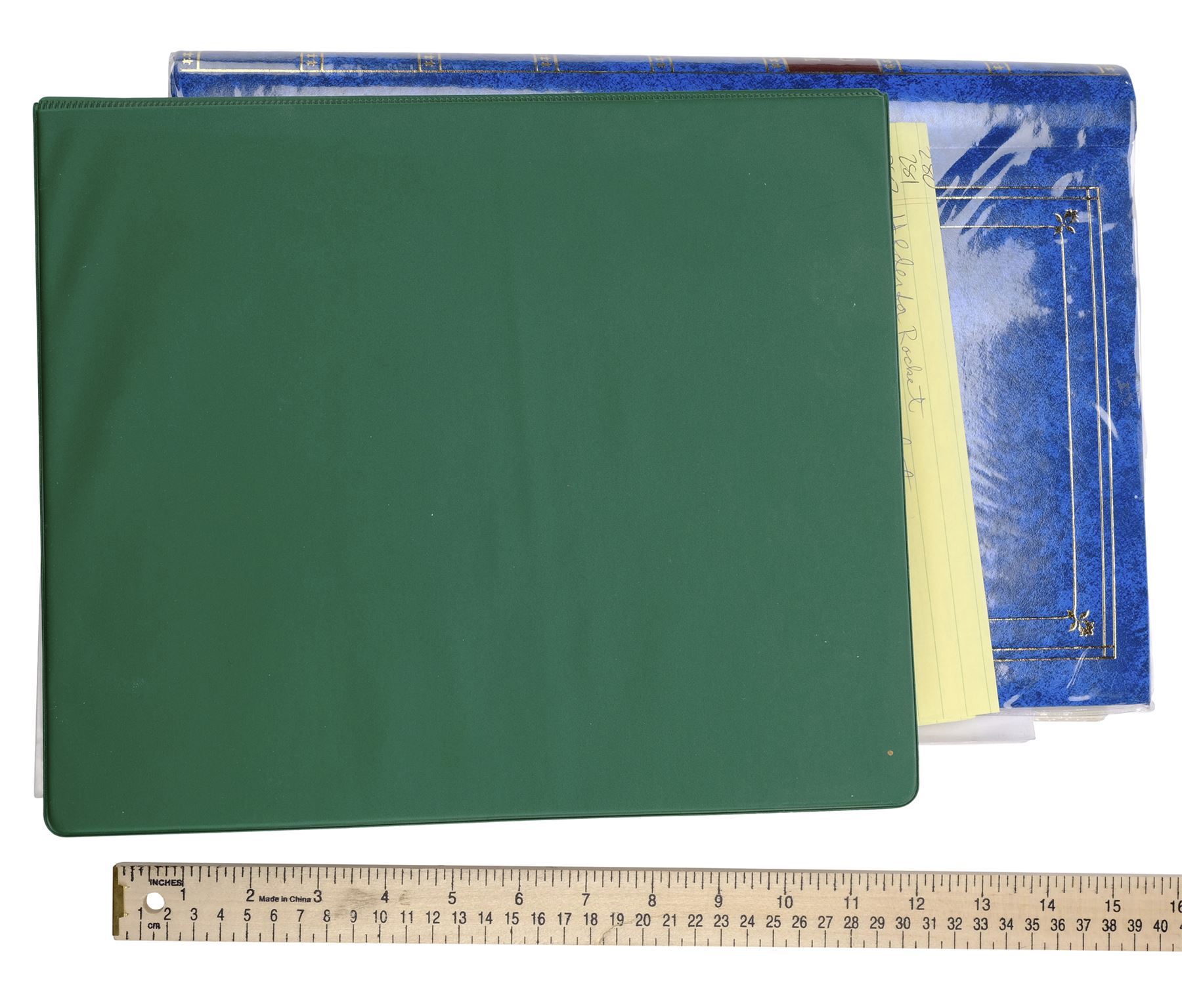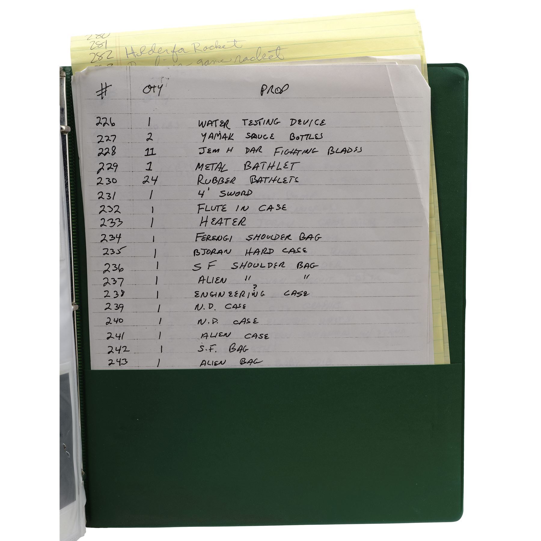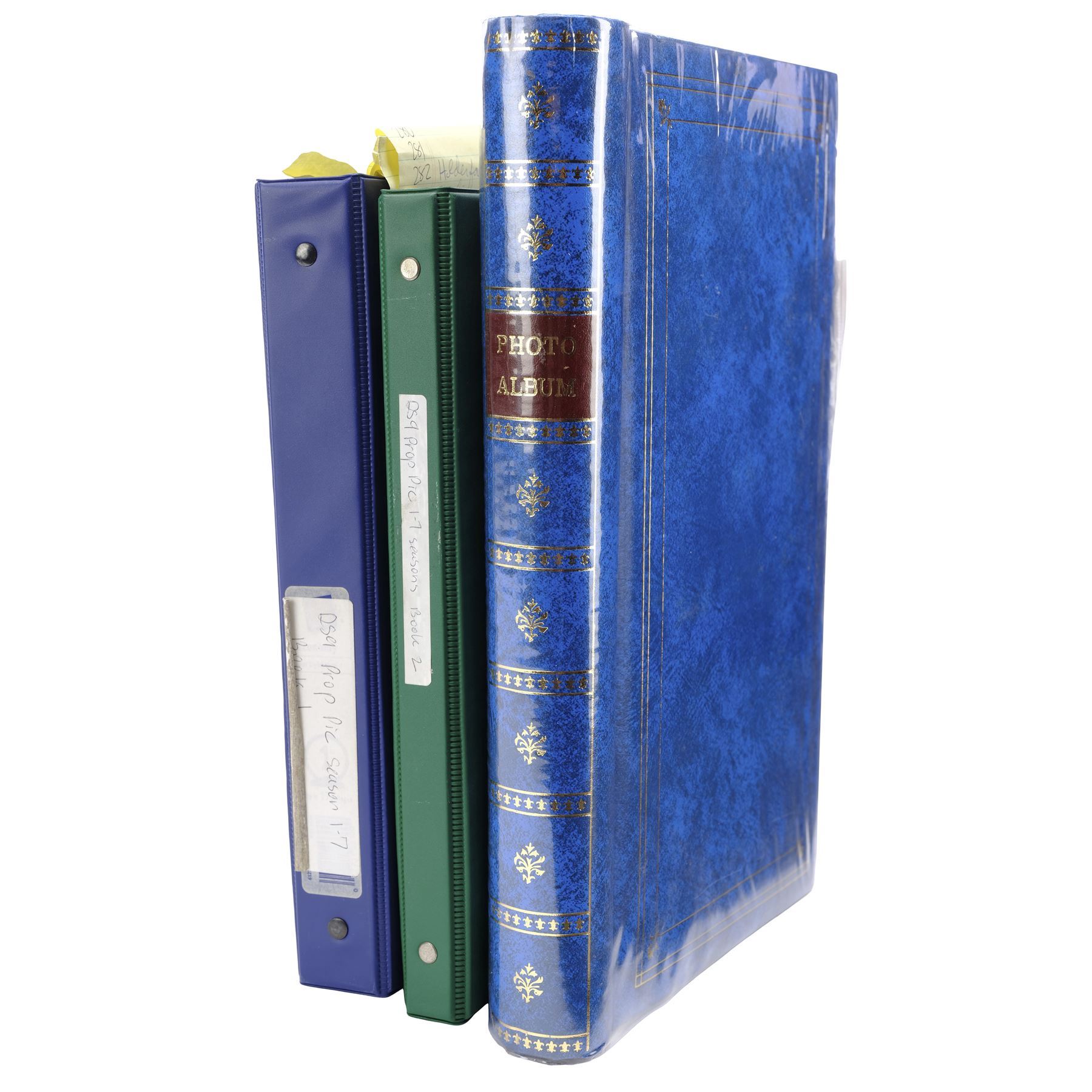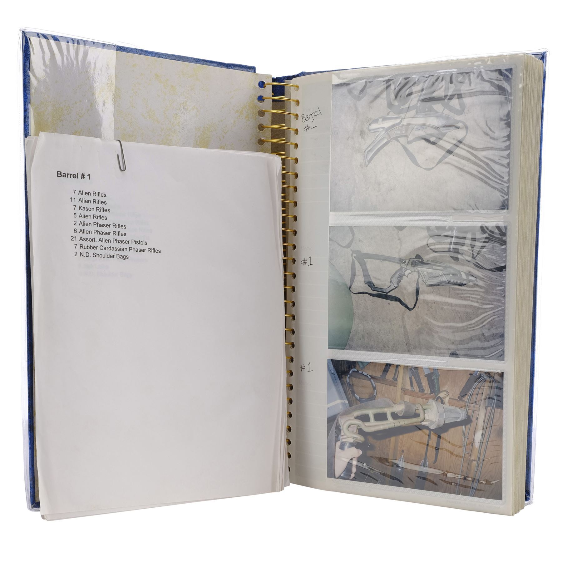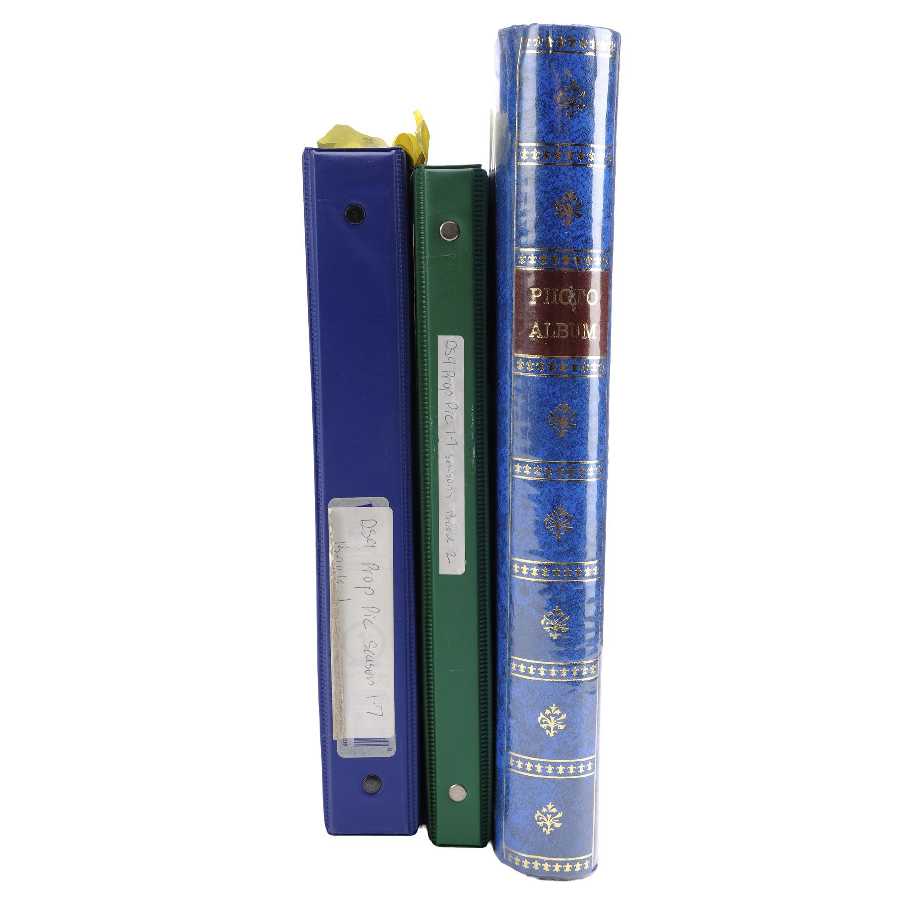 STAR TREK: DEEP SPACE NINE (1993-1999) - Set of Three Prop Reference Photo Books with Notes - Three prop reference photo books with notes from the production of sci-fi series Star Trek: Deep Space Nine. This lot consists of a blue binder labeled "DS9 Prop Pic Season 1-7" containing 184 photographs and 16 printed and four handwritten pages of prop department notes; a green binder labeled "DS9 Prop Pic 1-7 Seasons Book 2" containing 129 photographs and three printed and two handwritten note pages; and a blue album containing 242 photographs from various Strek Trek series and 17 printed note pages. The notes exhibit crumpling throughout. Dimensions: (largest) 10" x 14" x 2" (25.5 cm x 35.75 cm x 5.25 cm)