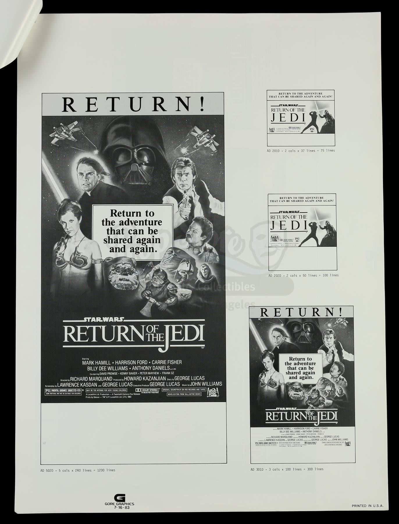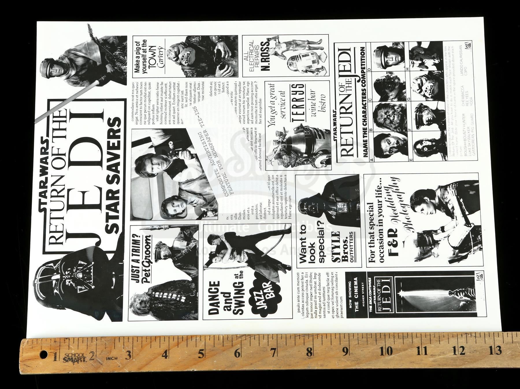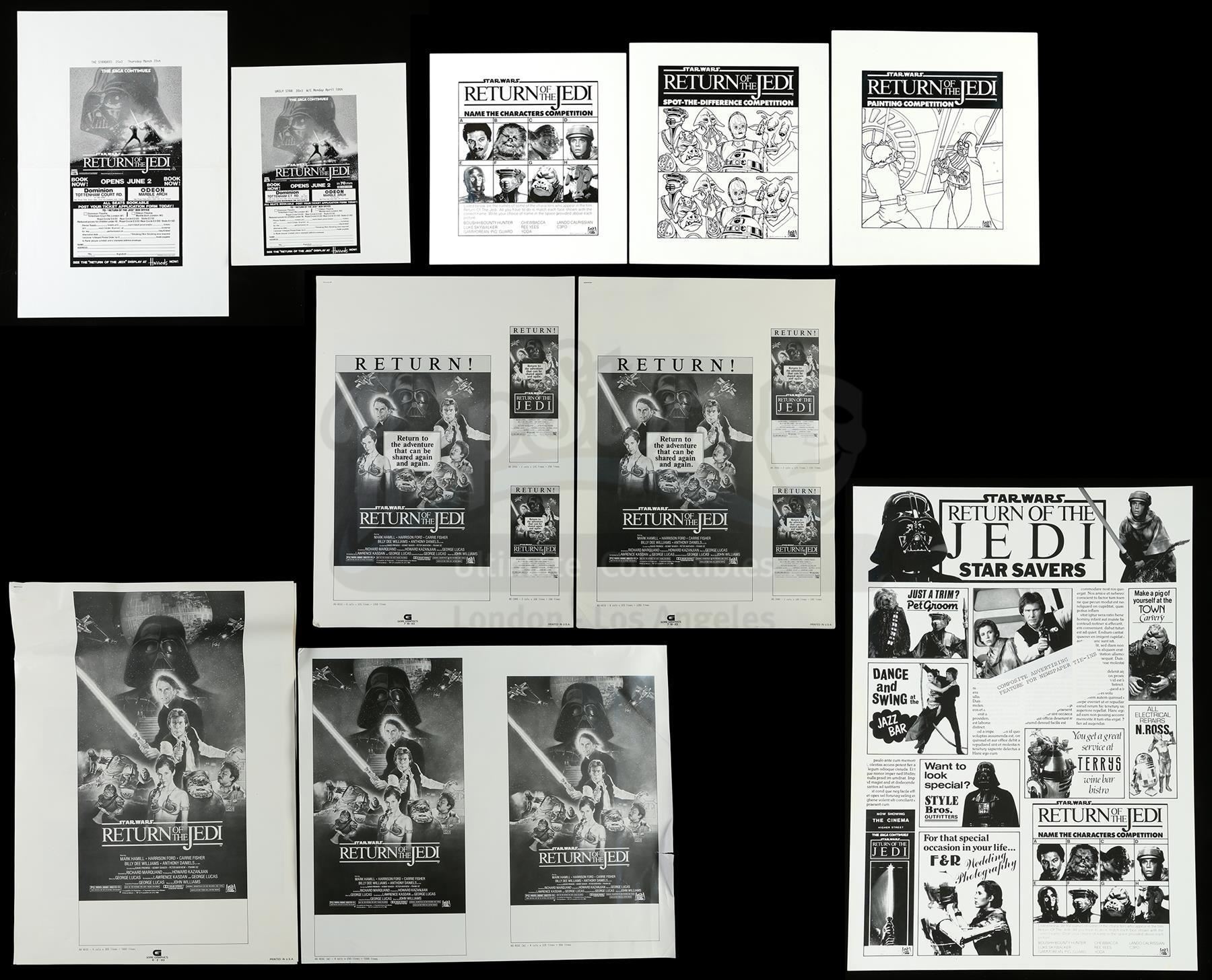 This lot will be auctioned on Thursday, July 1st. The auction will begin at 9:00am PDT and lots are sold sequentially via live auctioneer; tune in to the live streaming broadcast on auction day to follow the pace. Note other lots in the auction may close on June 29th or June 30th. Ad slicks and promo proofs for Richard Marquand's Star Wars: Return of the Jedi. This set of promotional material comes from the collection of producer Howard Kazanjian. It consists of three Lucasfilm print ad design proofs for "Name The Characters," "Spot-The-Difference," and "Painting" competitions; a 20th Century Fox newspaper tie-in design proof; two stapled sets of theatrical release ad slicks featuring ROTJ poster artwork; two slicks for ads in the Daily Star; and three additional theatrical release slicks. The set is in good overall condition with various signs of wear throughout, including tears, printing defects, and discoloration. Dimensions (largest): 23" x 19" (57.5 cm x 47.5 cm); (smallest): 9" x 8" x 1" (22.5 cm x 20 cm x 2.5 cm) Estimate: $400 - 600
