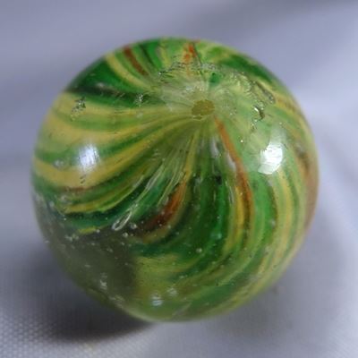 Shrunken core. Yellow subsurface layer with green and pink skin. One small blown airhole. Beauty. Germany, circa 1860-1920. 25/32". Mint(-) (9.2).