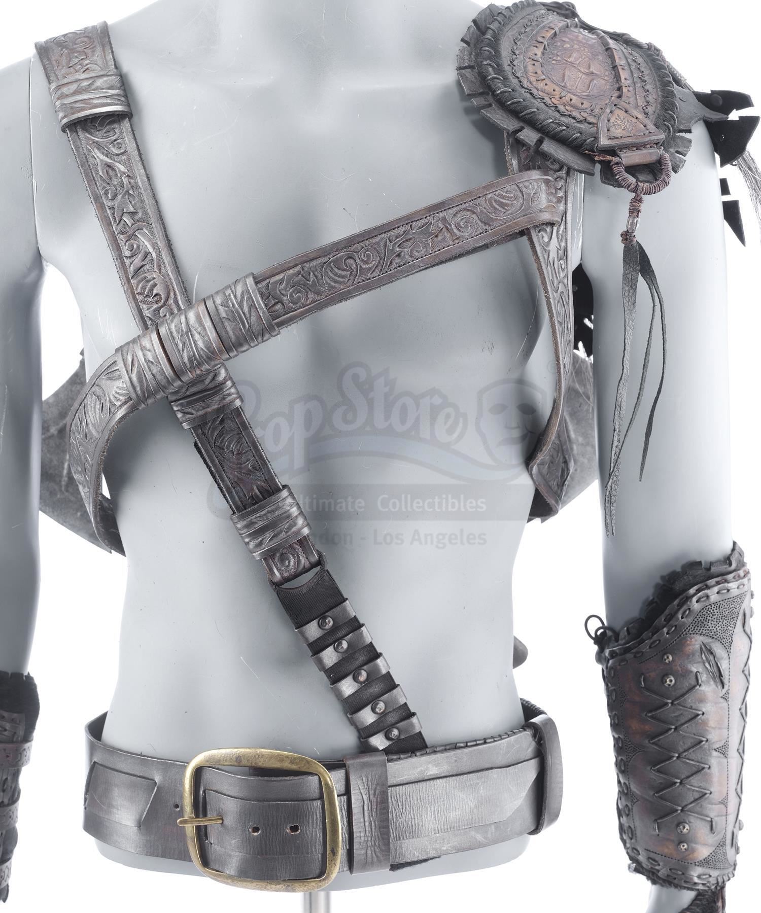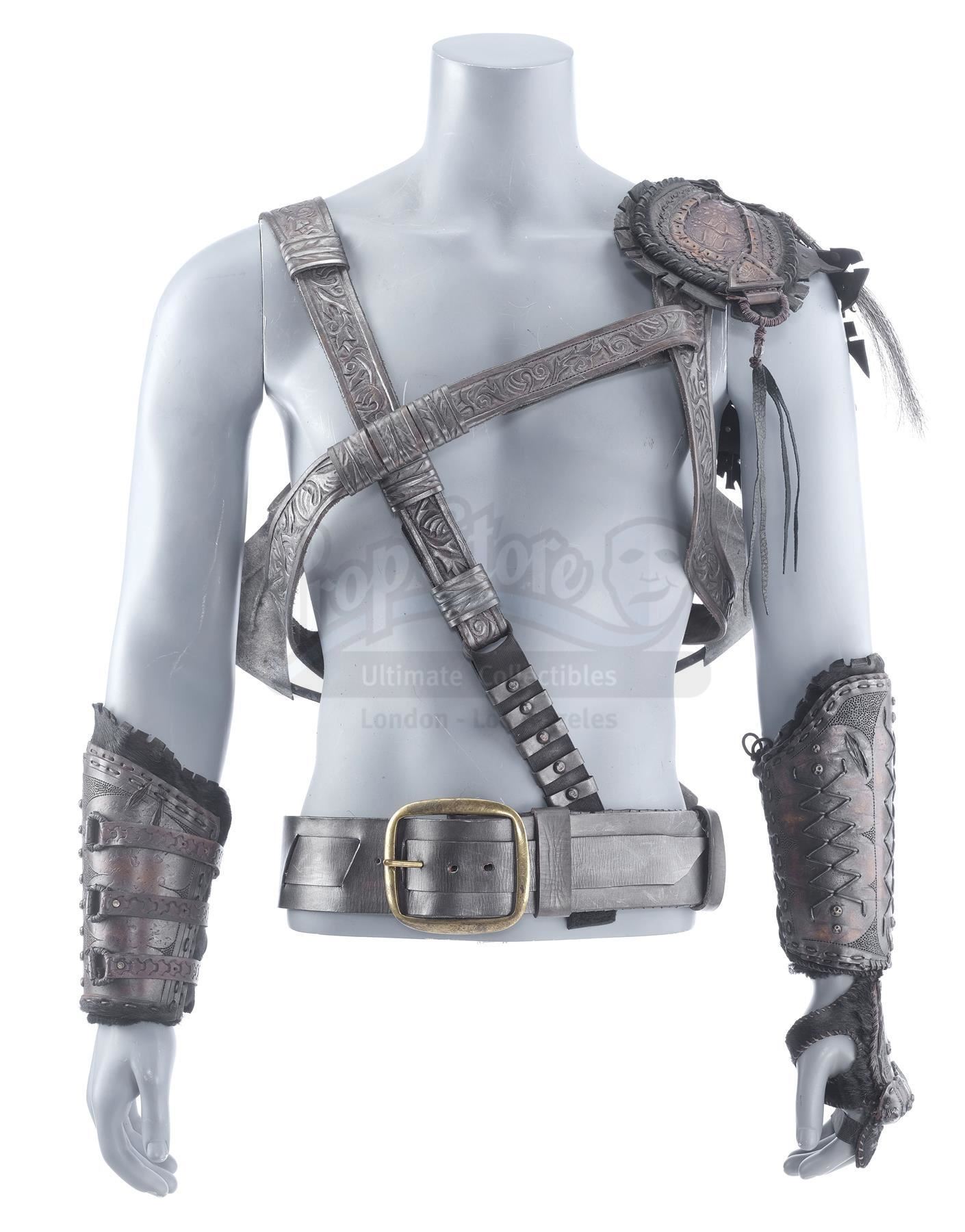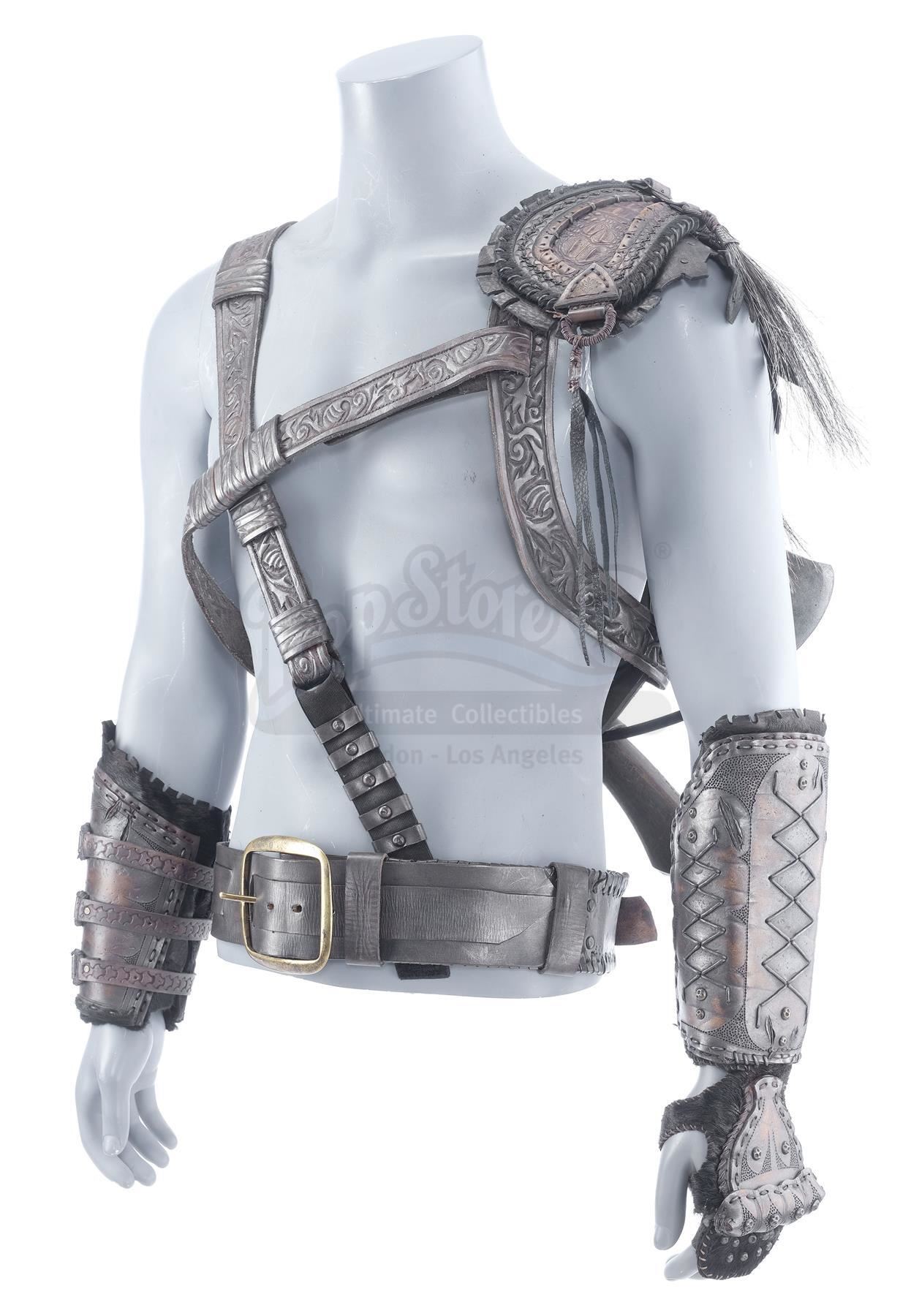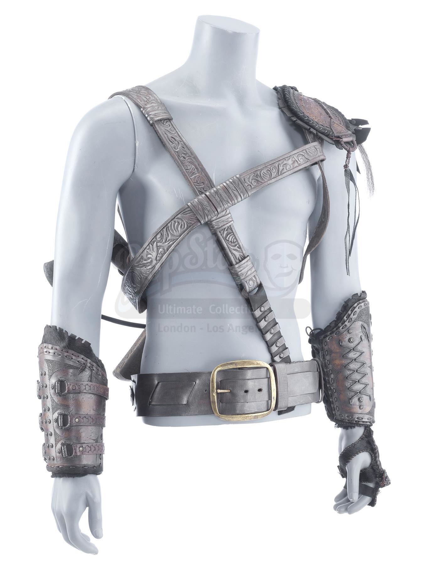 This lot will be auctioned on Tuesday, June 29th. The auction will begin at 9:00am PDT and lots are sold sequentially via live auctioneer; tune in to the live streaming broadcast on auction day to follow the pace. Note other lots in the auction may close on June 30th or July 1st. Eric's (Chris Hemsworth) hero armor and axes from the dark fantasy film The Huntsman: Winter's War. Eric used his armor and axes when he battled against the wicked aims of Ice Queen Freya (Emily Blunt) and her sister Ravenna (Charlize Theron). The lot consists of a chest and belt harness, a pair of axes, and a set of leather bracers. The leather harness features intricate detailing and a stitched leather pauldron on the left shoulder. It is fixed to a wide leather belt with a brass-color buckle. The foam urethane axes include black metal handguards and have tree symbols engraved at the top of each head; and are finished in shades of silver and brown to resemble wood. Completing the lot are a pair of brown leather bracers. One bracer features buckles for securing, the other elongated bracer includes a handguard. Handwritten labels adhered to the bracers note them as "Hero 2" and "Chris Eric." The lot shows minimal signs of wear from production use and remains in great overall condition. Dimensions: 23" x 18" x 8" (58 cm x 46 cm x 20 cm) Estimate: $5,000 - 7,000