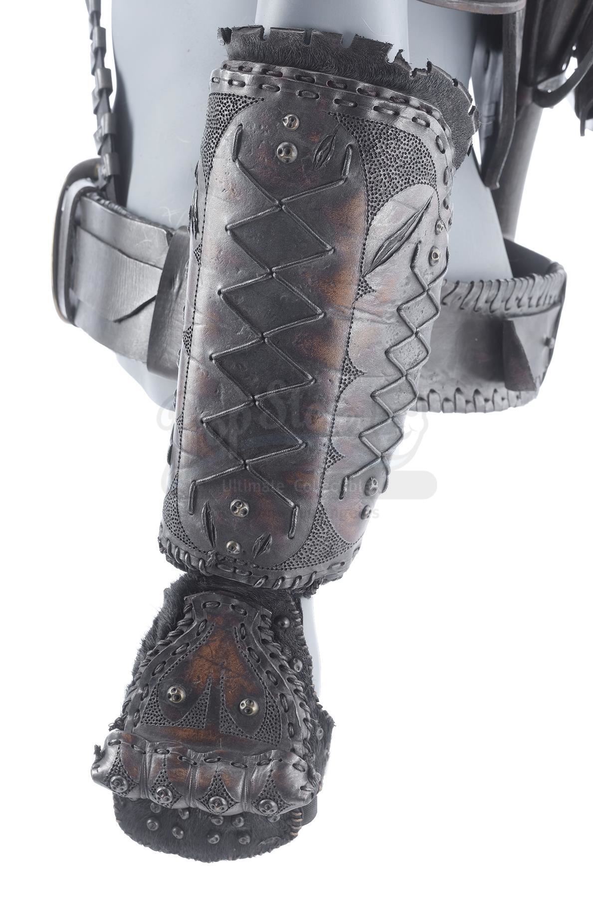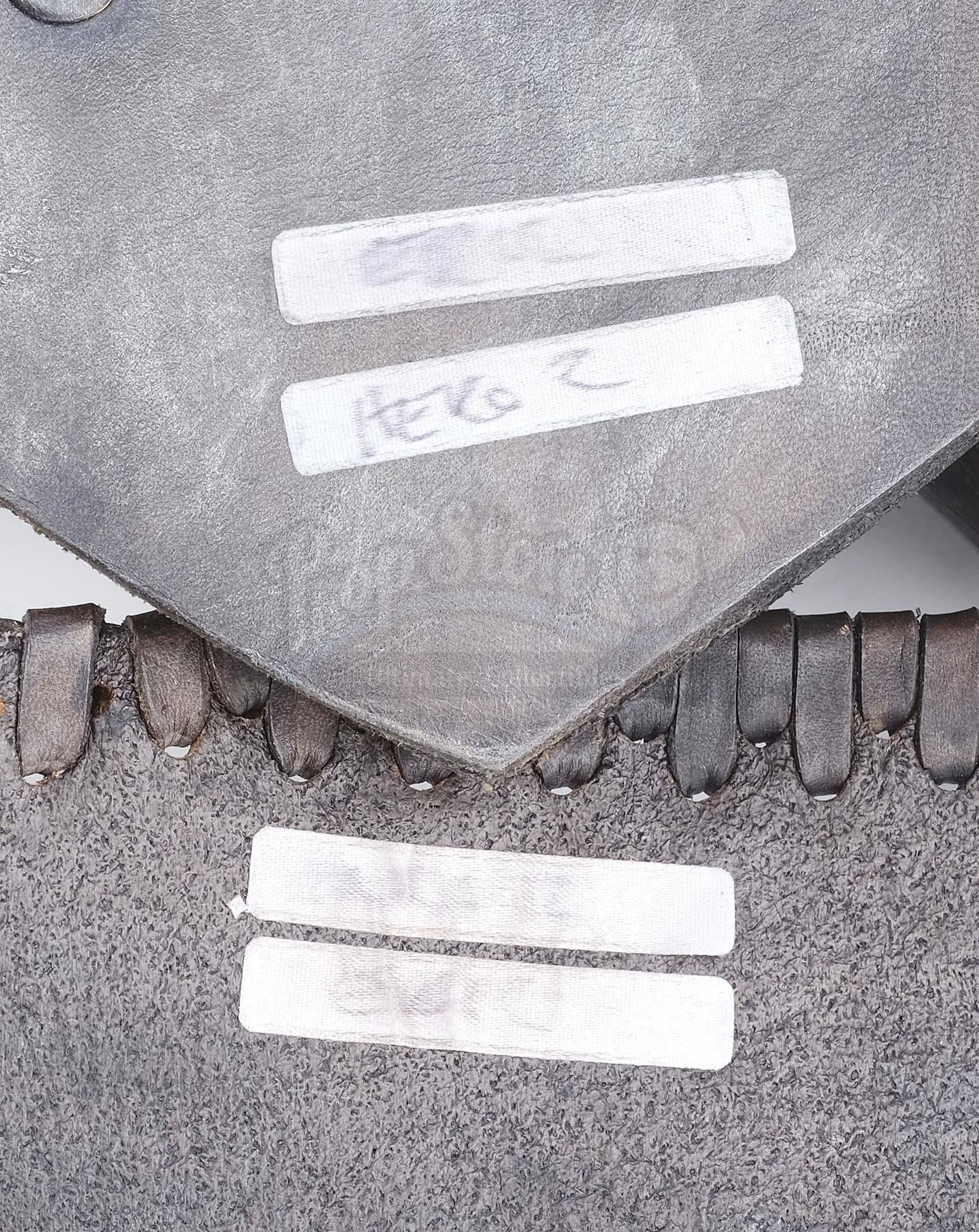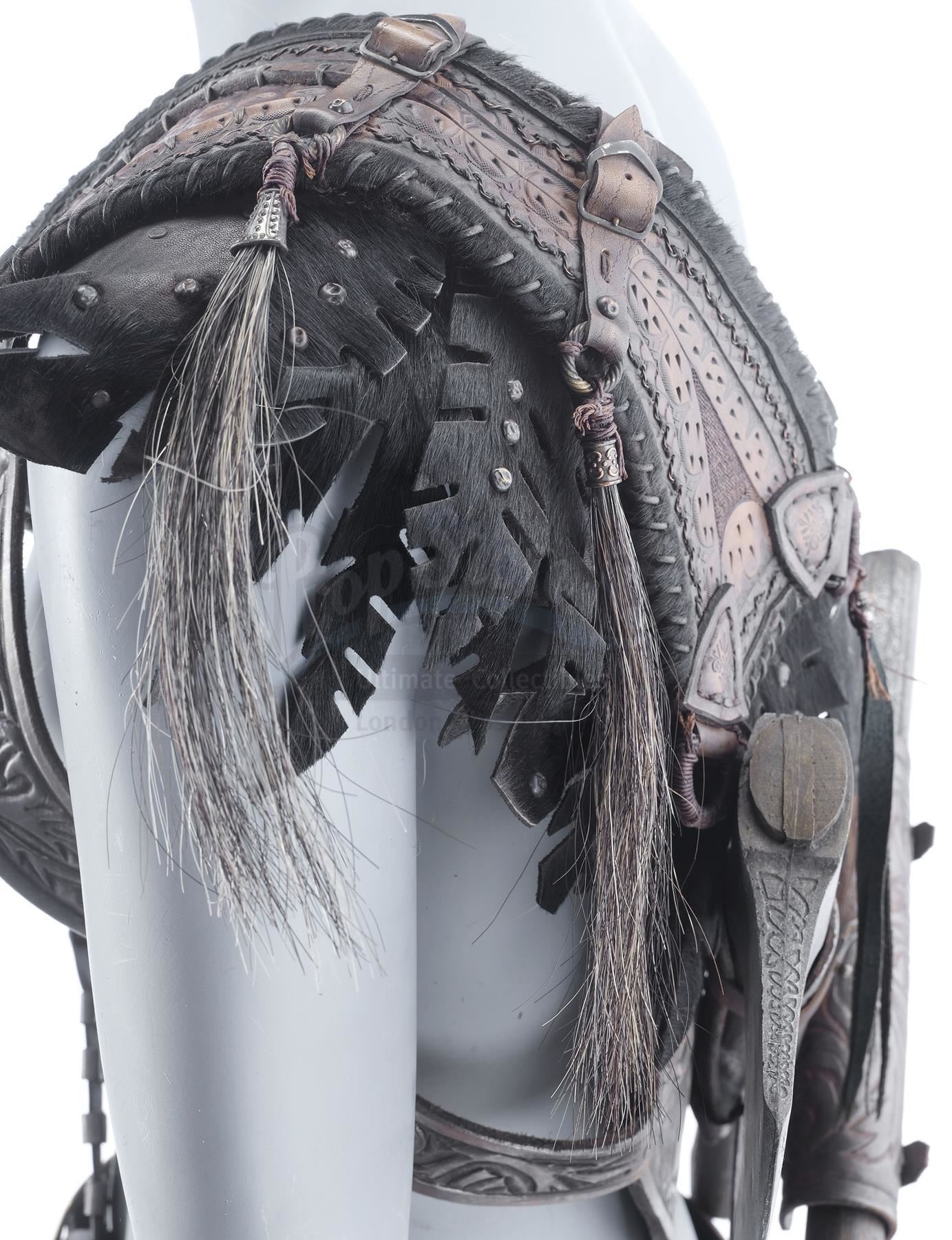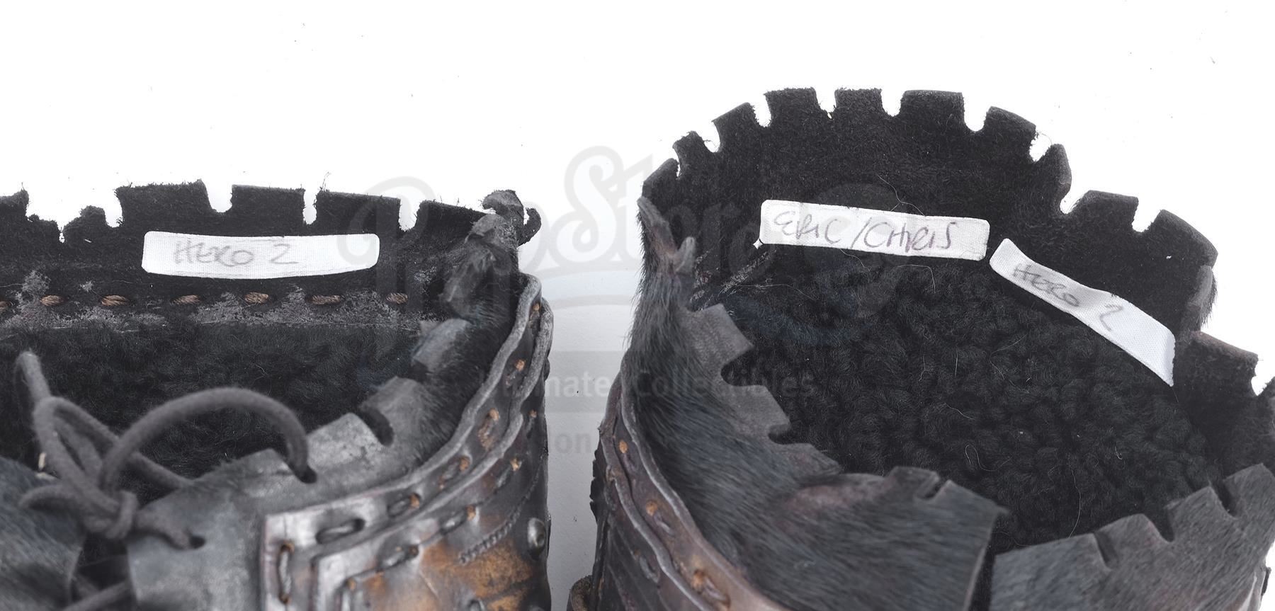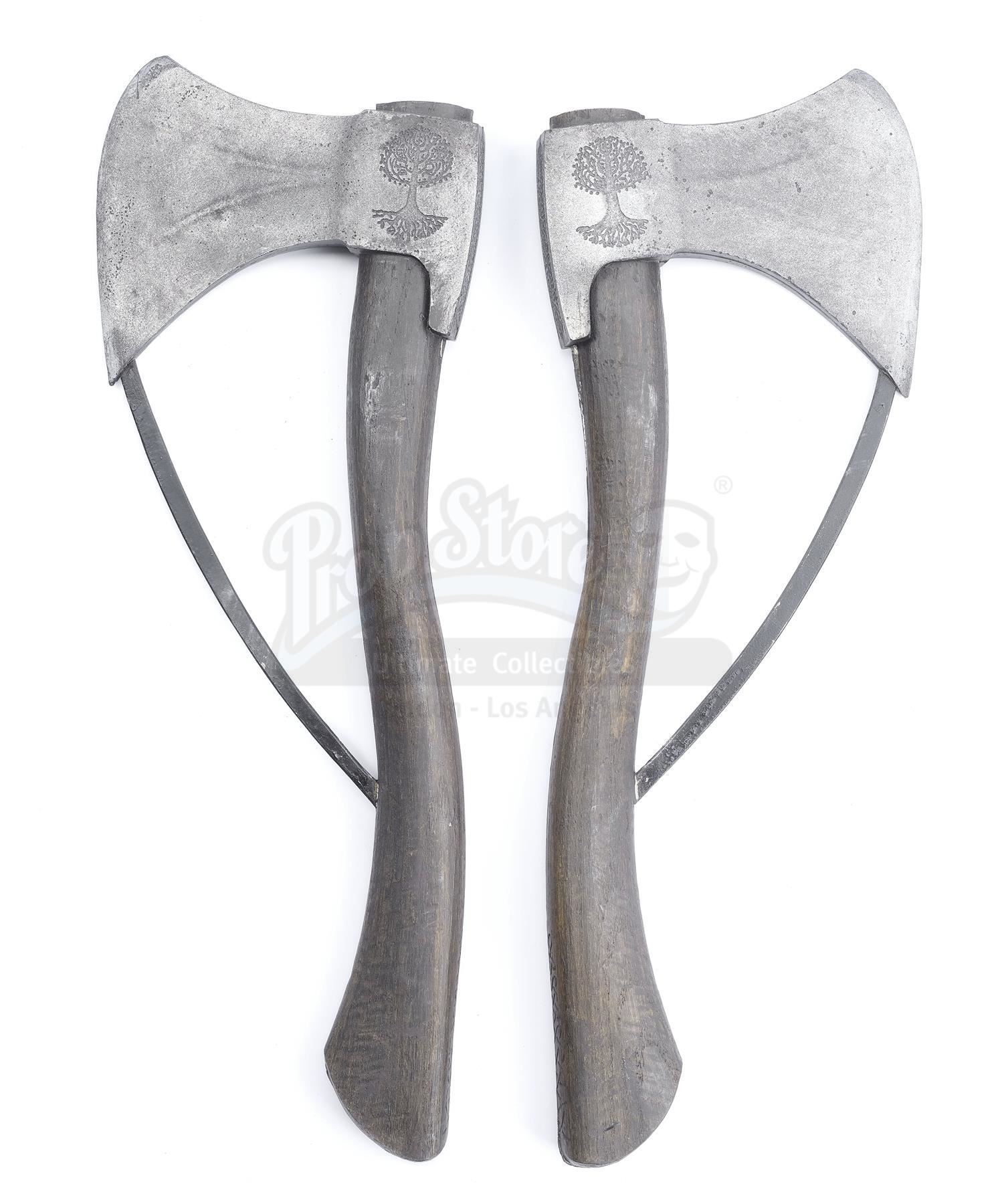 This lot will be auctioned on Tuesday, June 29th. The auction will begin at 9:00am PDT and lots are sold sequentially via live auctioneer; tune in to the live streaming broadcast on auction day to follow the pace. Note other lots in the auction may close on June 30th or July 1st. Eric's (Chris Hemsworth) hero armor and axes from the dark fantasy film The Huntsman: Winter's War. Eric used his armor and axes when he battled against the wicked aims of Ice Queen Freya (Emily Blunt) and her sister Ravenna (Charlize Theron). The lot consists of a chest and belt harness, a pair of axes, and a set of leather bracers. The leather harness features intricate detailing and a stitched leather pauldron on the left shoulder. It is fixed to a wide leather belt with a brass-color buckle. The foam urethane axes include black metal handguards and have tree symbols engraved at the top of each head; and are finished in shades of silver and brown to resemble wood. Completing the lot are a pair of brown leather bracers. One bracer features buckles for securing, the other elongated bracer includes a handguard. Handwritten labels adhered to the bracers note them as "Hero 2" and "Chris Eric." The lot shows minimal signs of wear from production use and remains in great overall condition. Dimensions: 23" x 18" x 8" (58 cm x 46 cm x 20 cm) Estimate: $5,000 - 7,000