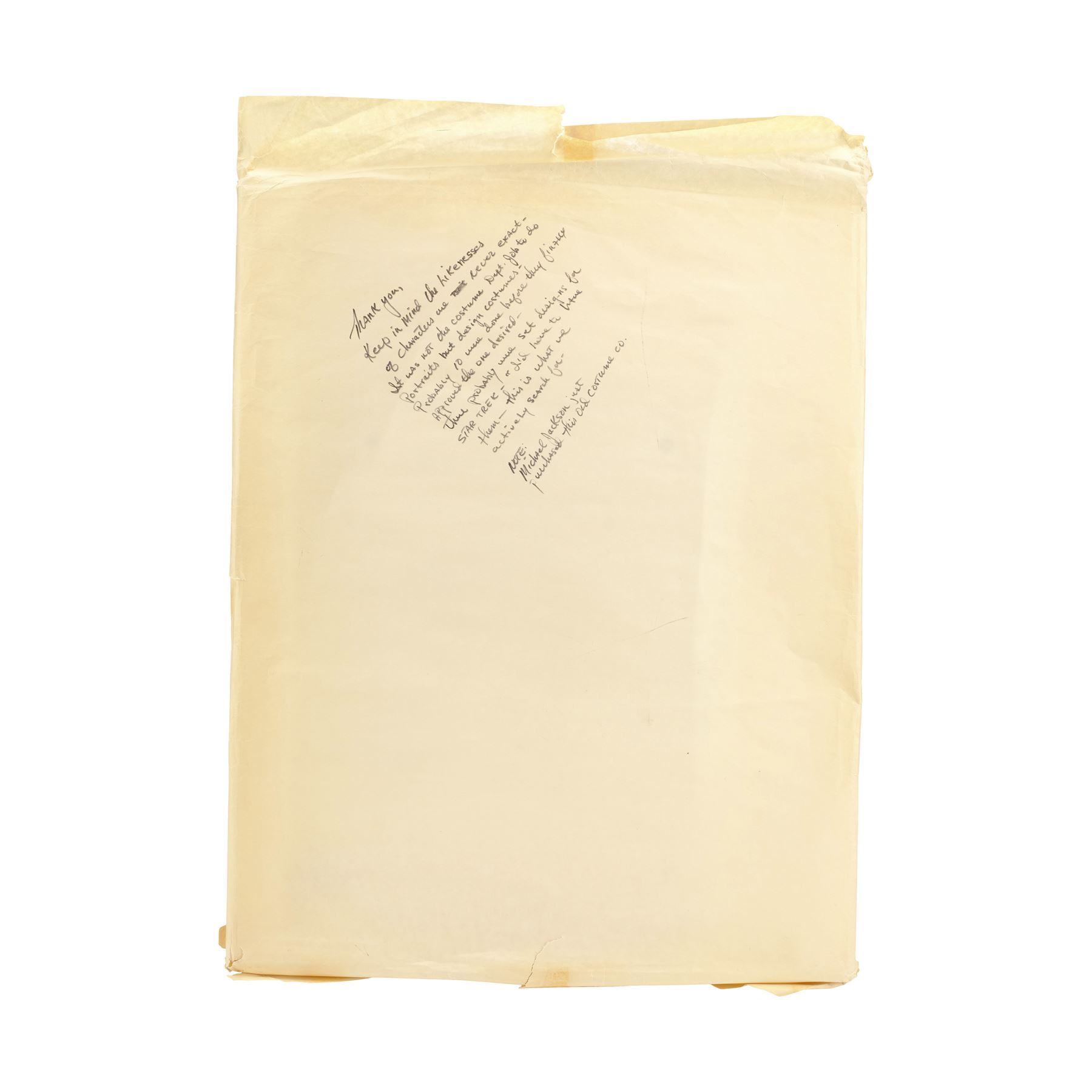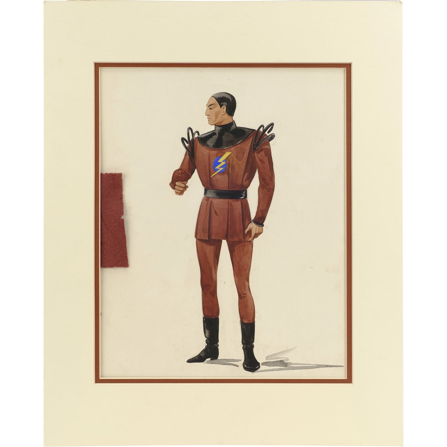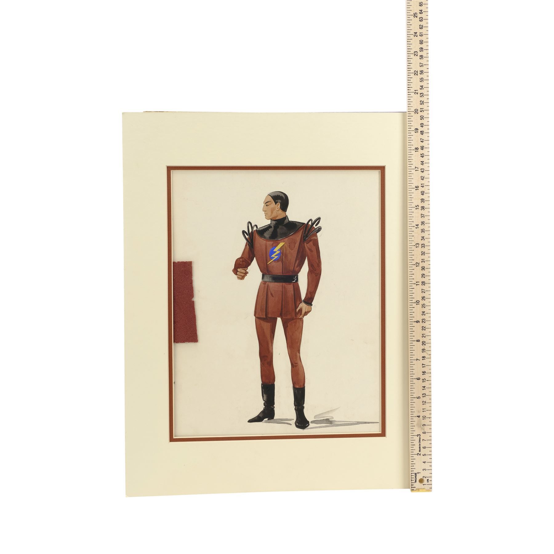 This lot consists of a full-bodied Spock stylized akin to Buck Rogers and Flash Gordon, in a brown uniform with ringed shoulder embellishments and a yellow and blue lightning bolt chest emblem; and is rendered in watercolor paint on illustration board, with handwritten notations and a small fabric swatch; and a paper wrapping for the piece with additional handwriting on it discussing the piece. The artwork is featured inside of a white double mat board with a brown inner edge. This lot exhibits wear from age, including yellowing, ripping, and staining. Dimensions: 16" x 20" x 0.25" (40.75 cm x 51 cm x 0.75 cm)