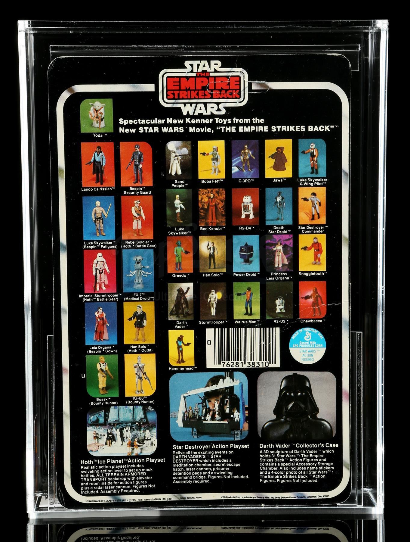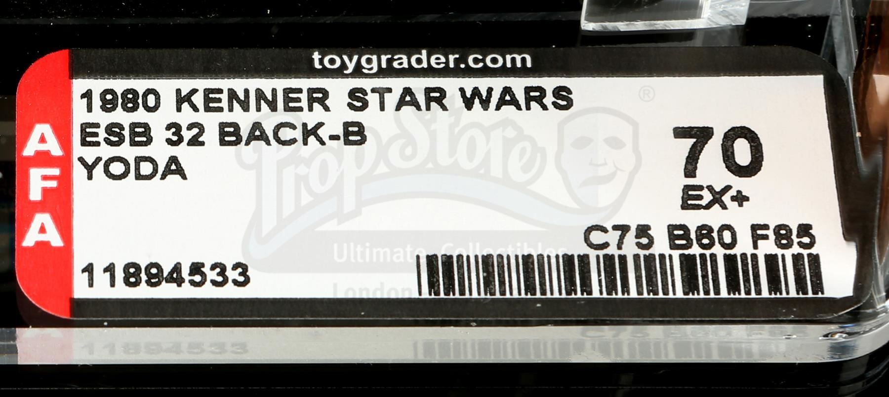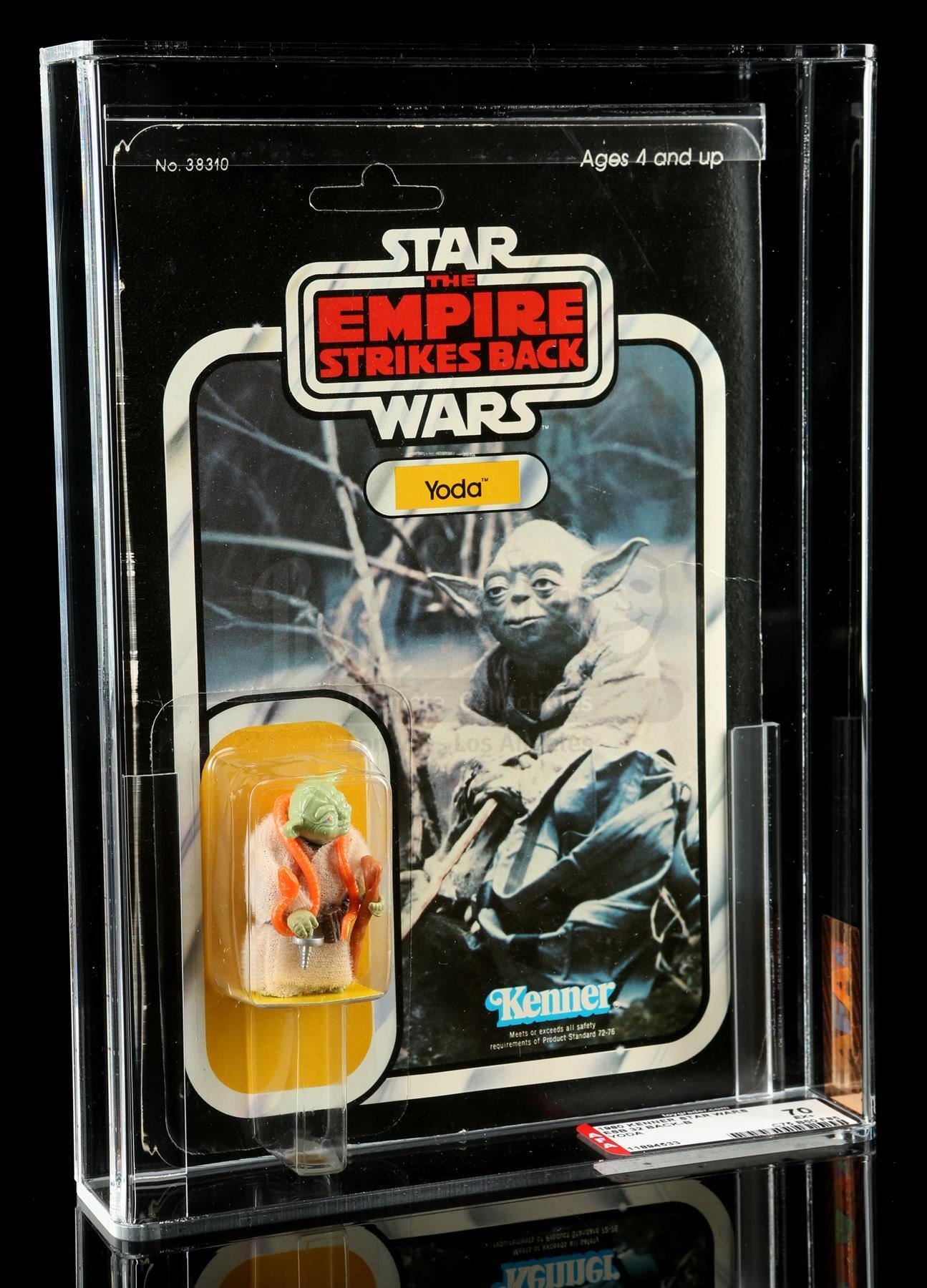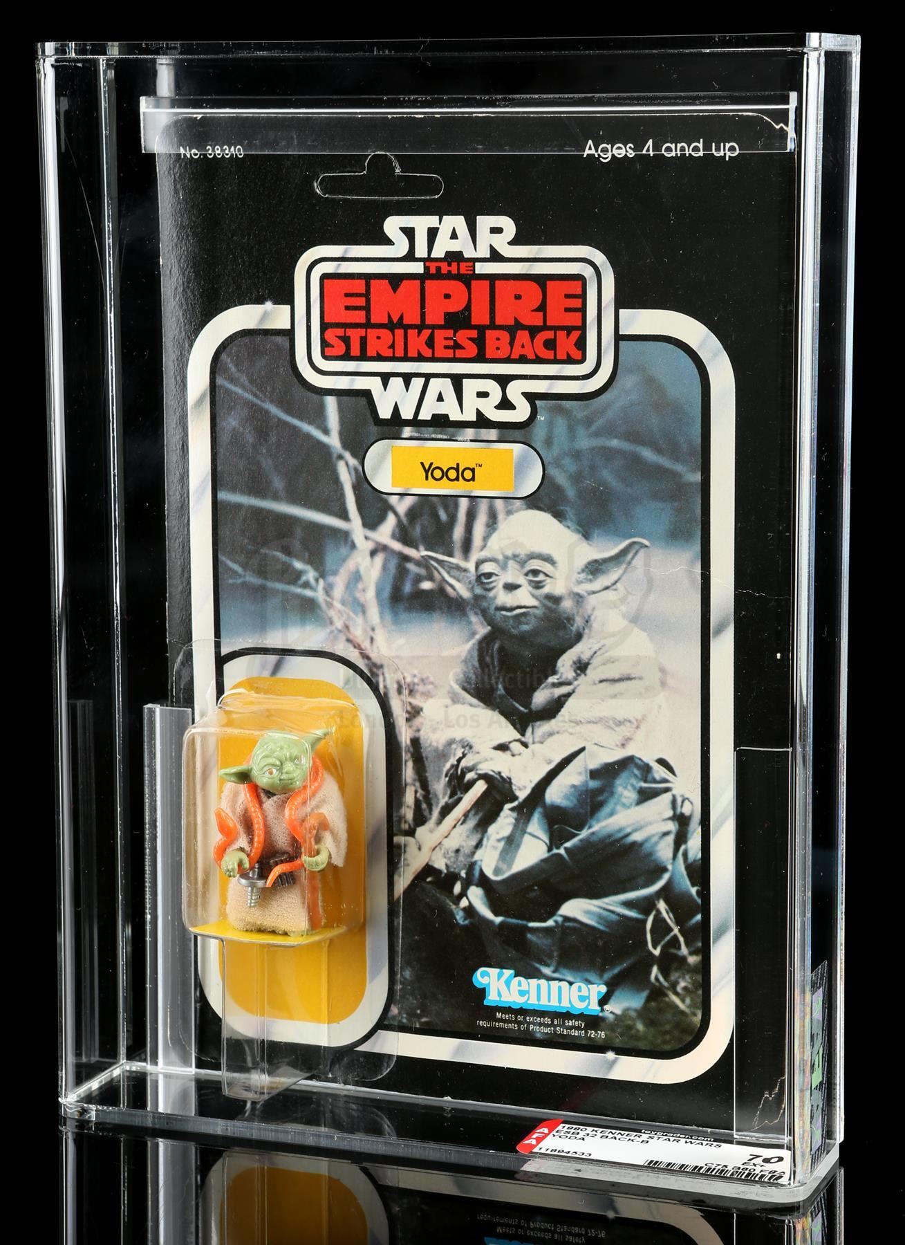 This lot will be auctioned on Thursday, July 1st. The auction will begin at 9:00am PDT and lots are sold sequentially via live auctioneer; tune in to the live streaming broadcast on auction day to follow the pace. Note other lots in the auction may close on June 29th or June 30th. A Yoda (with Orange Snake) AFA 70Y released in conjunction with George Lucas' Star Wars: The Empire Strikes Back. Created by Hasbro in 1980, this AFA 70Y-graded, acrylic-encased Yoda (Orange Snake variant) figure stands 1 3/4" in its original bubble with an unpunched 32 cardback-B and C75, B60, and F85 subgrades. This lot comes from the collection of Return of the Jedi producer Howard Kazanjian. It is in good overall condition with a crease in the middle right side of the cardback. Dimensions: 10" x 8" x 2" (25 cm x 20 cm x 5 cm) Estimate: $400 - 600