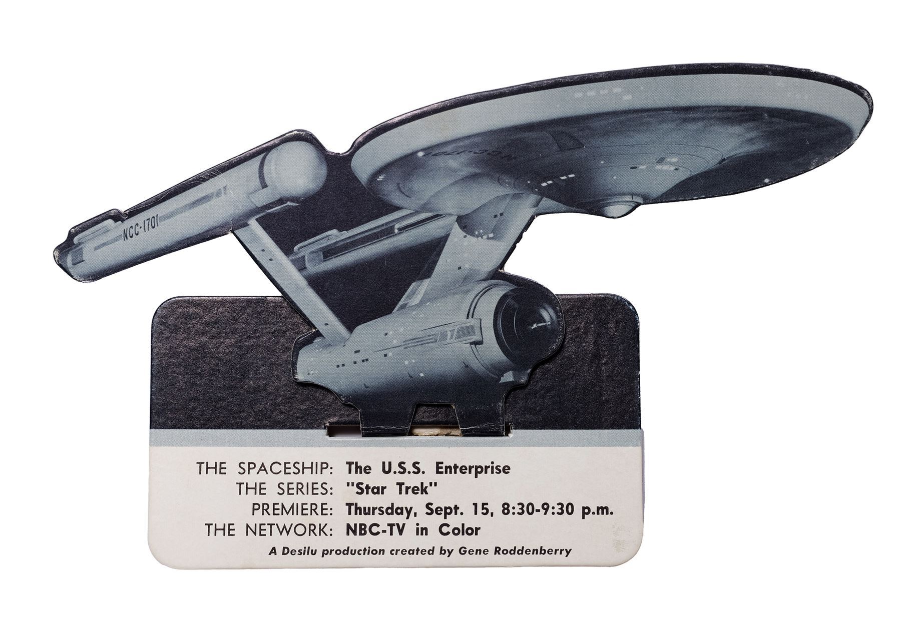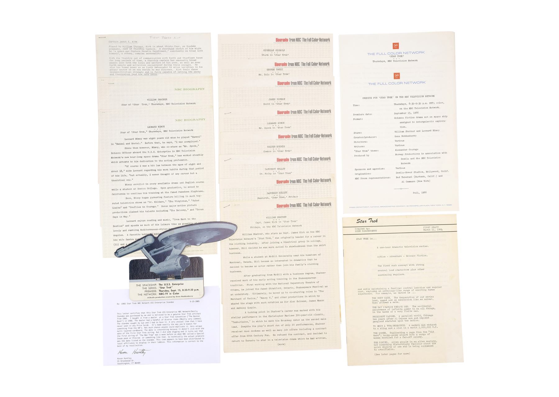 This assemblage of rare promotional items includes a 12-page Advance Information Programming brochure, a colorized three-fold Advance Information Programming brochure on Star Trek for foreign markets, a 6-page brochure advertising Season 2, a 16-page Season 2 "Mail Call" brochure sent to advertisers, 25 typewritten original NBC press releases from all three seasons, a rare black-and-white Enterprise cutout standee for NBC affiliate meetings, and other ephemeral paperworks including note-sized pages with form-letter responses to Star Trek's cancellation sent to impassioned fans. The lot exhibits discoloration, staining, creasing and edgewear, with further protection afforded through protective plastic sleeves. Dimensions: 8.5" x 11" x 0.5" (21.75 cm x 28 cm x 1.25 cm)