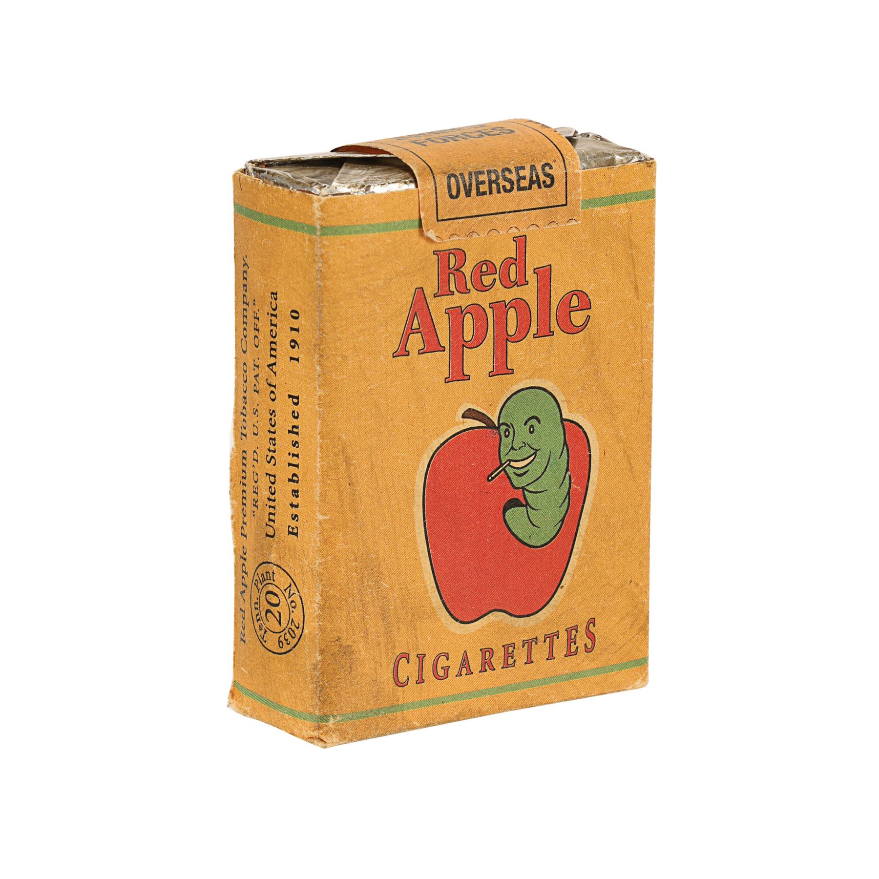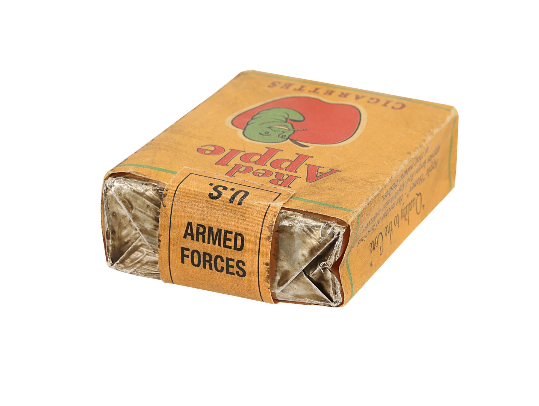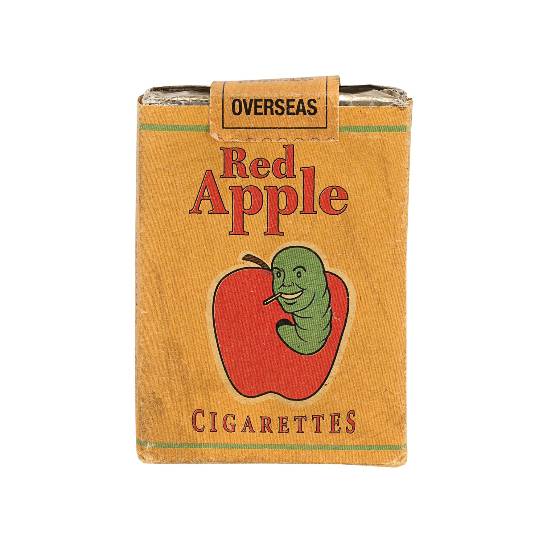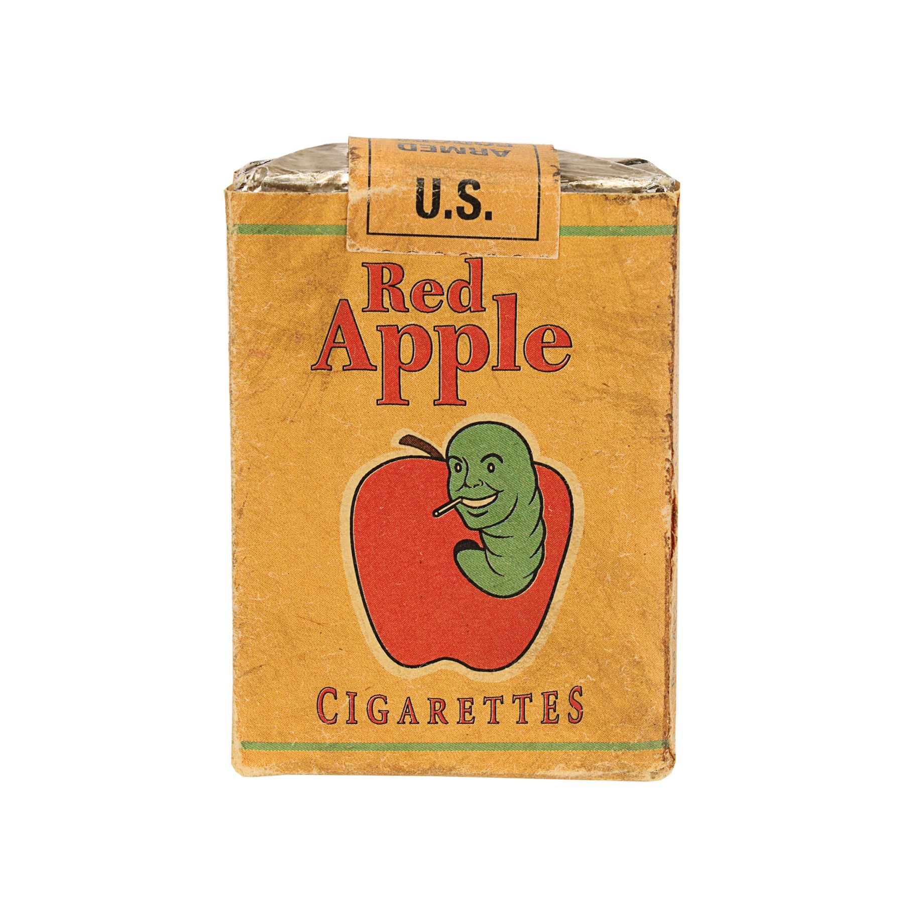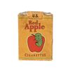 The brown paper pack features the "Red Apple" text and has an illustration of a smiling green worm emerging from a red apple and smoking a cigarette, as well as various product details. A "U.S Armed Forces Overseas" tab on the top remains intact and the silver foil remains closed. The lot displays minor production wear. Dimensions: 7 cm x 5.5 cm x 2 cm (2 3/4" x 2 1/4" x 3/4")