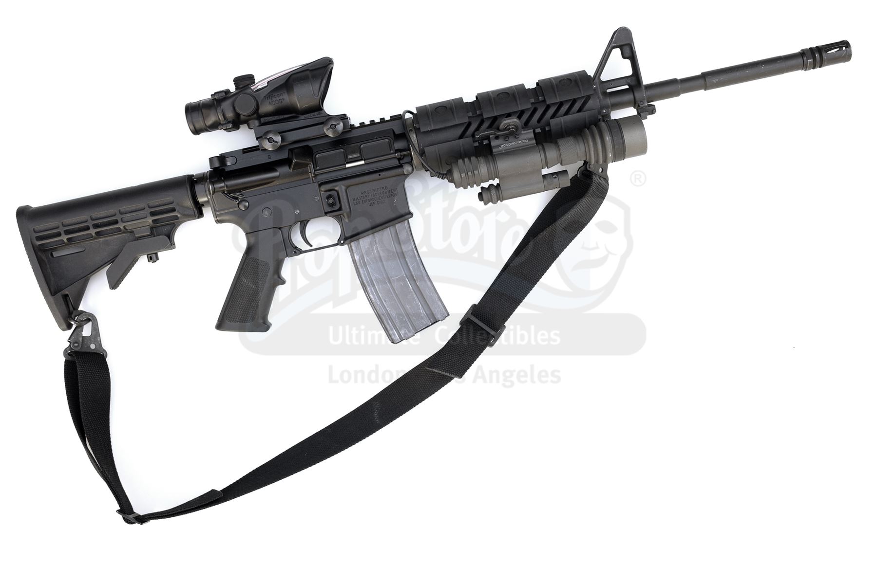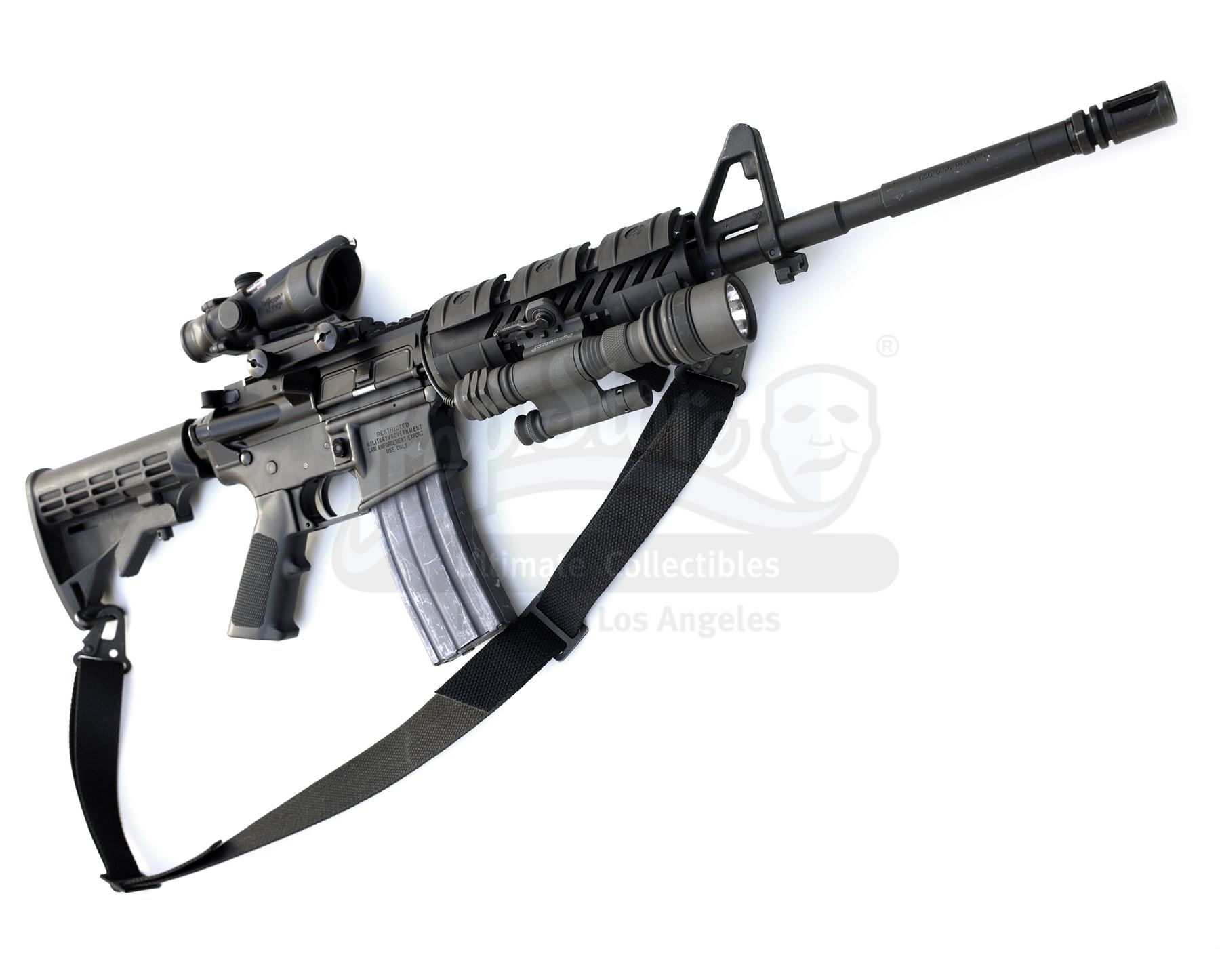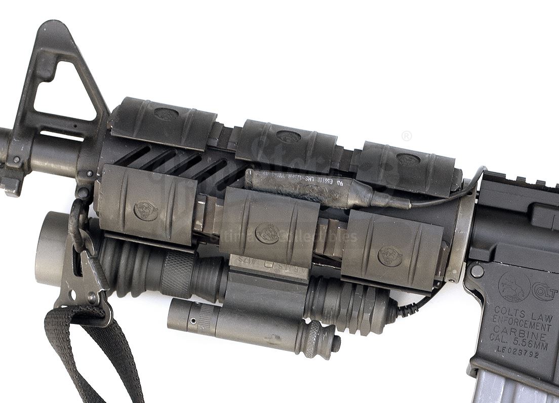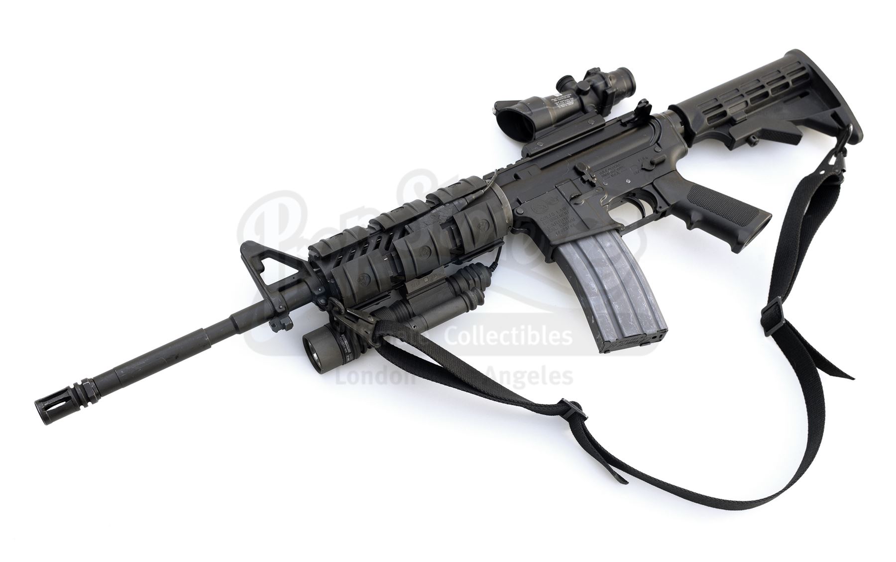 This lot will be auctioned on Tuesday, June 29th. The auction will begin at 9:00am PDT and lots are sold sequentially via live auctioneer; tune in to the live streaming broadcast on auction day to follow the pace. Note other lots in the auction may close on June 30th or July 1st. Robert Neville's (Will Smith) hero blank-firing M4 rifle from Francis Lawrence's sci-fi action thriller I Am Legend. The apparent sole survivor of a virus that transformed humanity into vampire-like zombies known as Darkseekers, Neville carried his M4 rifle throughout the film. The M4 rifle is a genuine Colt firearm in 5.56mm, a semi-automatic civilian version that was modified to fire full-auto for the film and subsequently returned to its original semi-auto state (the changes are to internal components.) The rifle was also modified to fire blanks for the film. As a real firearm, all components are fully functional including the retractable stock, removable magazine, and working switches. The scope is a practical unit with glass optics, and the Surefire flashlight and laser unit mounted to the forearm are practical. The forearm is seen mounted on both sides of the rifle in the film, so it was changed during production. This piece was one of two M4 rifles rented to the production and includes a copy of the rental invoice. As it has been modified to fire blanks for the film industry, the rifle is no longer capable of firing real ammunition and is sold as a collectible item only. The piece is still technically a firearm and thus must be transferred through an FFL dealer to a state where ownership is legal; export to foreign countries may be possible if the rifle is deactivated; please inquire for specific transfer details regardless of location. Dimensions: 32" x 13" x 5" (81.25 cm x 33 cm x 12.75 cm) Live firearm; see firearms notice in the Buyer's Guide. Stored off-site; see off-site storage notice in the Buyer's Guide. Contains electronic components; see notice in the Buyer's Guide. Estimate: $8,000 - 10,000