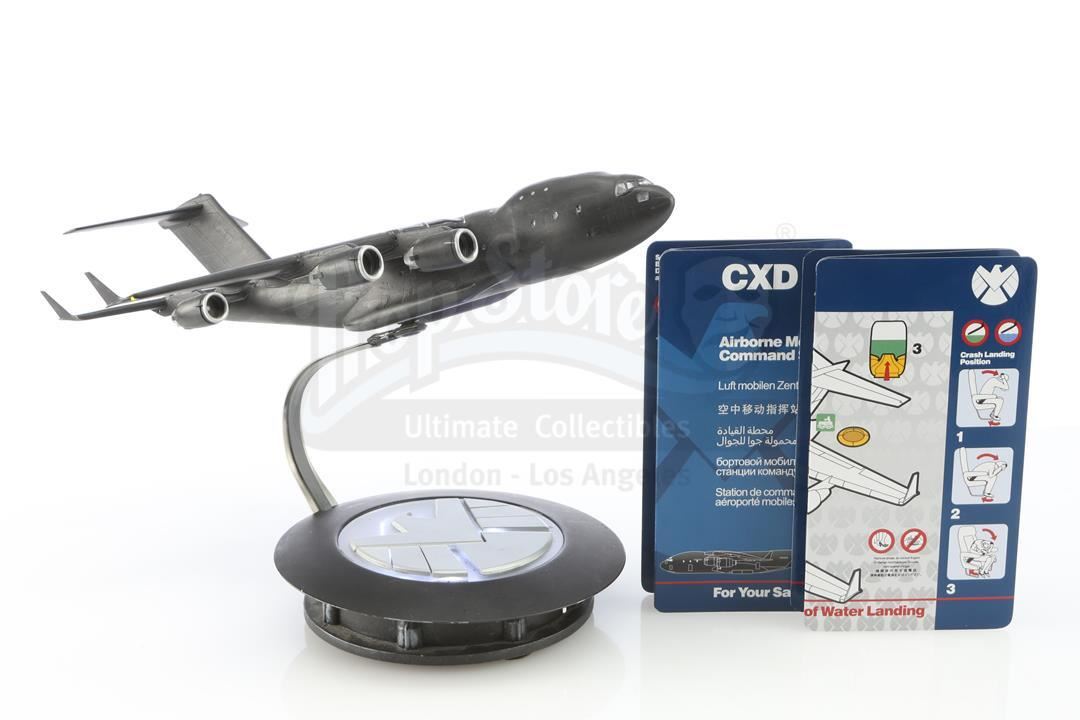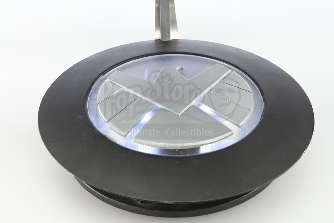 A light-up model of The Bus with two safety pamphlets from Seasons 1 through 3 of Marvel's Agents of S.H.I.E.L.D. Throughout the seasons, a model of the advanced CXD 23215 Airborne Mobile Command Station sits on a desk in Phil Coulson's offices, first on The Bus itself and later in S.H.I.E.L.D. headquarters. This lot consists of a pair of blue, white, yellow and green fold-out laminated cardstock pamphlets and a charcoal-colored resin and acrylic model miniature with transparent urethane windows, metal-colored details and a S.H.I.E.L.D. symbol on the top. It is attached via an aluminum stand to a battery-operated black metal and urethane base with a translucent urethane S.H.I.E.L.D. symbol top which can be illuminated by flipping a switch on the base. It is in good overall condition with some wear from production including damage to the fin on the left wing, some detachment on the left tail wing and separation at the top of the base section. This item contains electronic and mechanical components. While every effort is made to describe them accurately, no guarantee or warranty is made as to the functionality, lifespan or safety of those components. It is entirely incumbent on the new owner to satisfy themselves as to their safe use and maintenance.
