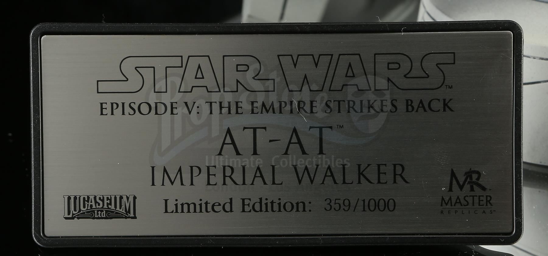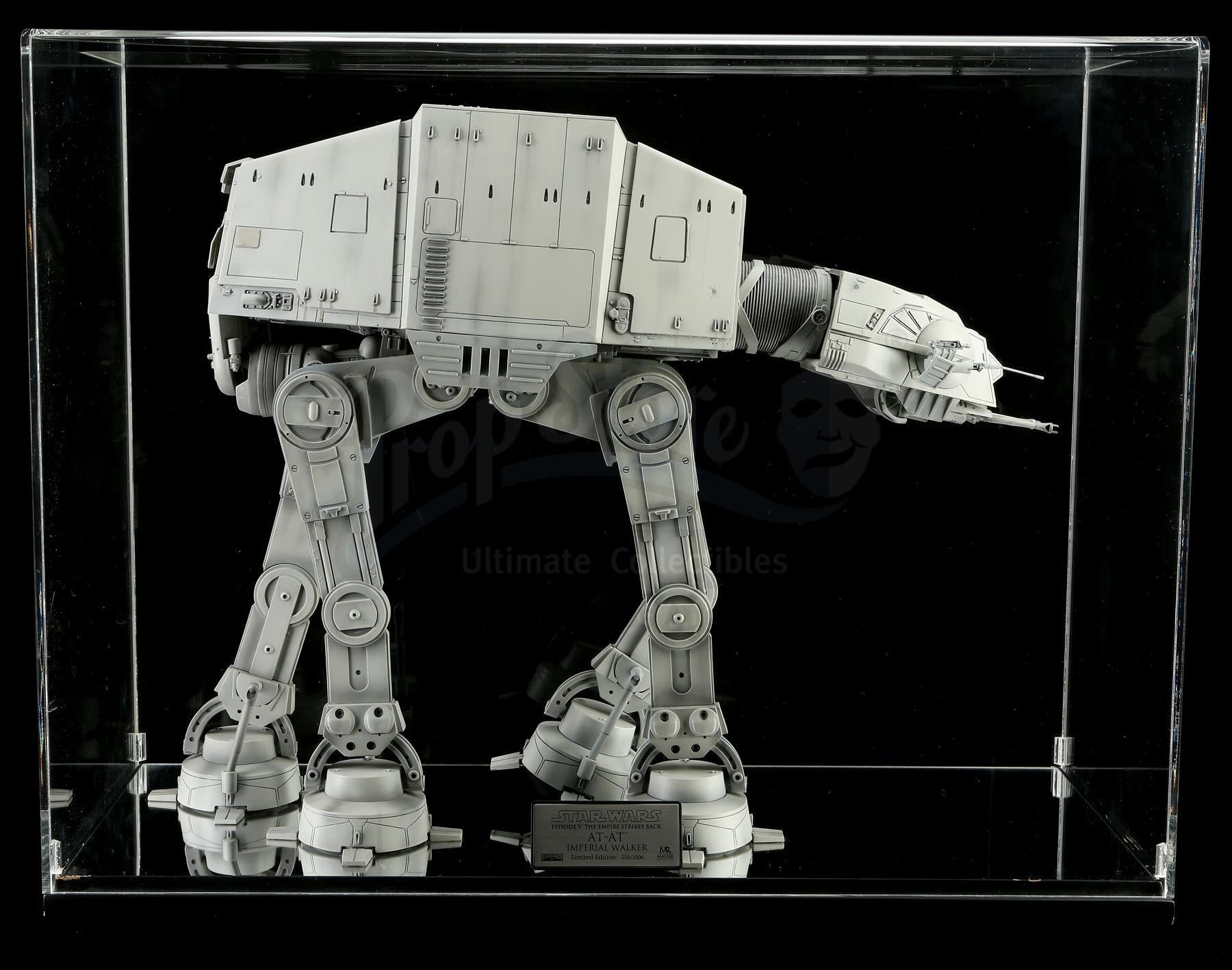 This lot will be auctioned on Thursday, July 1st. The auction will begin at 9:00am PDT and lots are sold sequentially via live auctioneer; tune in to the live streaming broadcast on auction day to follow the pace. Note other lots in the auction may close on June 29th or June 30th. A Master Replicas AT-AT Imperial Walker from the promotion of Irvin Kershner's Star Wars: The Empire Strikes Back. Master Replicas based this limited-edition 2004 release on the 19" AT-AT studio models from the Lucasfilm Archives. Like the original Imperial Walker model, this replica's head and body is cast from high-quality resin. To ensure intricate detail and durability, many parts have been reproduced from injection-molded plastic. The legs are made from solid, high-strength thermo-plastics and die-cast metal for long-term durability. The model comes in a custom acrylic display case with a Master Replicas and Lucasfilm plaque identifying it as number 359 of 1000 made. It remains in excellent overall condition. Dimensions (displayed): 27" x 11" x 21" (69 cm x 28 cm 53 cm). Estimate: $2,000 - 3,000