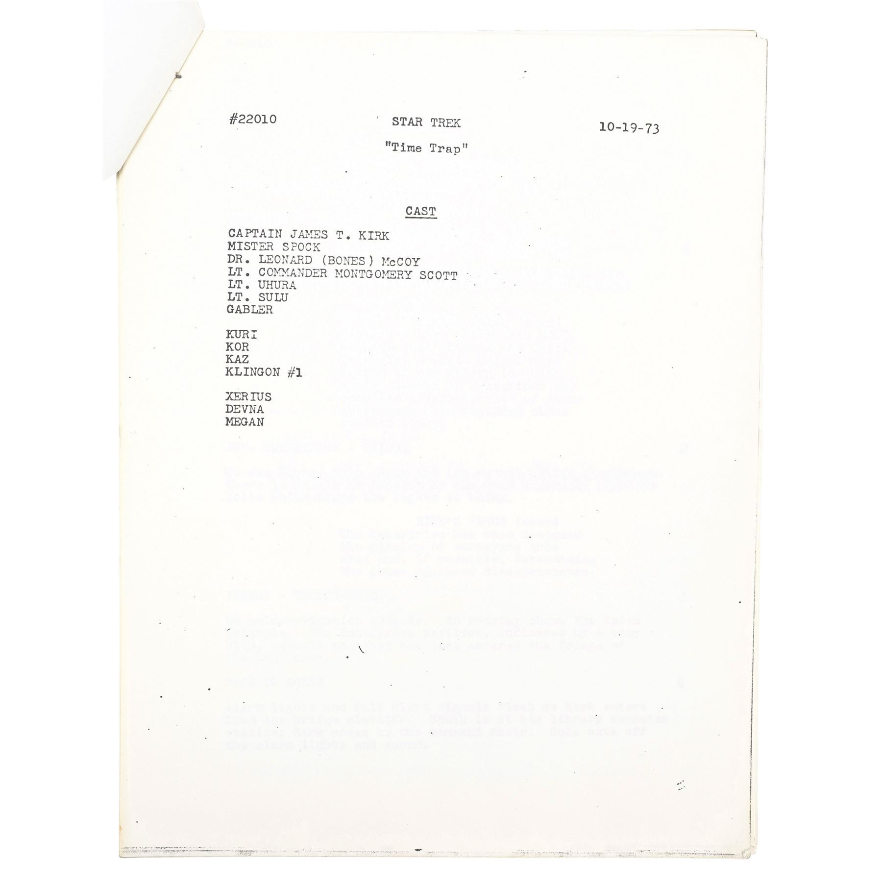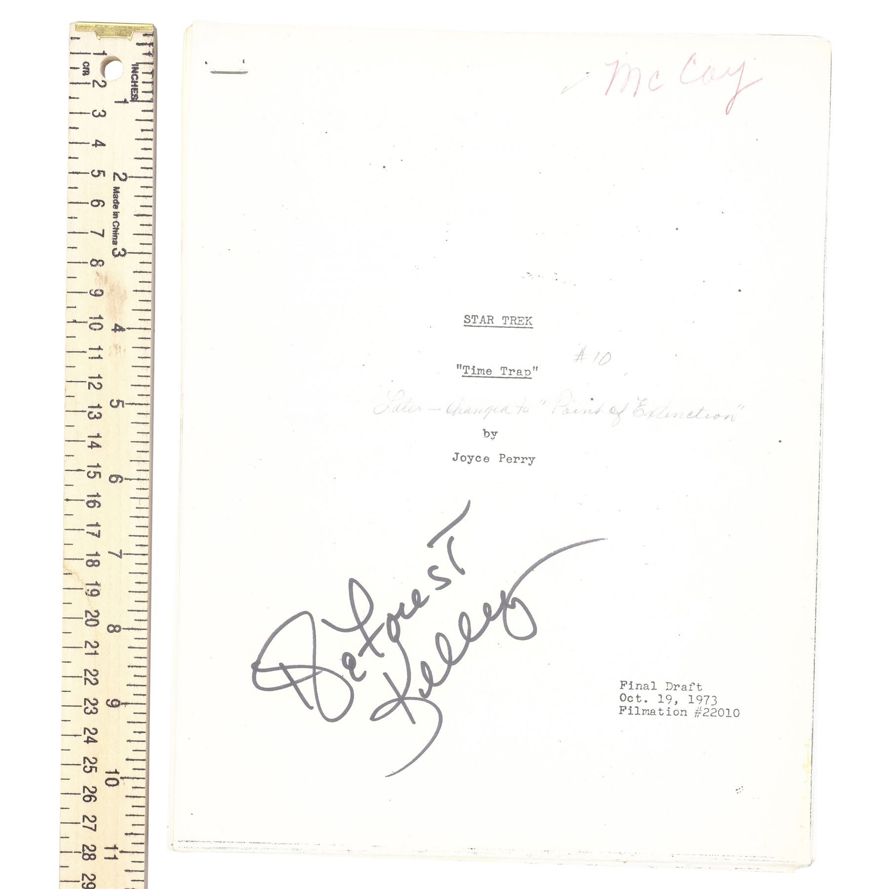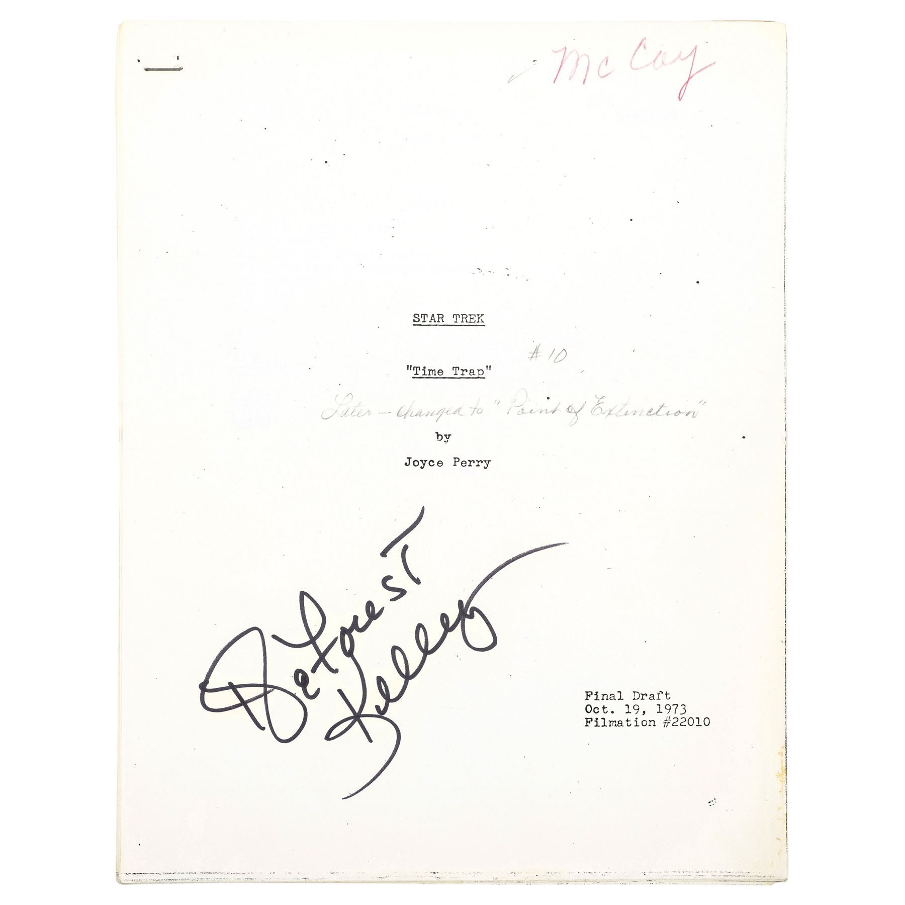 STAR TREK: THE ANIMATED SERIES (1973-1974) - DeForest Kelley's Signed Personal "Time Trap" Final Draft Script - DeForest Kelley's signed personal final draft script from the Season 1 episode "Time Trap" of the animated sci-fi series Star Trek: The Animated Series. Printed by production company Filmation, this stapled, 42-page final draft script is numbered "Filmation 22010," dated "Oct. 19, 1973," hand-marked "McCoy," and signed in black marker by Kelley on its title page. It is hand-marked "#10" and "Later changed to 'Point of Extinction,' " in graphite, referring to an unproduced episode title. The script exhibits staple holes, corner creasing, and edge wear throughout. Dimensions: 8.5" x 11" x 0.5" (21.75 cm x 28 cm x 1.5 cm)