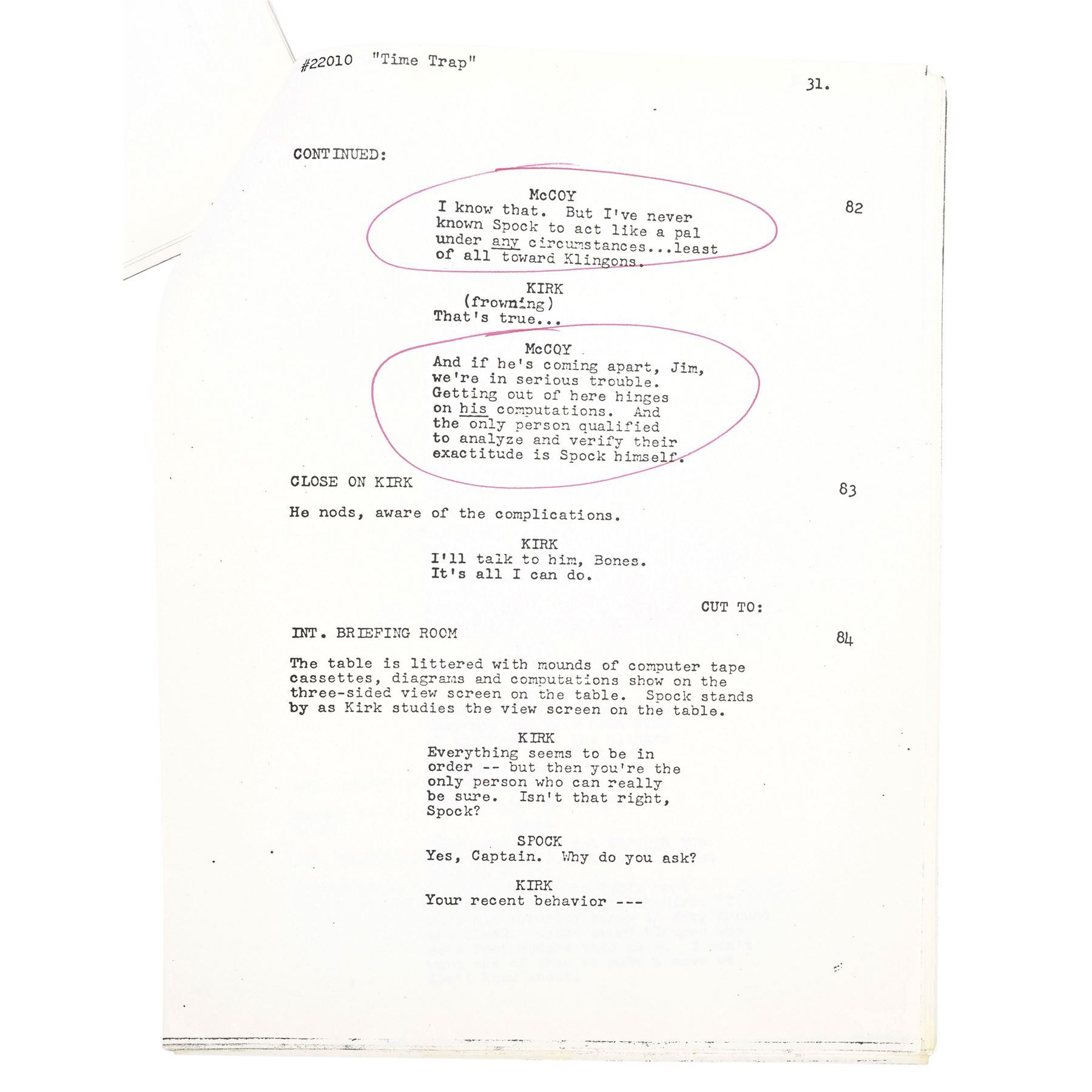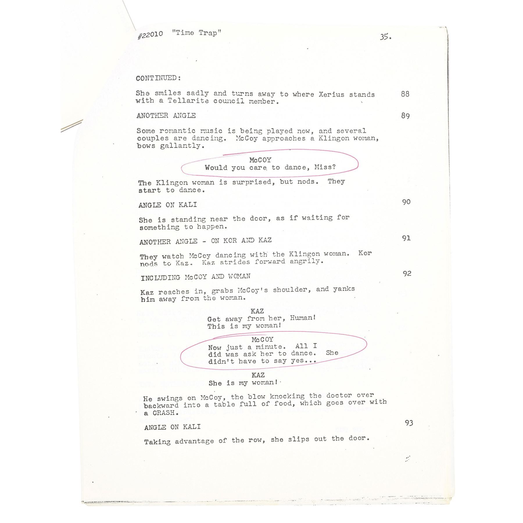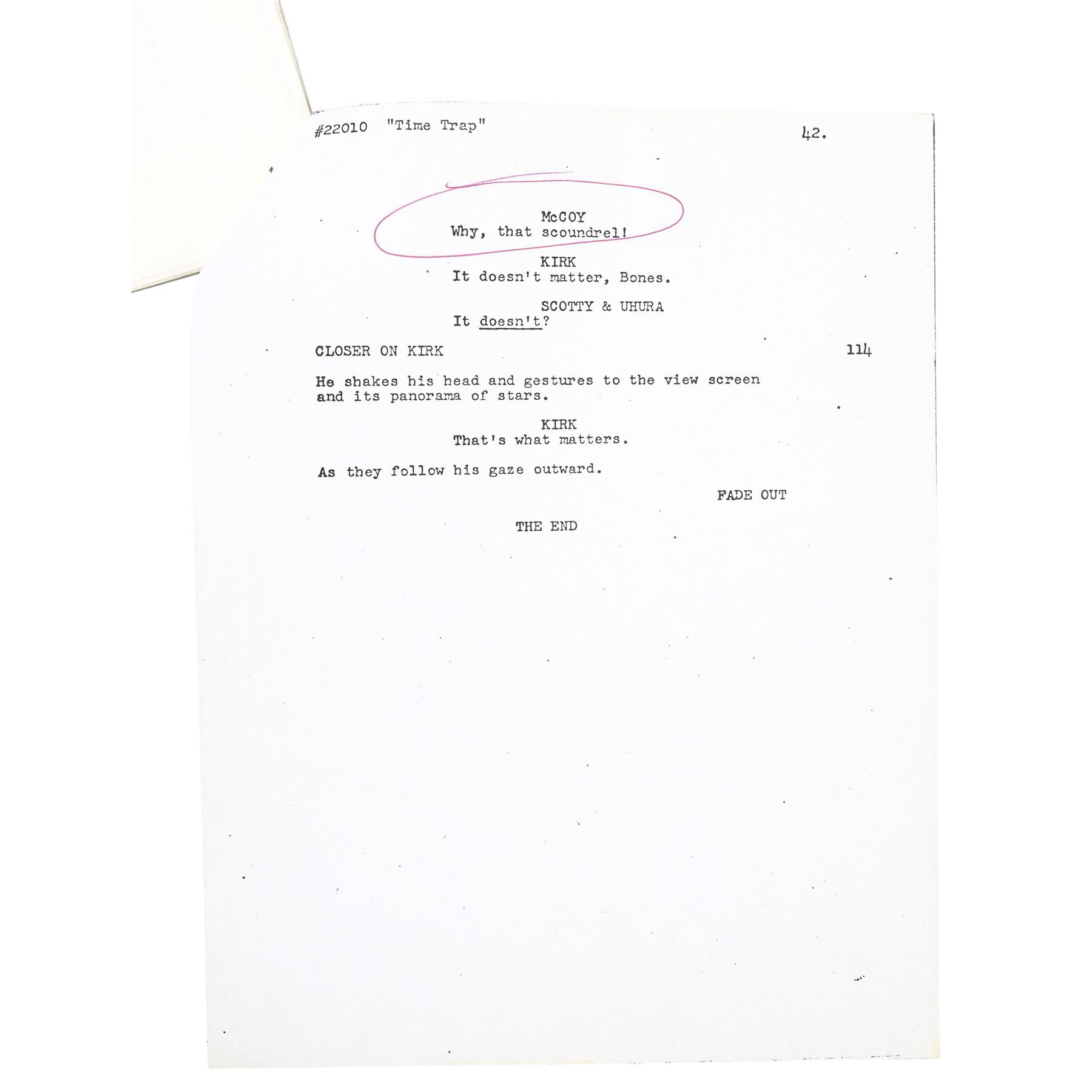 STAR TREK: THE ANIMATED SERIES (1973-1974) - DeForest Kelley's Signed Personal "Time Trap" Final Draft Script - DeForest Kelley's signed personal final draft script from the Season 1 episode "Time Trap" of the animated sci-fi series Star Trek: The Animated Series. Printed by production company Filmation, this stapled, 42-page final draft script is numbered "Filmation 22010," dated "Oct. 19, 1973," hand-marked "McCoy," and signed in black marker by Kelley on its title page. It is hand-marked "#10" and "Later changed to 'Point of Extinction,' " in graphite, referring to an unproduced episode title. The script exhibits staple holes, corner creasing, and edge wear throughout. Dimensions: 8.5" x 11" x 0.5" (21.75 cm x 28 cm x 1.5 cm)