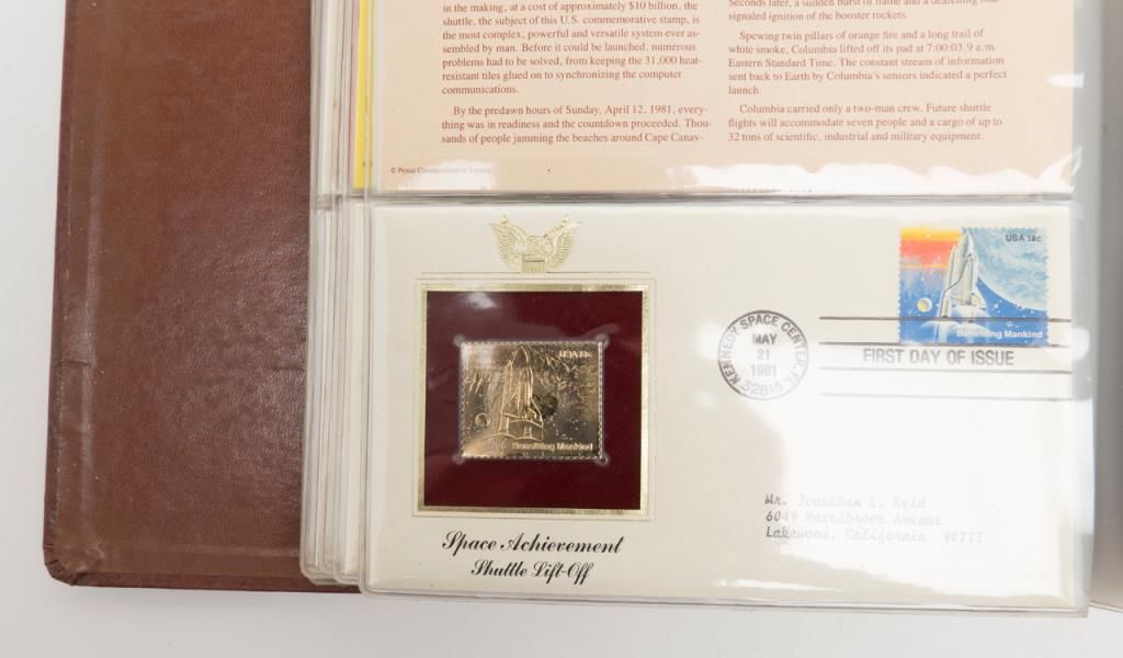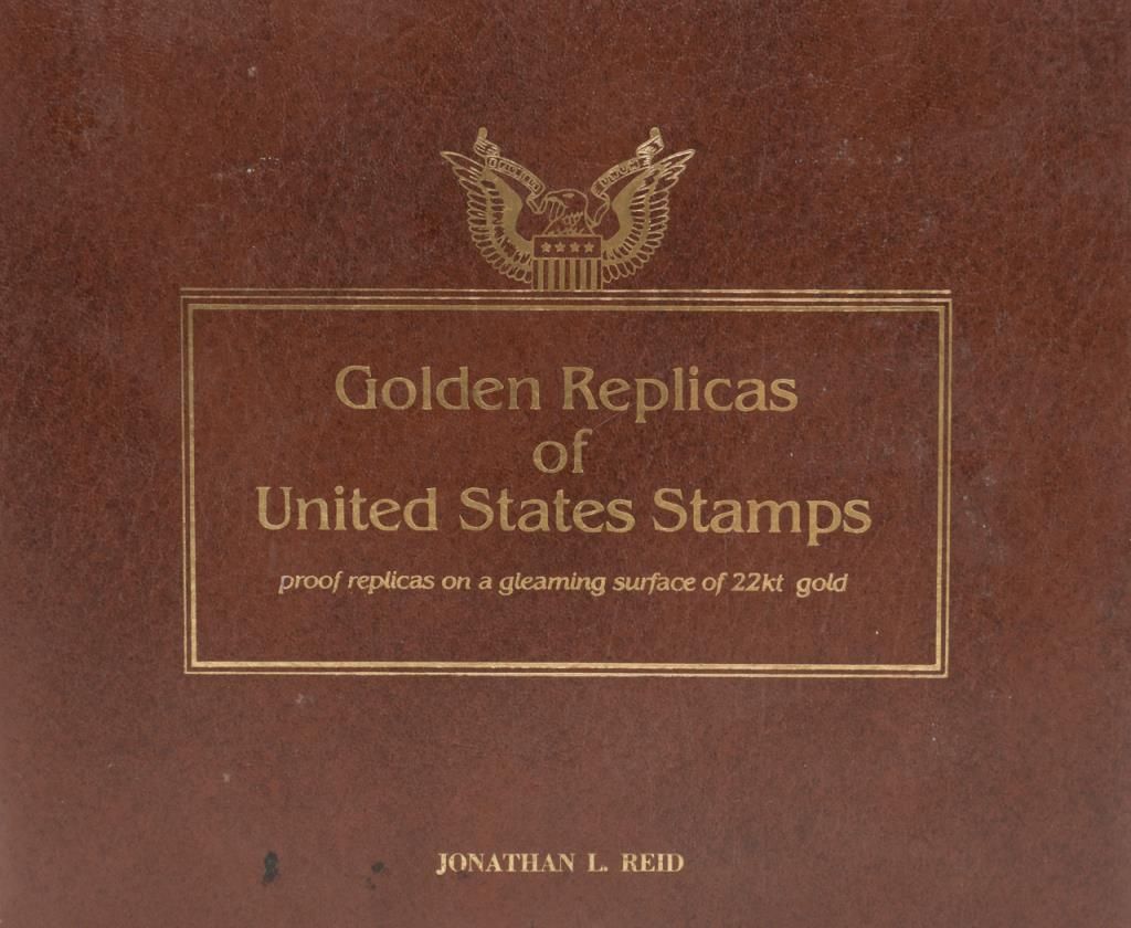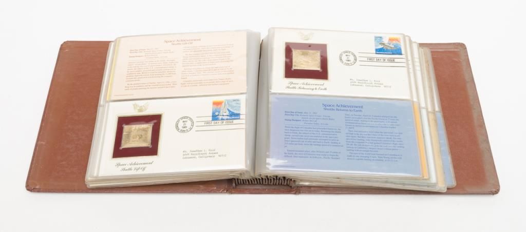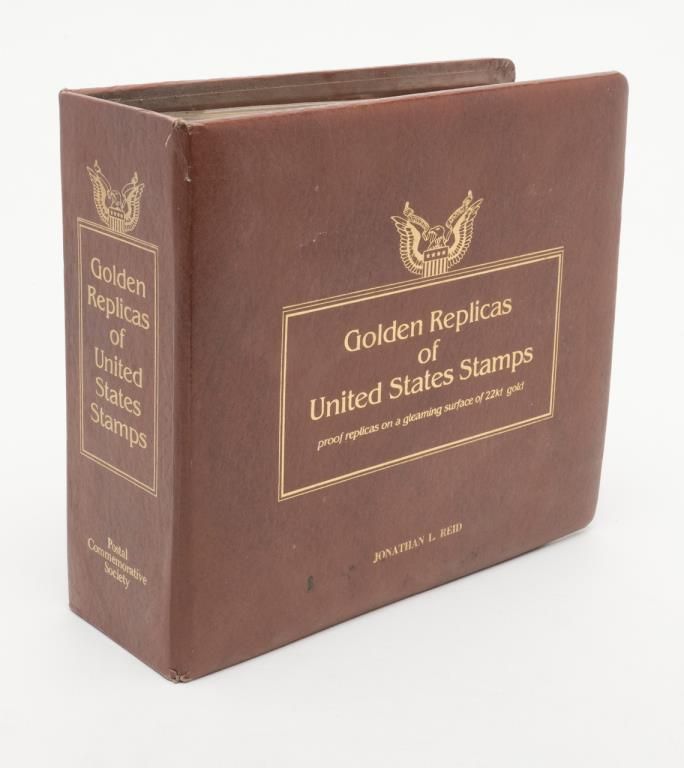 Lot 1232 (14JAM-8): Leather binder of Golden Replicas of United States Commemorative Stamps including 41 total of the 22kt Gold Replica Stamps and their corresponding Commemorative First Day of Issue stamps on cancelled envelopes withhistorical summaries. Est.: $200-$400.
