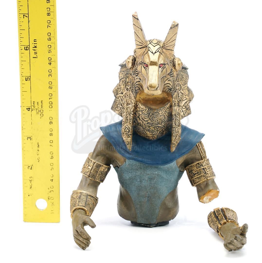 This lot will be auctioned on Thursday, July 1st. The auction will begin at 9:00am PDT and lots are sold sequentially via live auctioneer; tune in to the live streaming broadcast on auction day to follow the pace. Note other lots in the auction may close on June 29th or June 30th. An Egyptian Anubis figure from Roland Emmerich's sci-fi adventure Stargate. Anubis (Carlos Lauchu) wore headdress armor protecting Ra (Jaye Davidson) from a military team from Earth. This detailed resin figure features the character's torso with a blue tunic accent as well as gold-color armor accents on the arms and wrist and a full gold-color armor headdress. This figure is in fair overall condition with visible signs of age and wear, including full separation of the left arm at the elbow and a missing tip of one of the ear accents on the helmet. Dimensions: 5" x 5" x 7.5" (12.75 cm x 12.75 cm x 19 cm) Estimate: $800 - 1,200