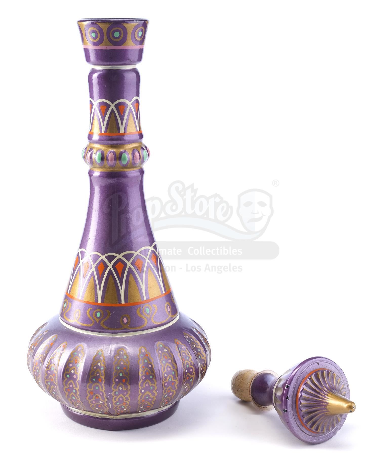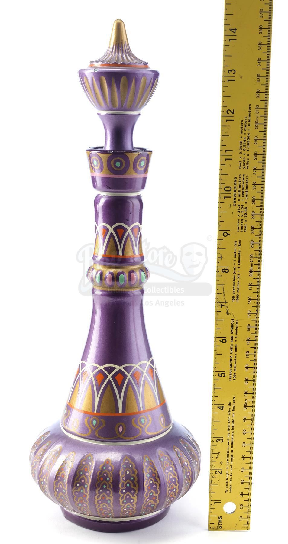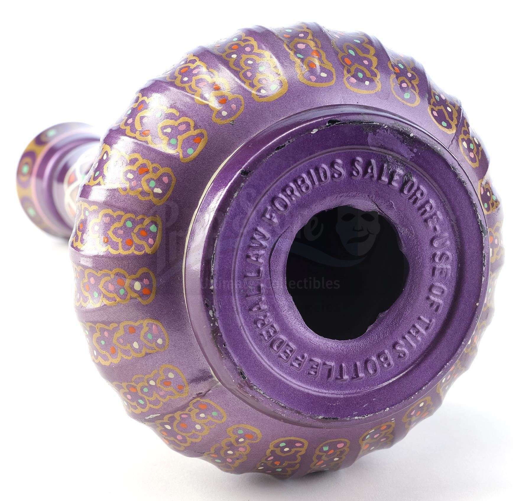 This lot will be auctioned on Tuesday, June 29th. The auction will begin at 9:00am PDT and lots are sold sequentially via live auctioneer; tune in to the live streaming broadcast on auction day to follow the pace. Note other lots in the auction may close on June 30th or July 1st. Jeannie's bottle from Seasons 2 through 5 of Sidney Sheldon's fantasy sitcom I Dream of Jeannie. Jeannie (Barbara Eden) is released from 2,000 years of imprisonment when her bottle is uncorked by astronaut Anthony Nelson (Larry Hagman) when his space capsule strays off course and he is marooned on a desert island. This bottle comes directly from the family of Clarence Peet, a 36-year prop master for Columbia Pictures, the parent company of Screen Gems, the television production subsidiary that produced I Dream of Jeannie. It includes a Letter of Authenticity from Peet's granddaughter. The lot consists of a glass 1964 Beam's Choice bourbon Christmas Decanter/bottle hand-finished in high-gloss enamel paint and with a hole cut in its base. The bottle has been intricately hand-painted with a purple base coat with white, orange, and gold-color details throughout, as well as multicolored specks and a cork and plastic top. The technique and style of the paintwork are consistent with other documented examples of original Jeannie bottles; there are subtle differences in the paint detailing to these other examples and the specific use of this bottle is unknown. While Jeannie bottles were made from modified real-world artifacts and many copies exist, this bottle's authenticity is established through the provenance attribution with Clarence Peet and the similarities to the other existing bottles. A prior version of this description cited that the bottle was used for SFX smoke effects and specifically attributed it to episode 2 of season 2; additional examination has determined this cannot be verified. However, the piece has been examined by I Dream of Jeannie historian Patterson Lundquist who agrees it is an original prop produced by the Columbia Prop Department. It exhibits signs of age and wear throughout, including minor paint chipping, but remains in excellent overall condition. Dimensions: 14" x 5" x 5" (37 cm x 12.75 cm x 12.75 cm) Estimate: $30,000 - 50,000